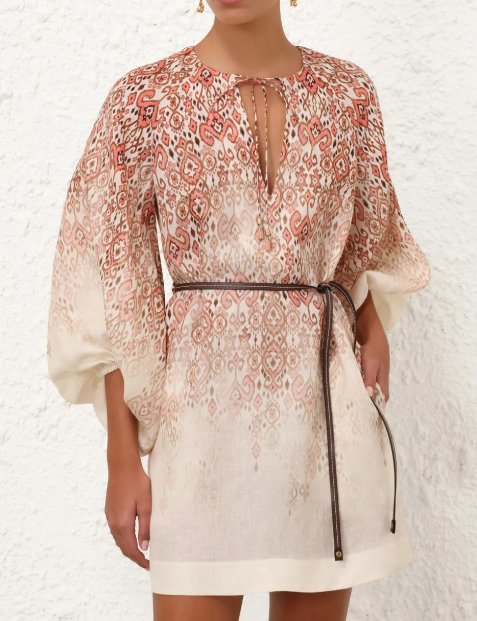 The Wylie Mini Dress in Peach Ikat from our Resort Swim 2025 Collection. A linen long sleeve mini dress featuring self tie V-neckline and elasticated raglan sleeves.