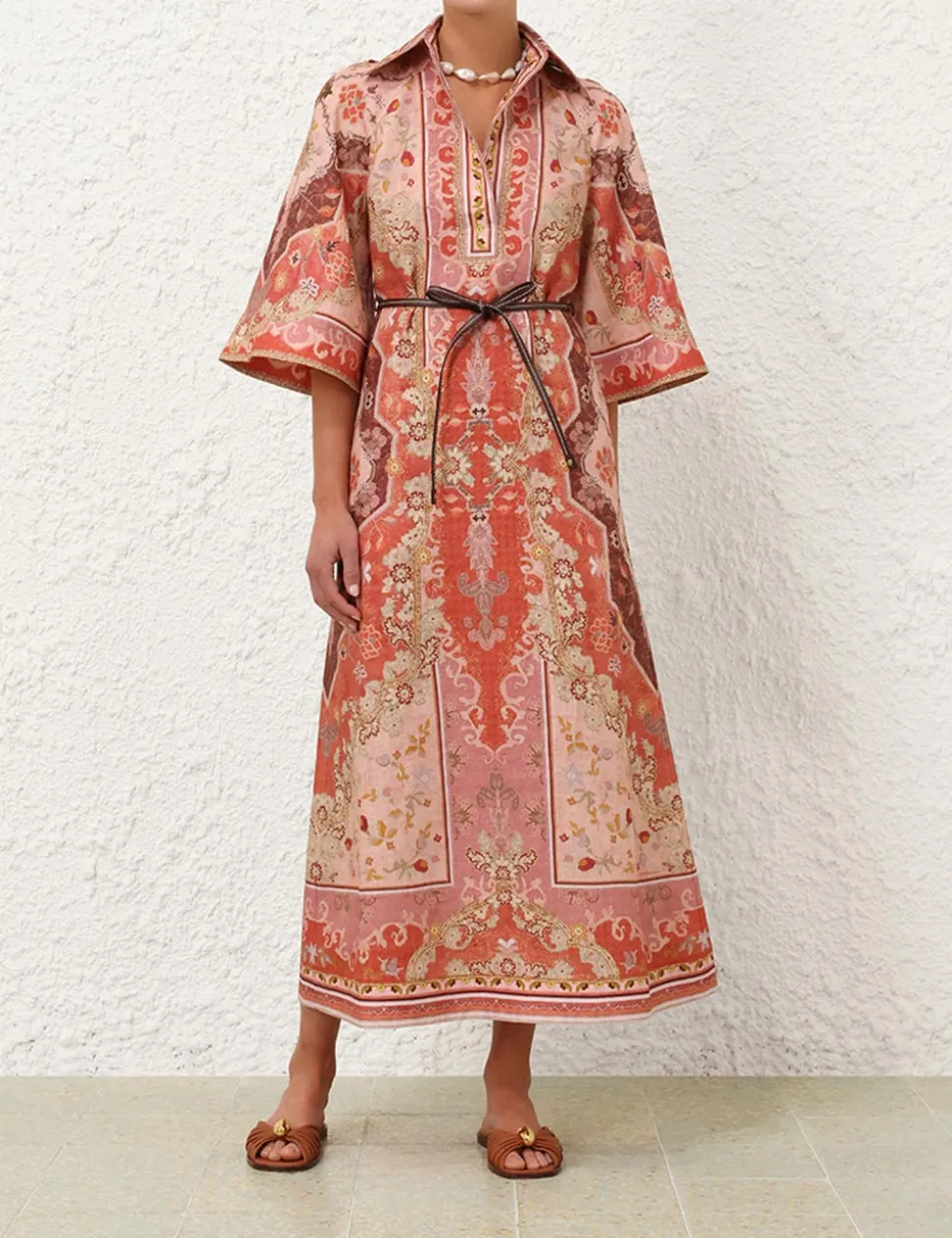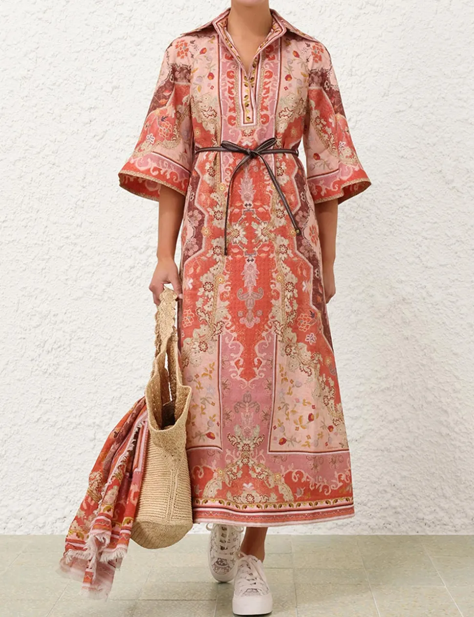 The Wylie Tunic Midi Dress in Rust Multi from our Resort Swim 2025 Collection. A linen tunic midi dress featuring a deep V-neckline, wide sleeves and placement print throughout.
