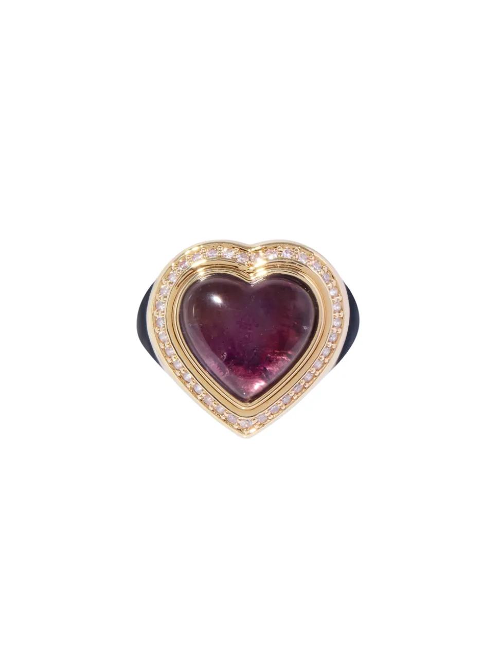 The Zimmermann Adore Ring in Gold from our Resort 2025 Collection, Crush. A gold plated ring featuring a statement heart shape detailing with custom cut purple amethyst stone in the centre.