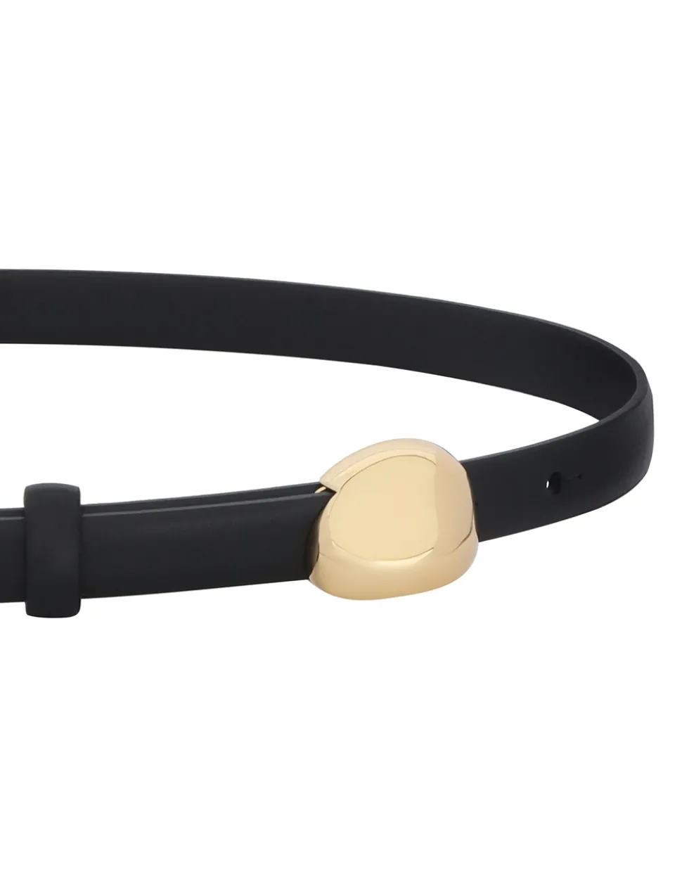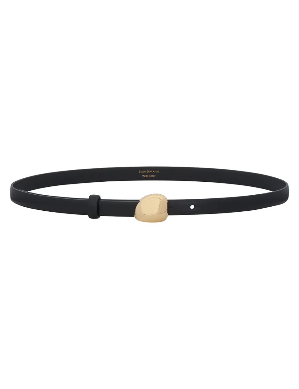 The Zimmermann Gleam Belt 15 in Black from our Fall 2024 Collection, In Illustration. A skinny leather belt featuring a statement gold pebble hardware.