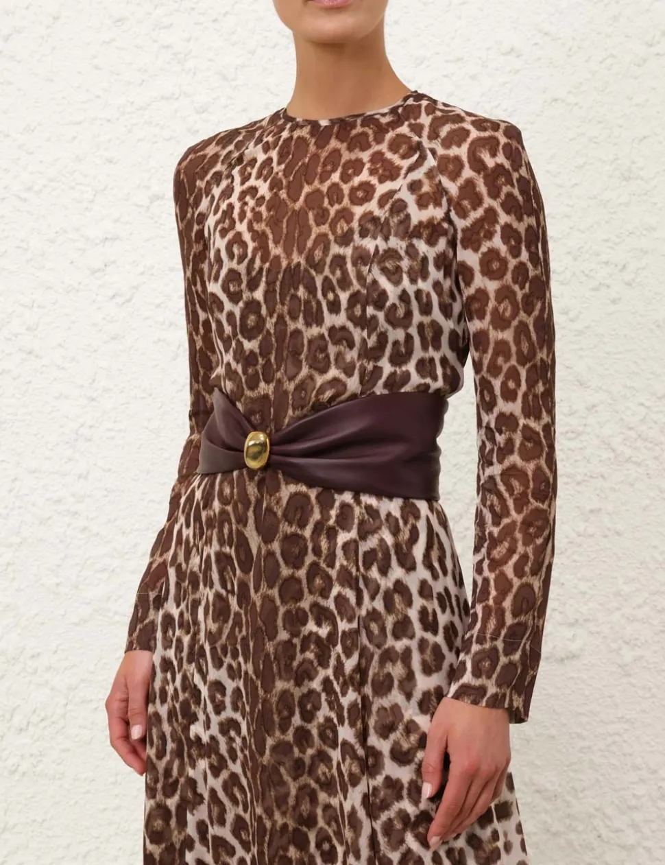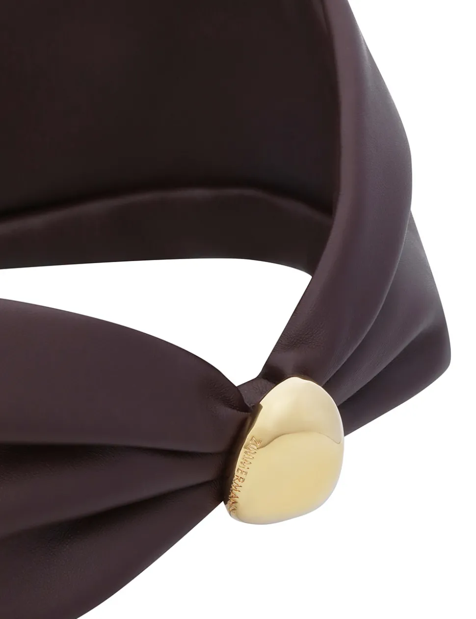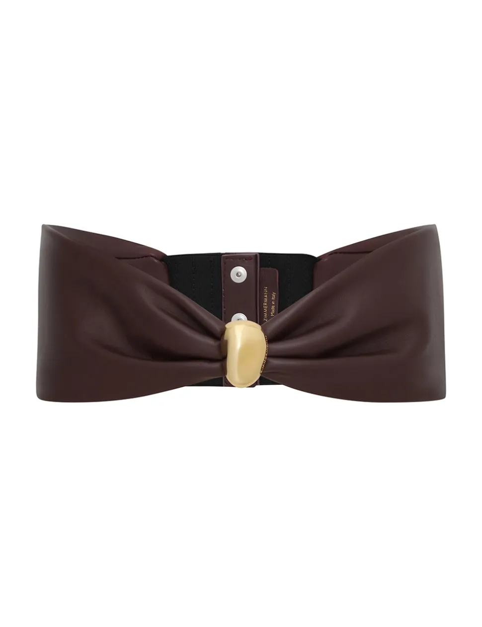 The Zimmermann Gleam Belt 80 in Mahogany from our Fall 2024 Collection, In Illustration. A wide leather belt featuring a statement gold pebble hardware.