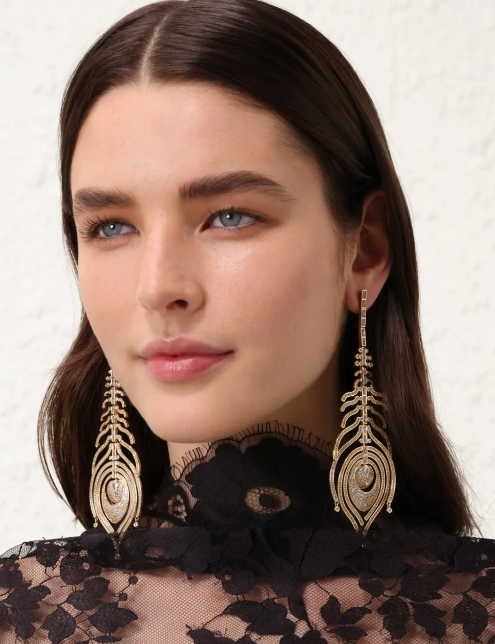 The Zimmermann Muse Chandeliers in Gold from our Fall 2024 Collection, In Illustration. A gold plated statement earring featuring white cubic zirconia stones throughout and stud post back .