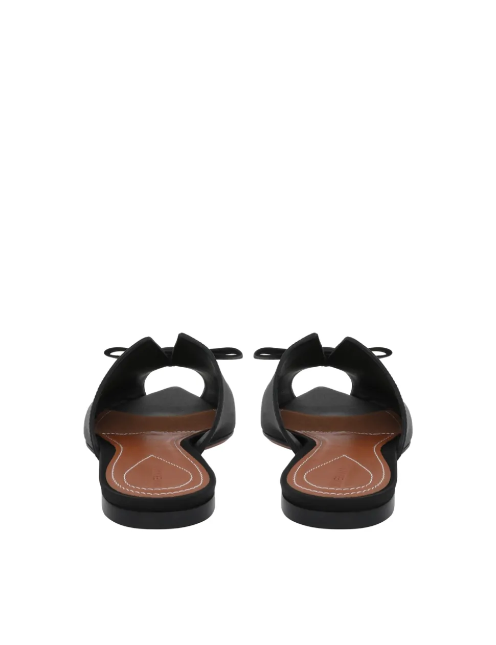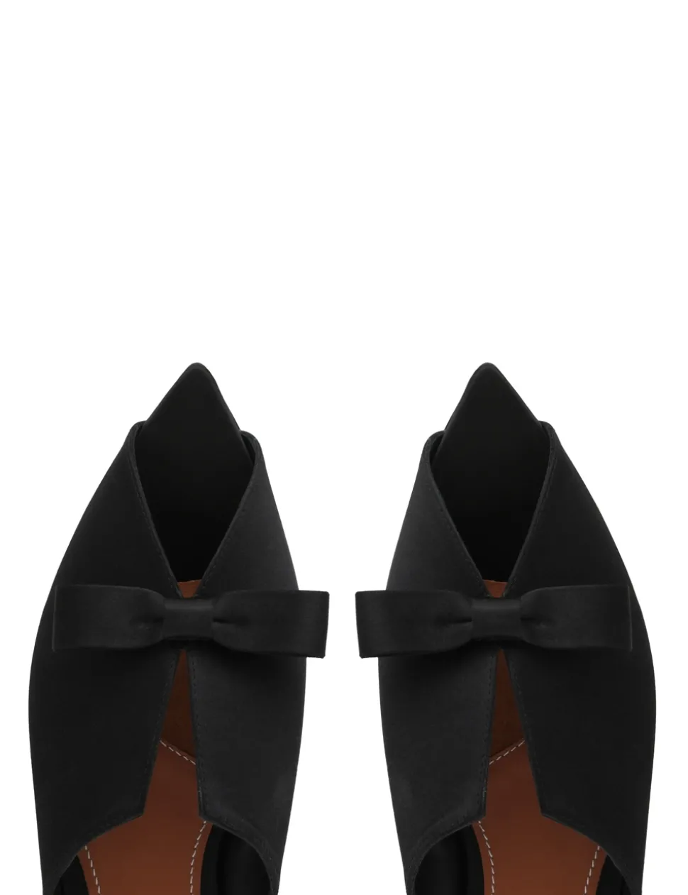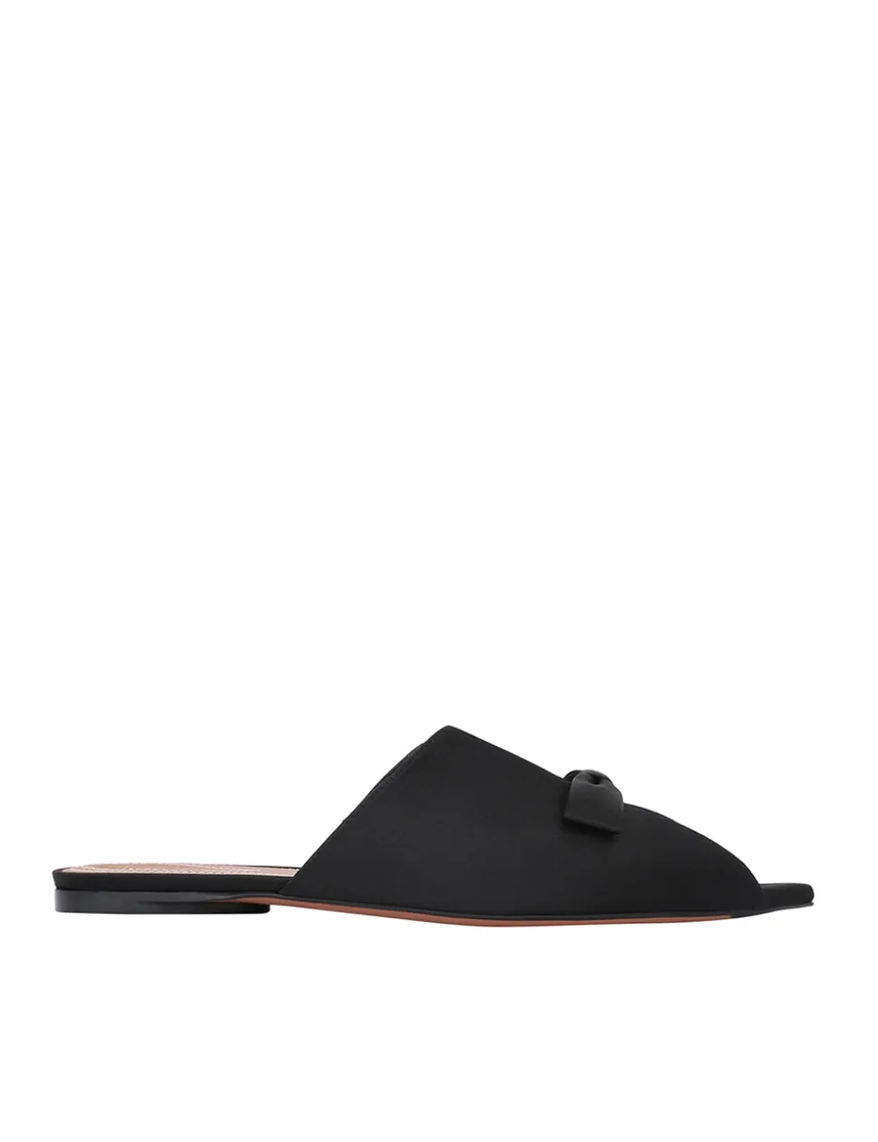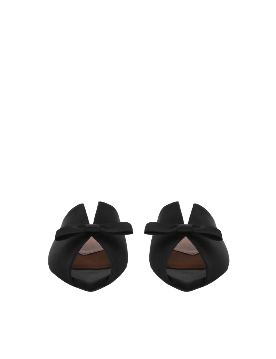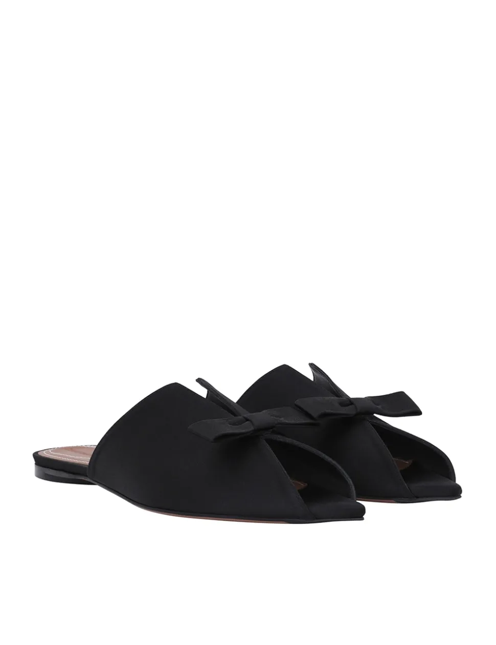 The Zimmermann Tux Mule in Black from our Resort 2025 Collection, Crush. A satin mule featuring a fixed bow detailing at the front shoe.