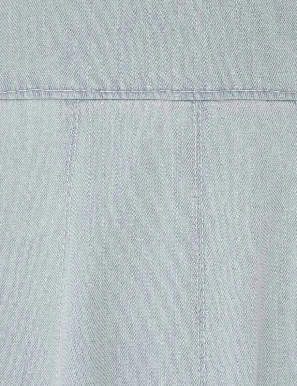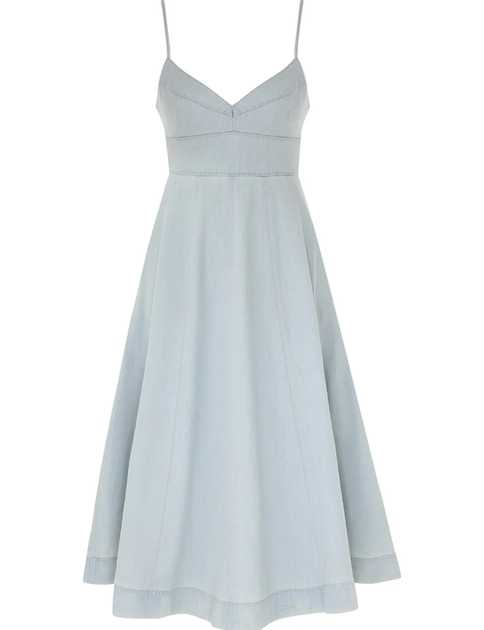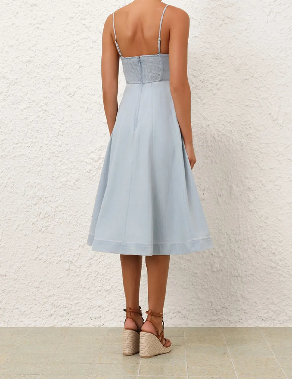 The Acacia Denim Swing Dress in Ice Storm from our Resort Swim 2025 Collection. A denim midi dress featuring a fitted bustier, shirred back bust and adjustable shoulder straps.