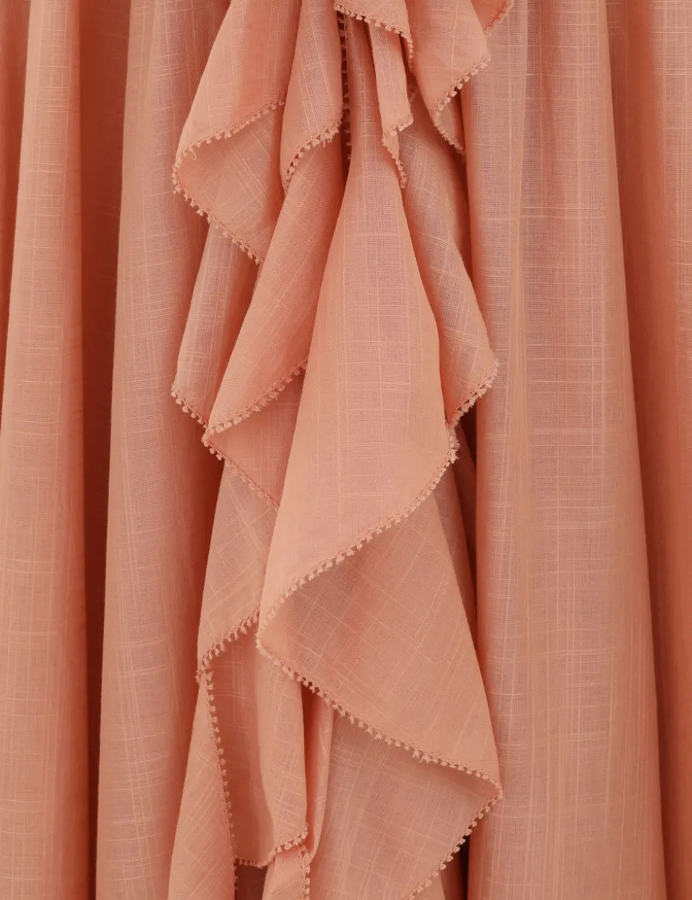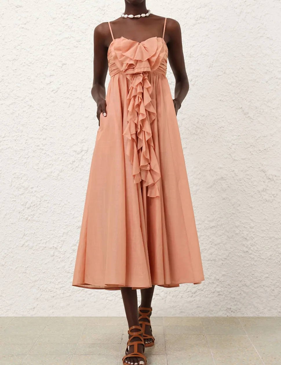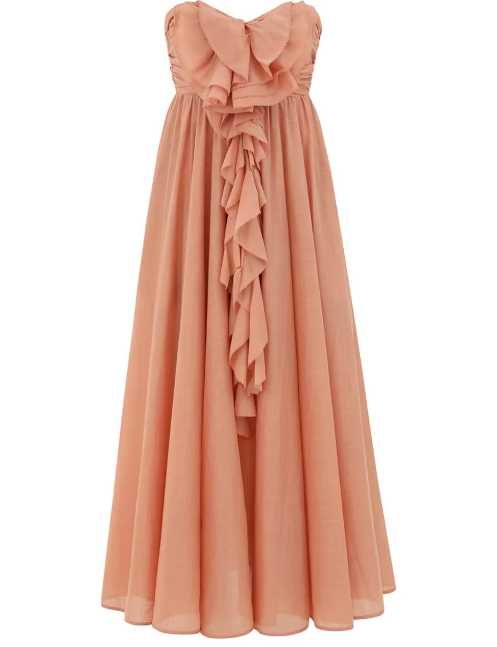 The Acacia Ruffle Maxi Dress in Tan from our Resort Swim 2025 Collection. A cotton maxi dress featuring centre front ruffle detail, shirring at the back and a removable adjustable straps.