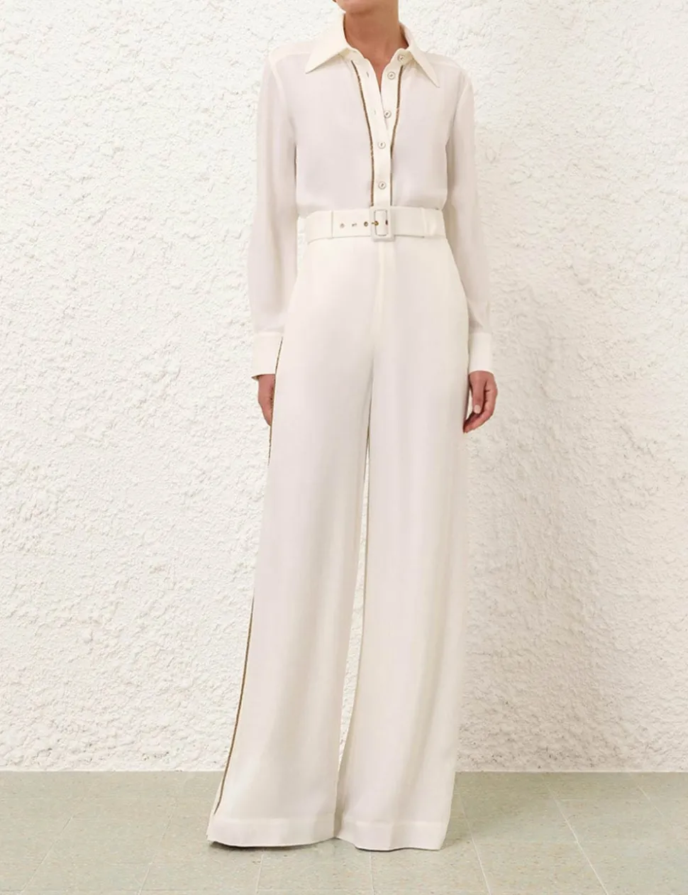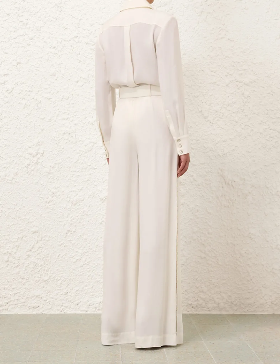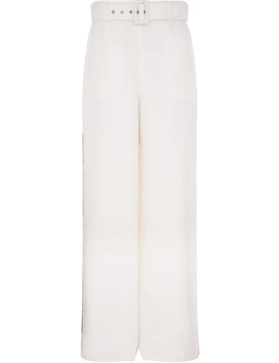 The Belted Chain Pant in Cream from our Fall 2024 Collection, In Illustration. A wide leg pant featuring gold trim, side seam pockets and a self cover buckle belt.