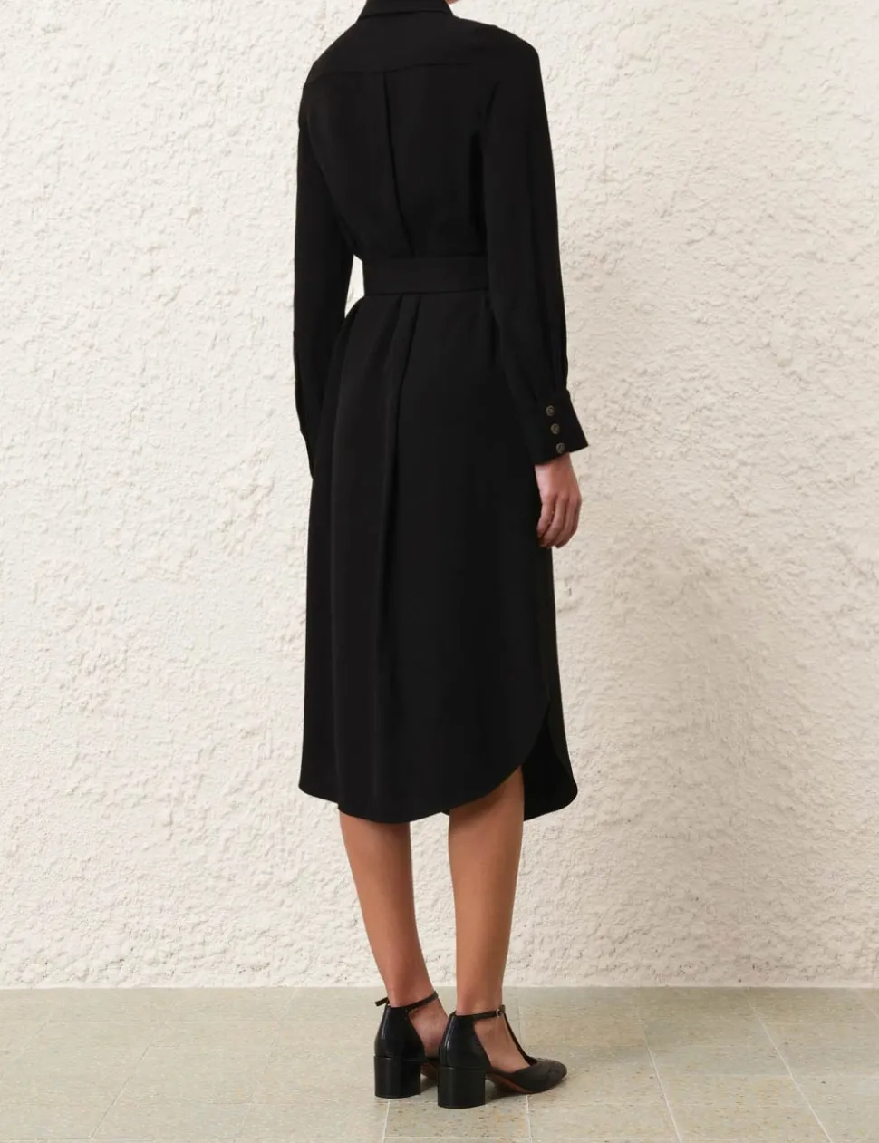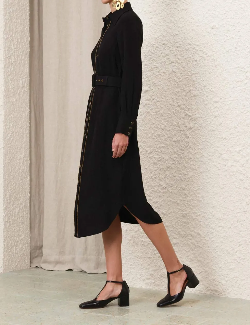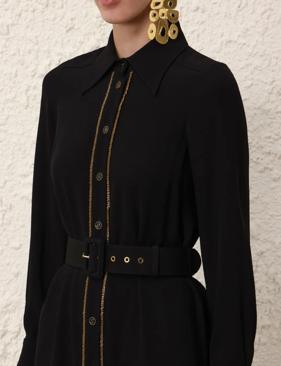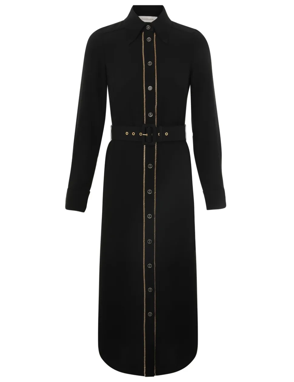 The Chain Midi Dress in Black from our Fall 2024 Collection, In Illustration. A long sleeve midi dress featuring a shirt shaped silhouette, classic collar, buttons down the centre front and a removable buckle belt.