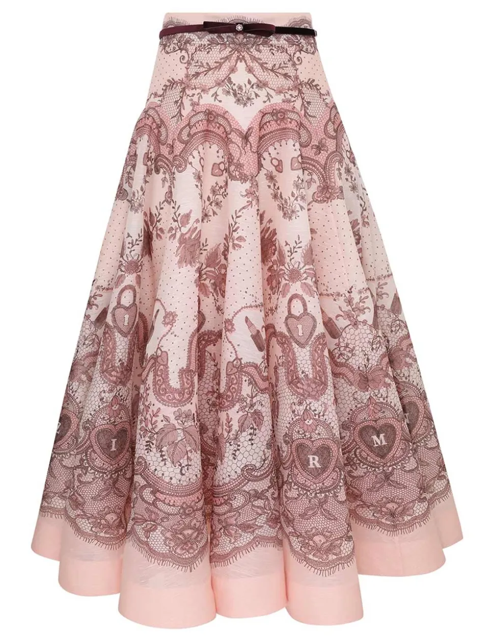 The Crush Flared Midi Skirt in Pink Lace Print from our Resort 2025 Collection, Crush. A silk linen organza midi skirt featuring side seam pockets, a centre back invisible zip and a removable velvet belt with crystal and bow detailing.