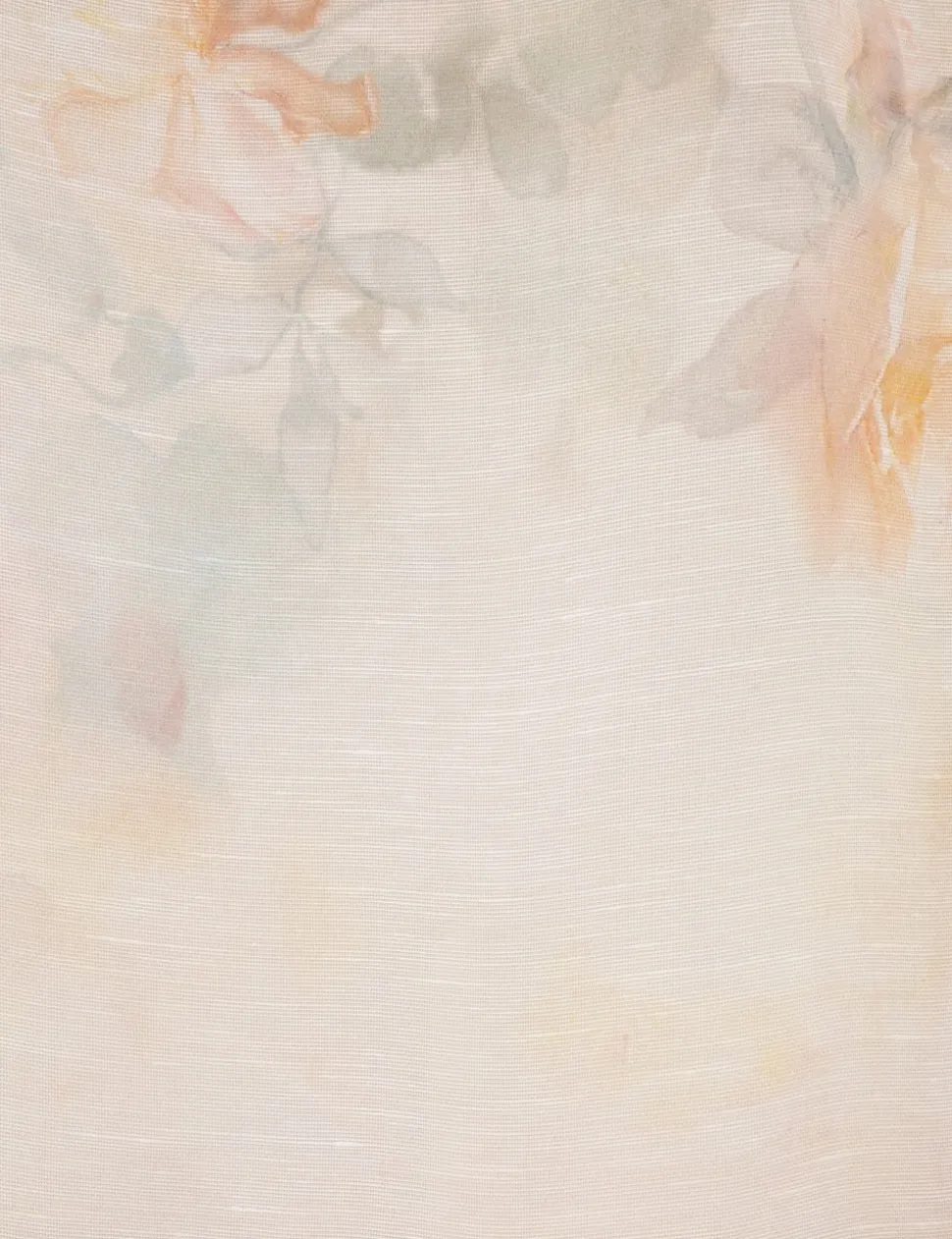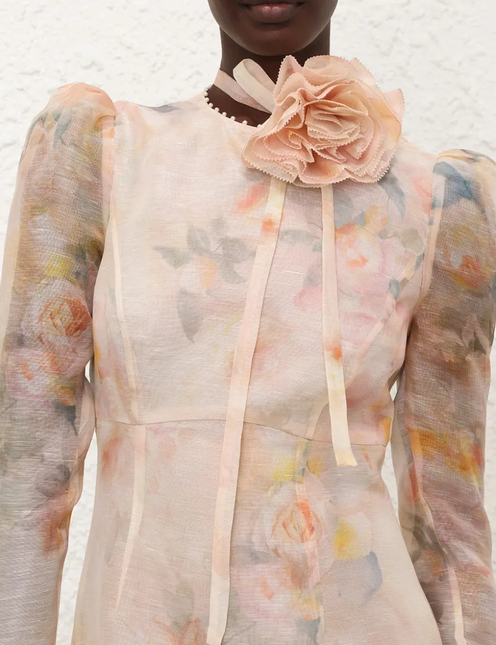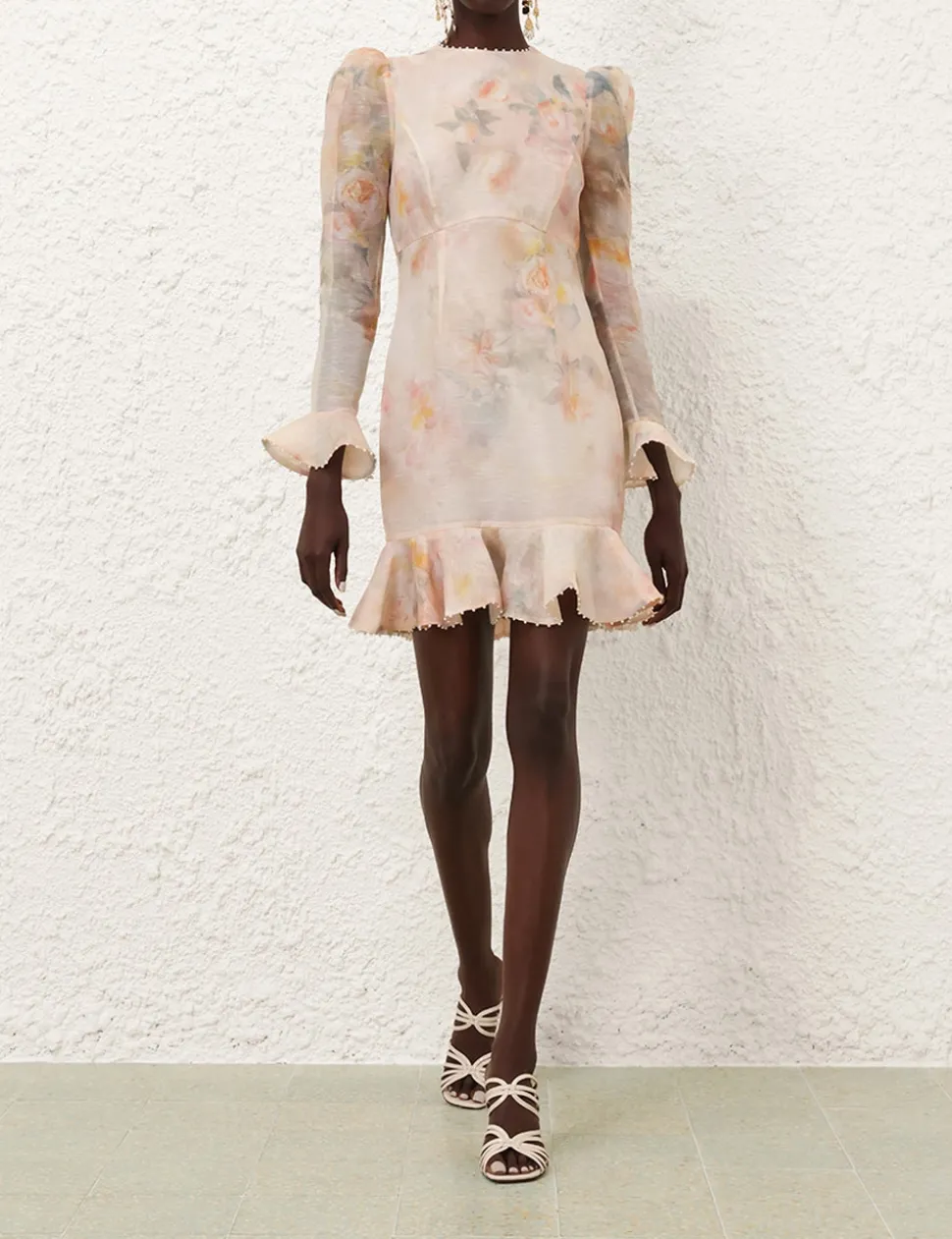 The Crush Flower Mini Dress in Ciara Floral from our Resort 2025 Collection, Crush. A silk linen mini dress featuring frilled detail on hemline and on the cuffs; finished with a detachable ruffle flower brooch.