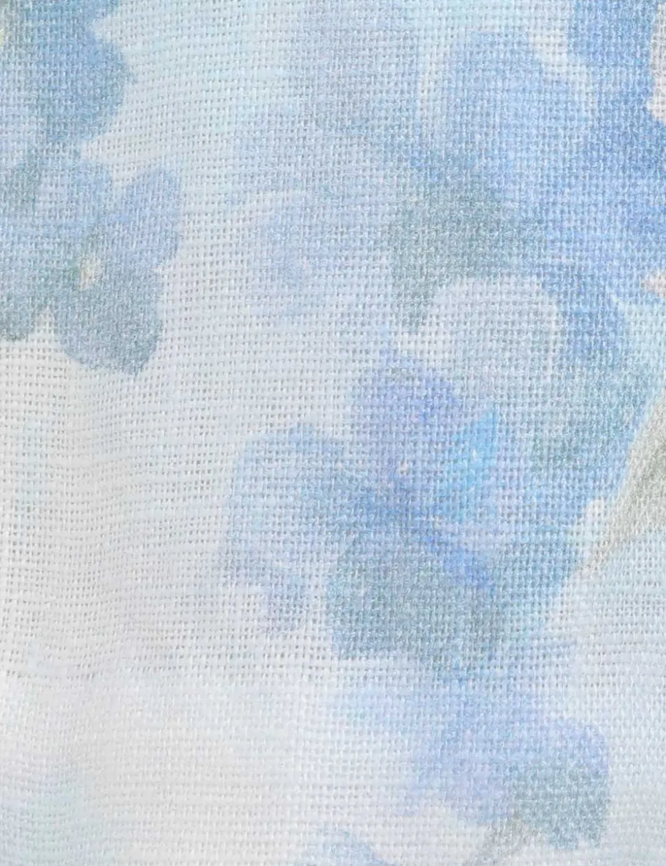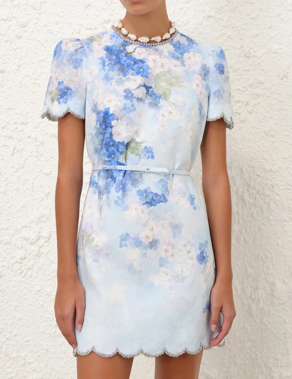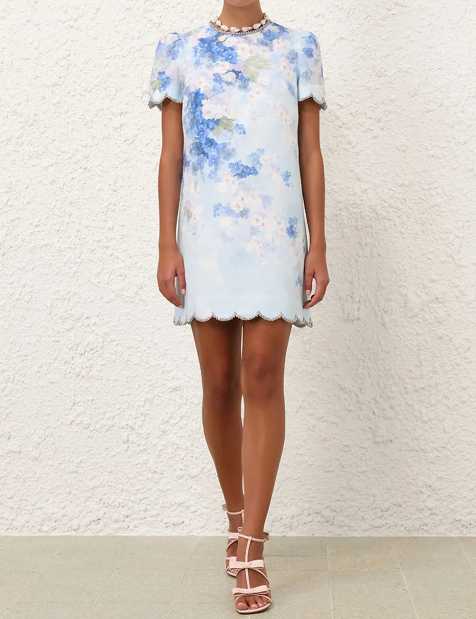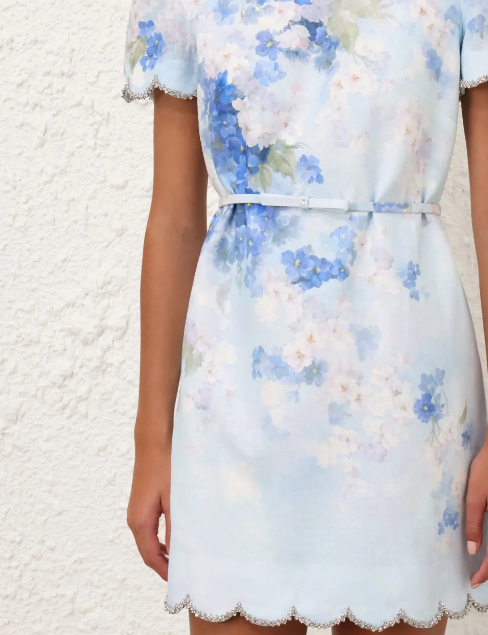 The Crush Scalloped Shift Dress in Blue Floral from our Resort 2025 Collection, Crush. A linen mini dress featuring a placement print with scalloped crystal trims around the sleeves and body hemline, tulle inserted sleeve heads and a centre back invisible zip closure.
