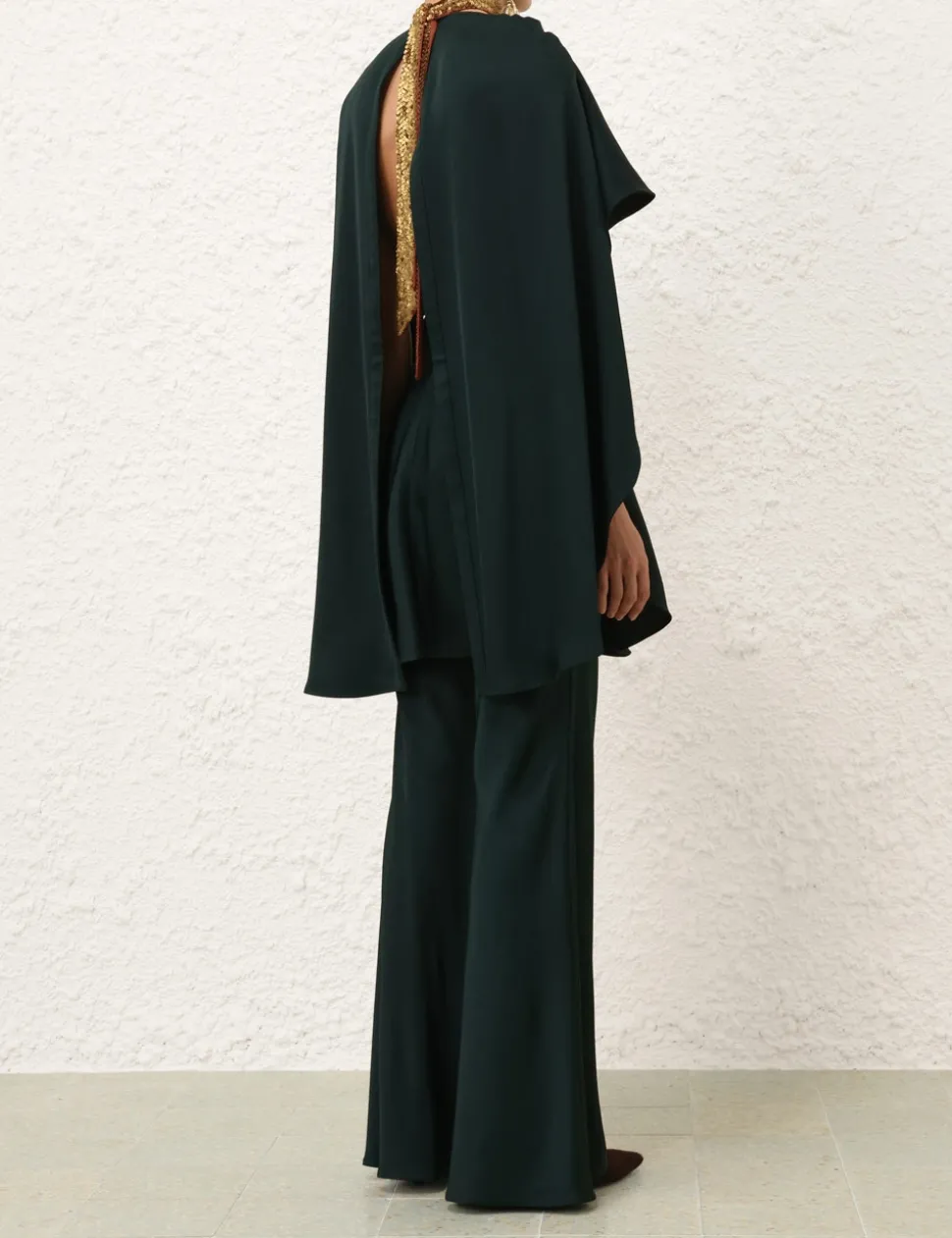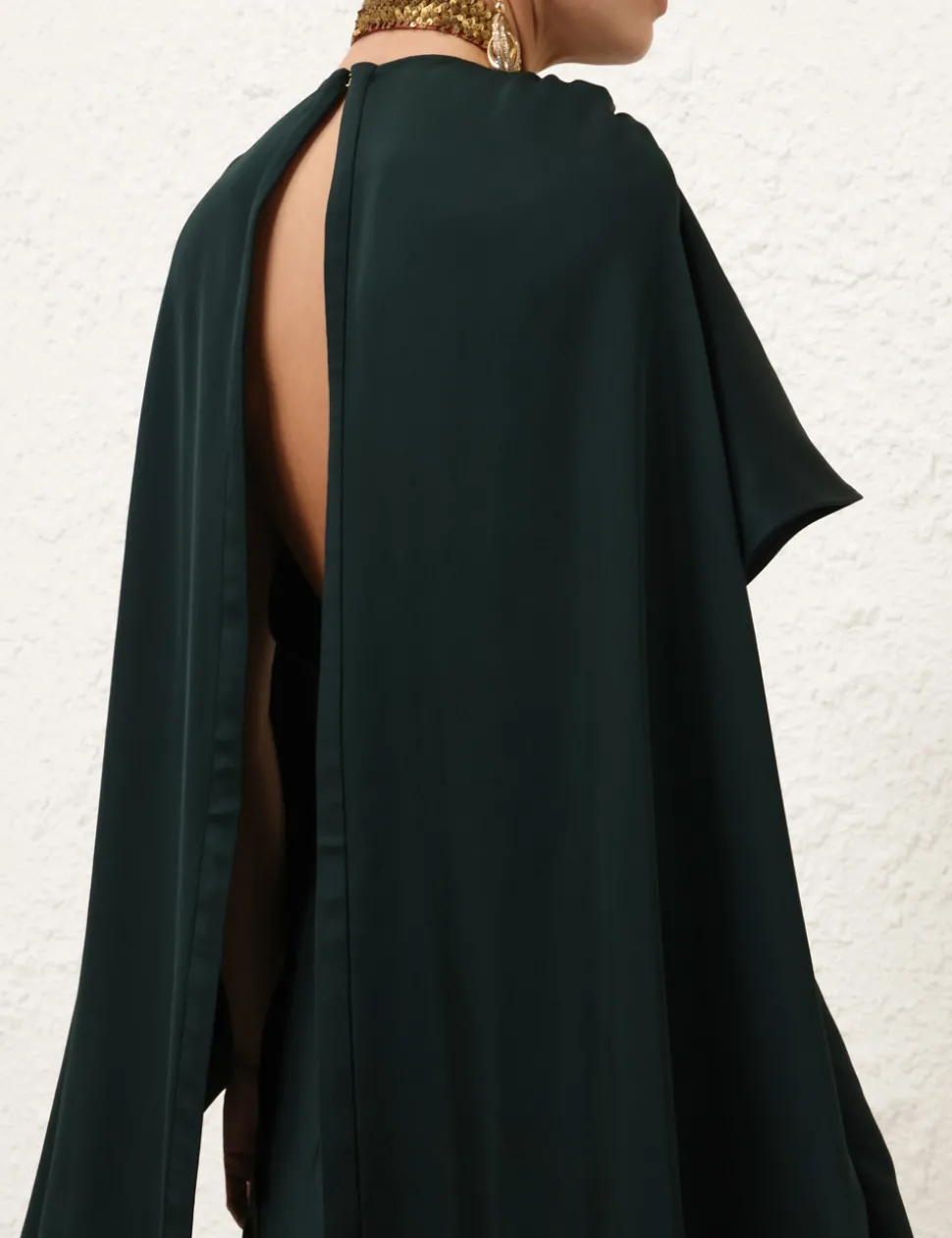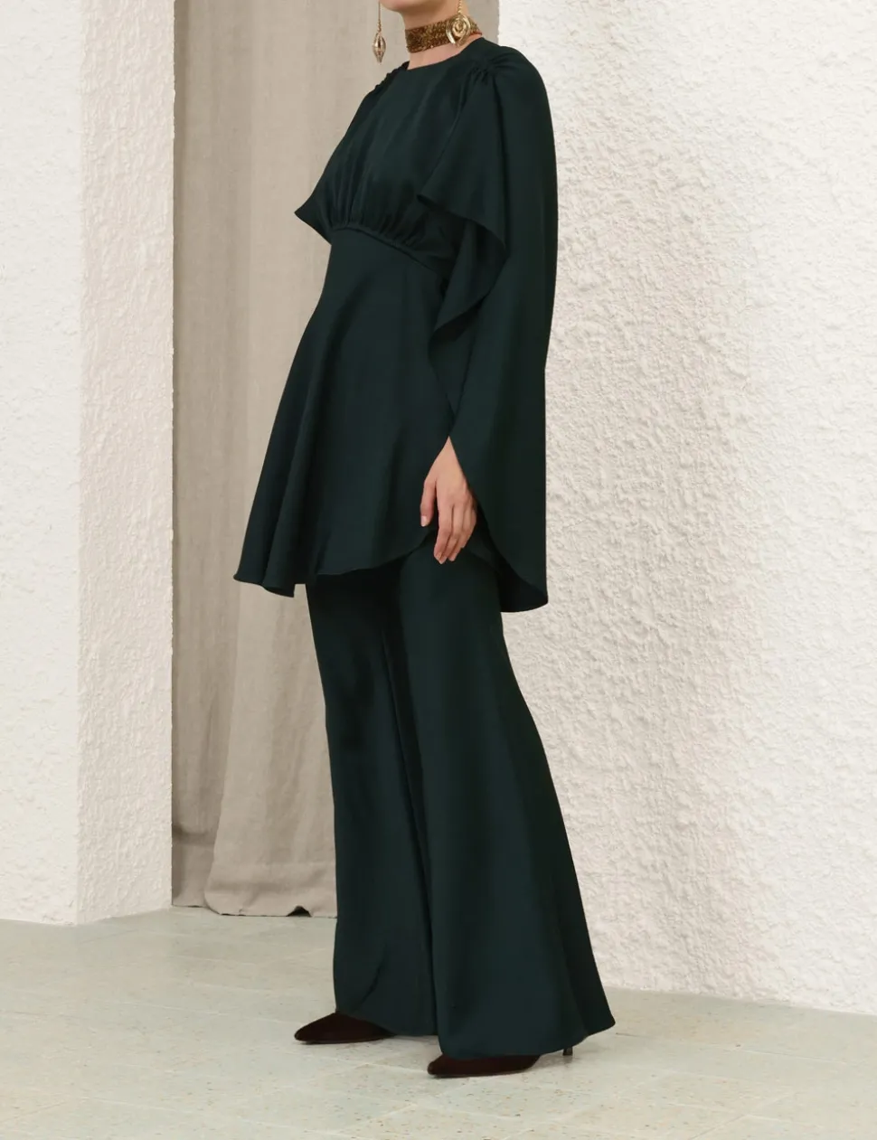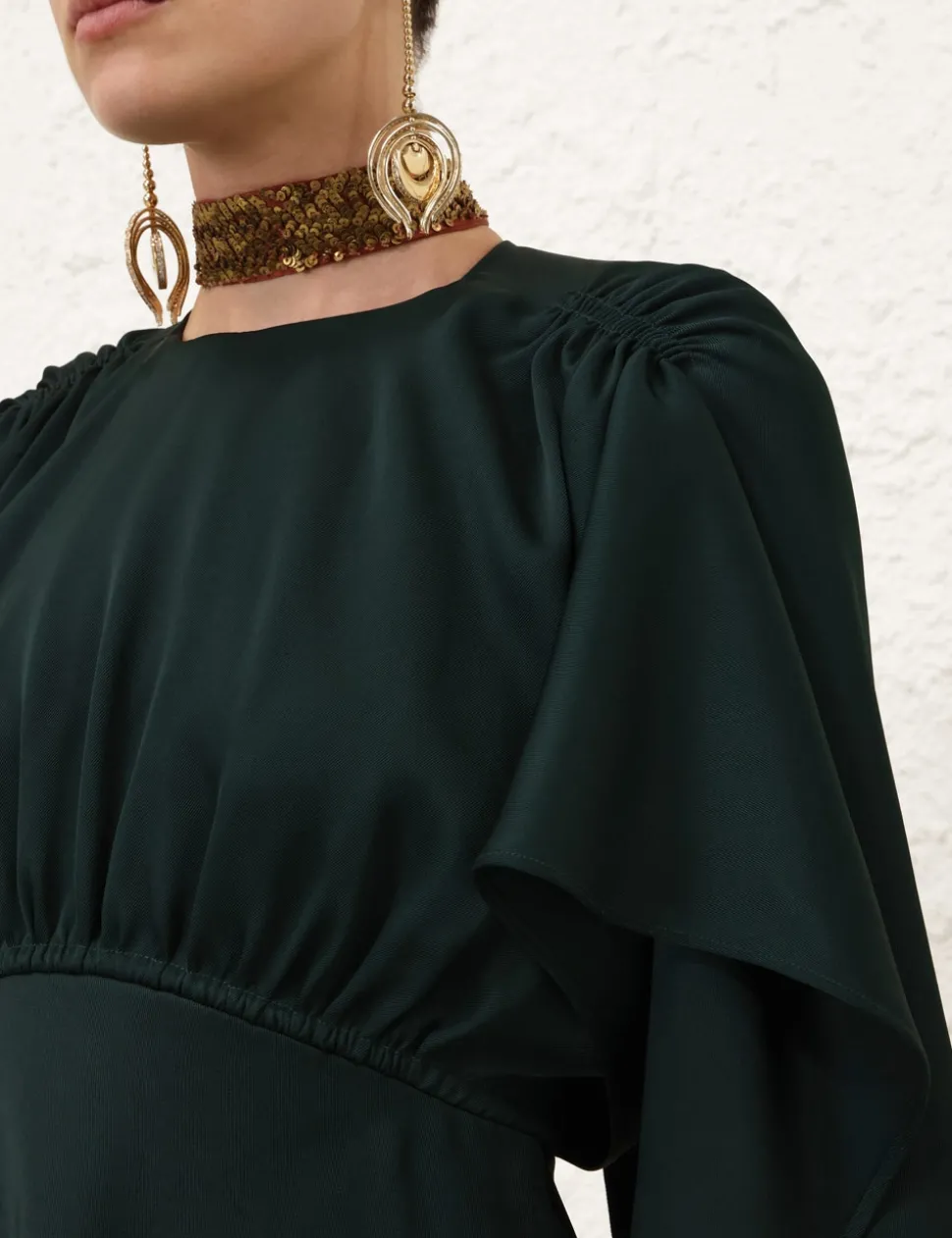 The Eden Cascading Mini Dress in Bottle Green from our Fall 2024 Collection, In Illustration. A mini dress featuring gathered under bust, ruched shoulder detail and cape style sleeves.