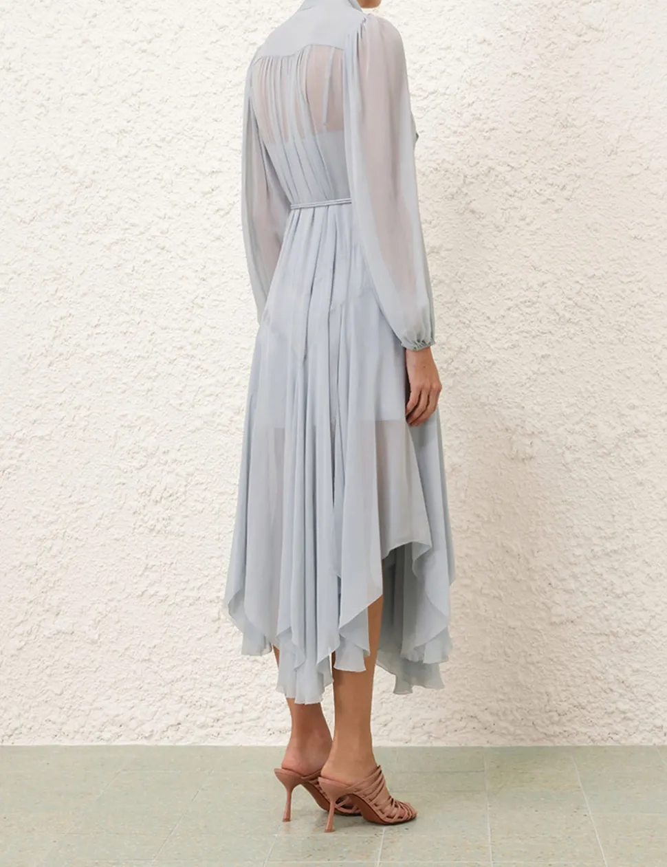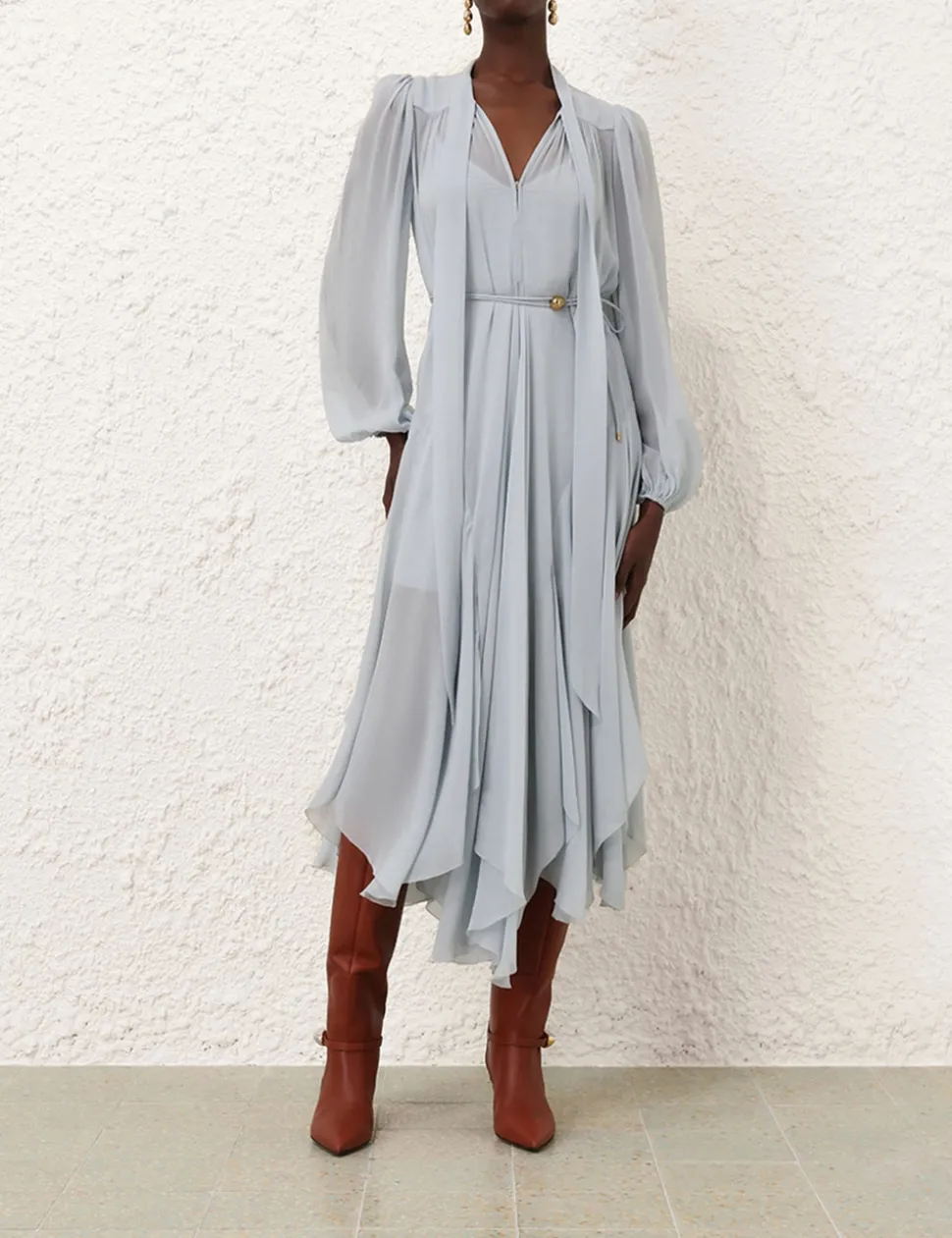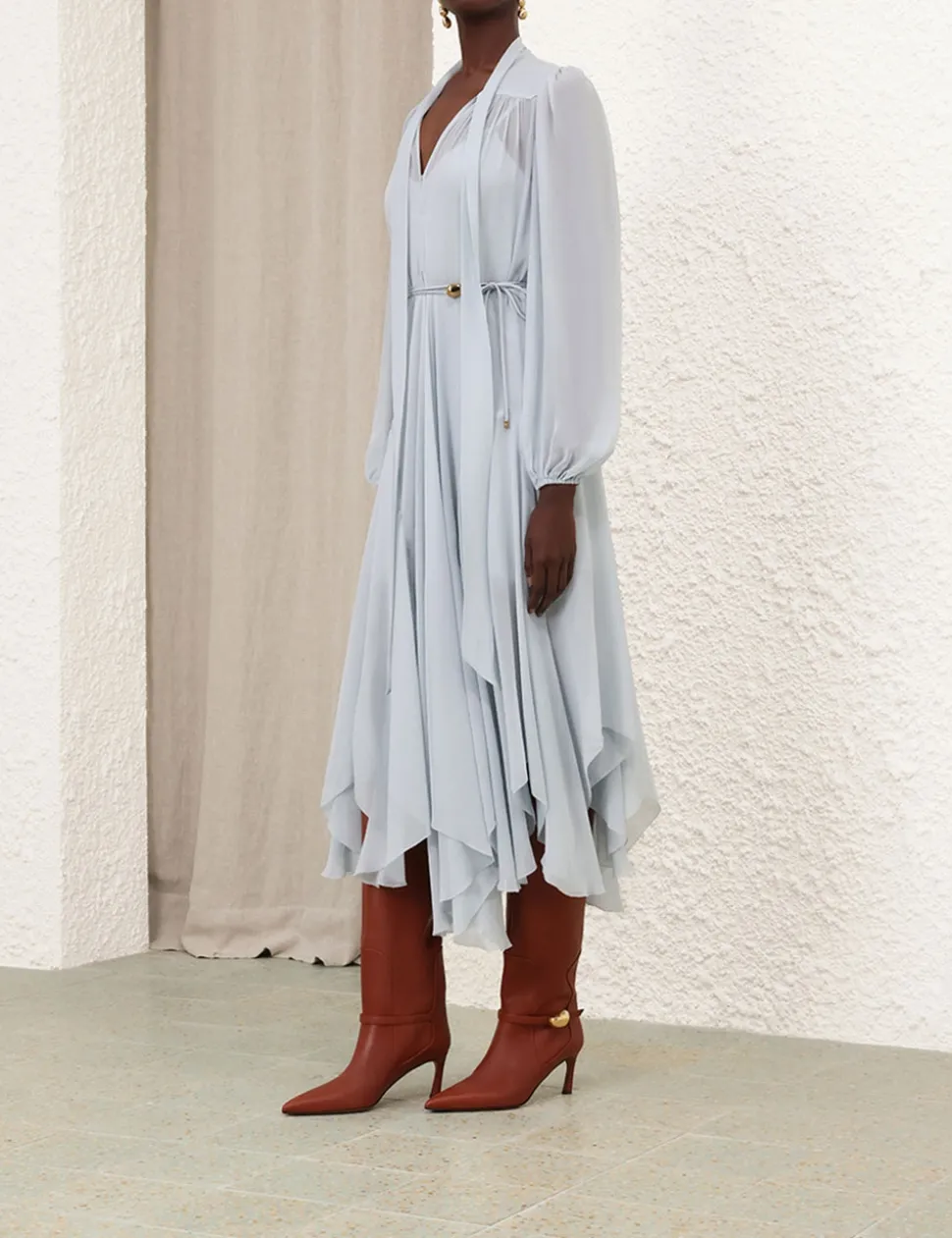 The Eden Handkerchief Dress in Dusty Blue from our Fall 2024 Collection, In Illustration. A midi dress featuring a handkerchief style skirt, V-neck opening with necktie and elasticated cuffs.