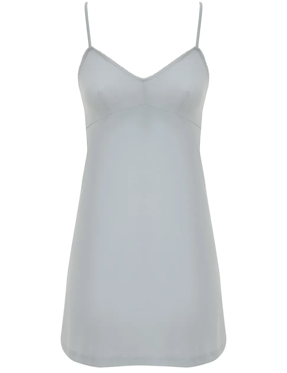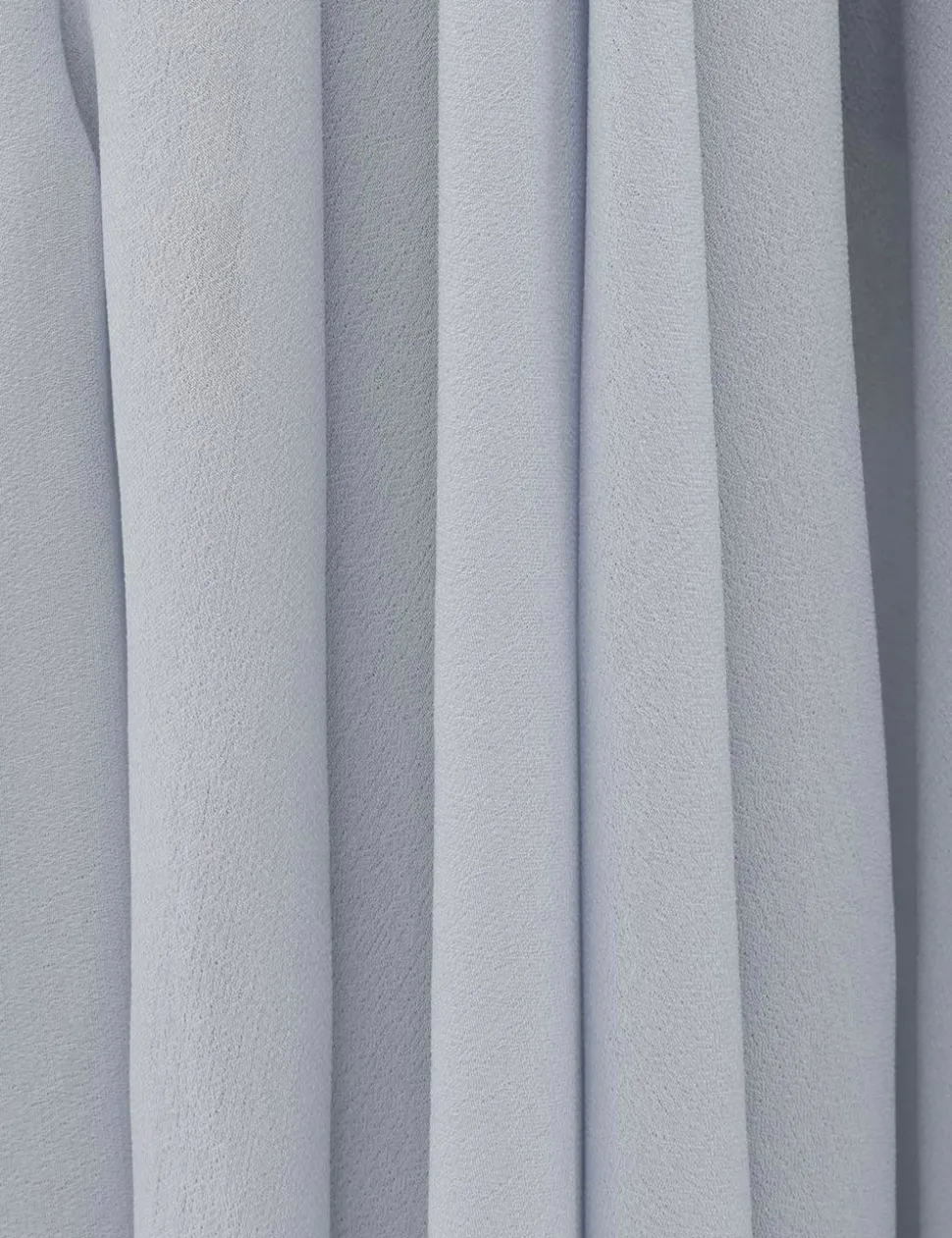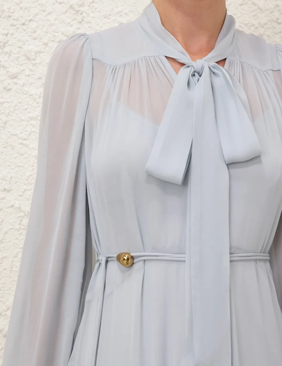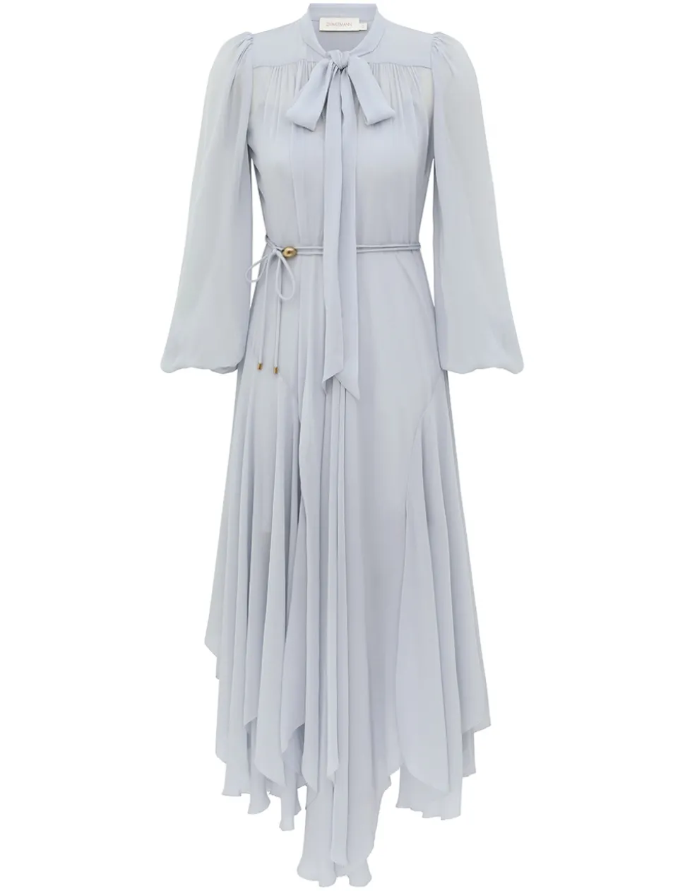 The Eden Handkerchief Dress in Dusty Blue from our Fall 2024 Collection, In Illustration. A midi dress featuring a handkerchief style skirt, V-neck opening with necktie and elasticated cuffs.