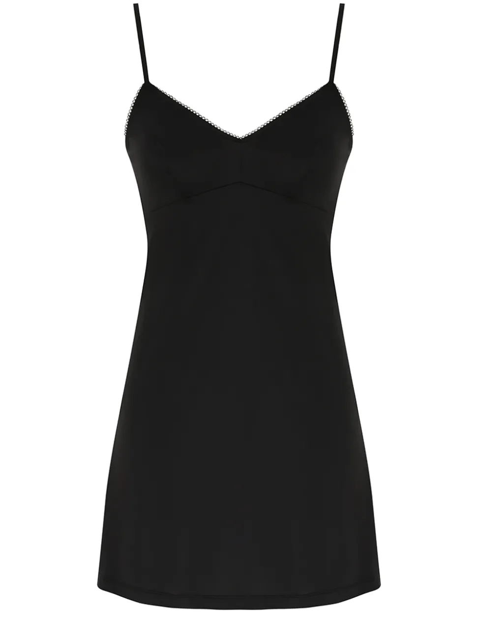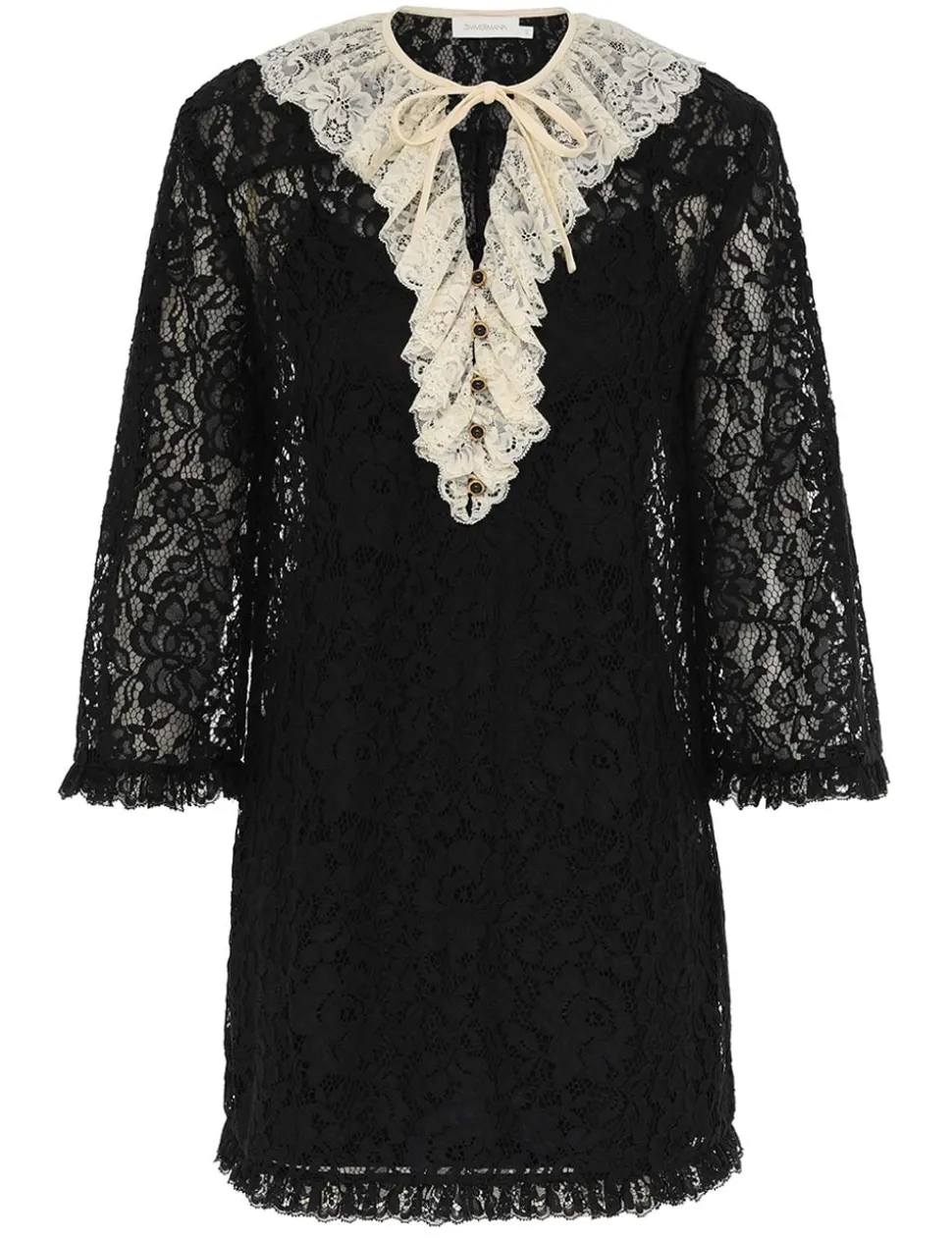 The Eden Lace Frill Mini Dress in Black/Cream from our Fall 2024 Collection, In Illustration. A cotton frill mini dress featuring a contrast yoke, gathered lace trim neckline and cuffs.