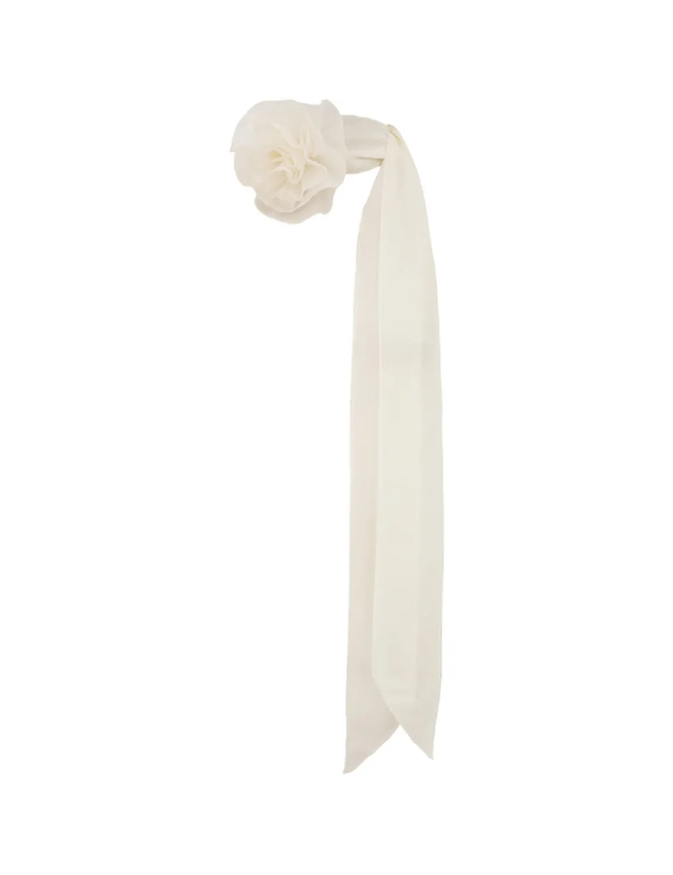 The Flower Neck Scarf in Ivory from our Resort 2025 Collection, Crush. A skinny scarf with a statement rose design at the front.