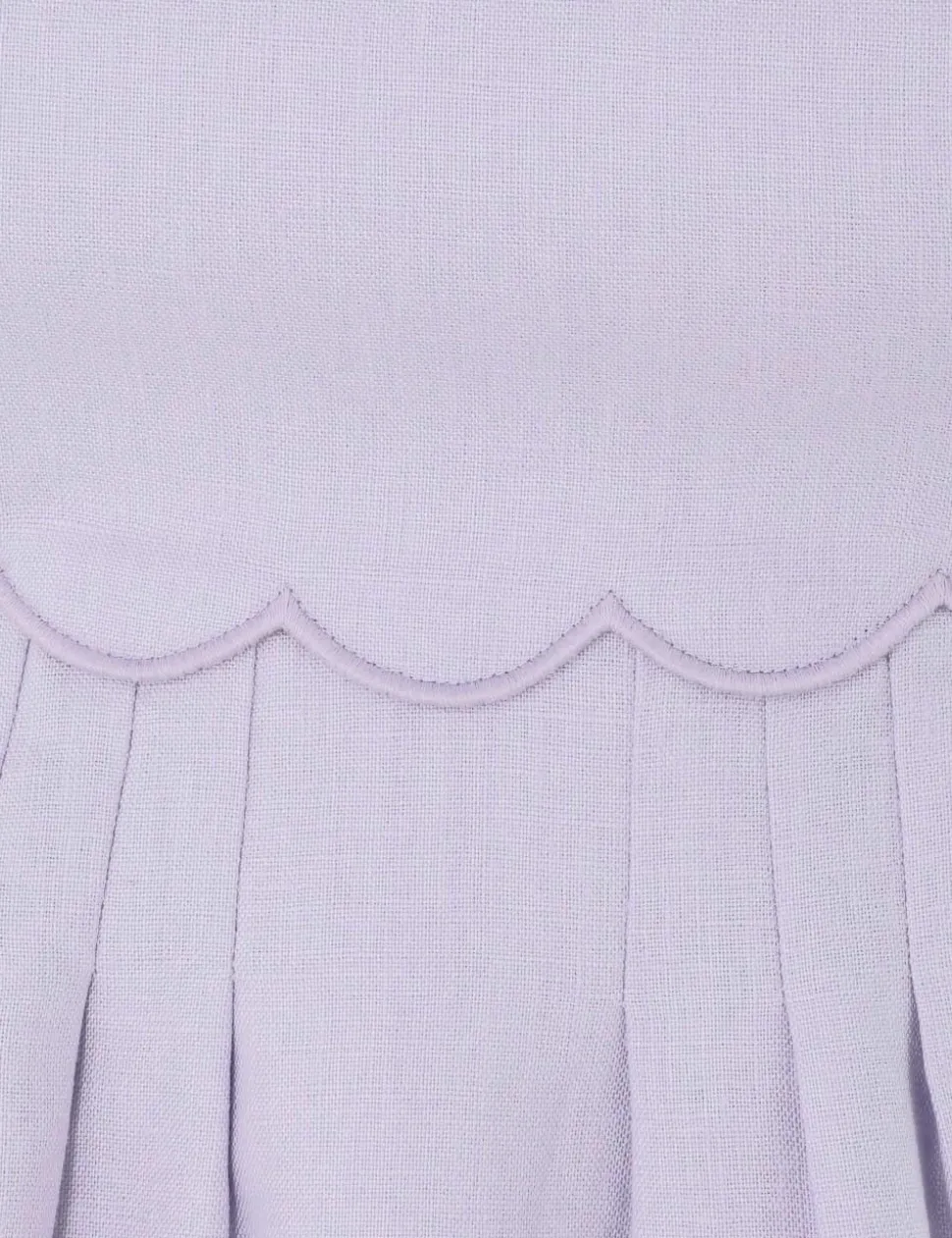 The Halliday Scallop Mini Dress in Lilac from our Summer Swim 2024 Collection. A linen mini dress featuring an off the shoulder silhouette with blouson sleeves and bonding at the side seam.