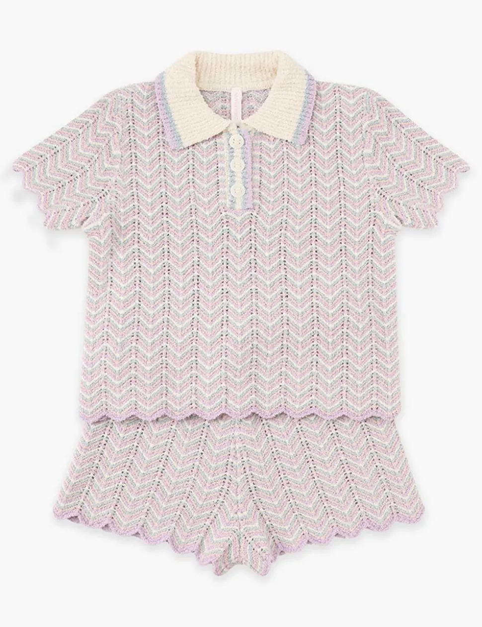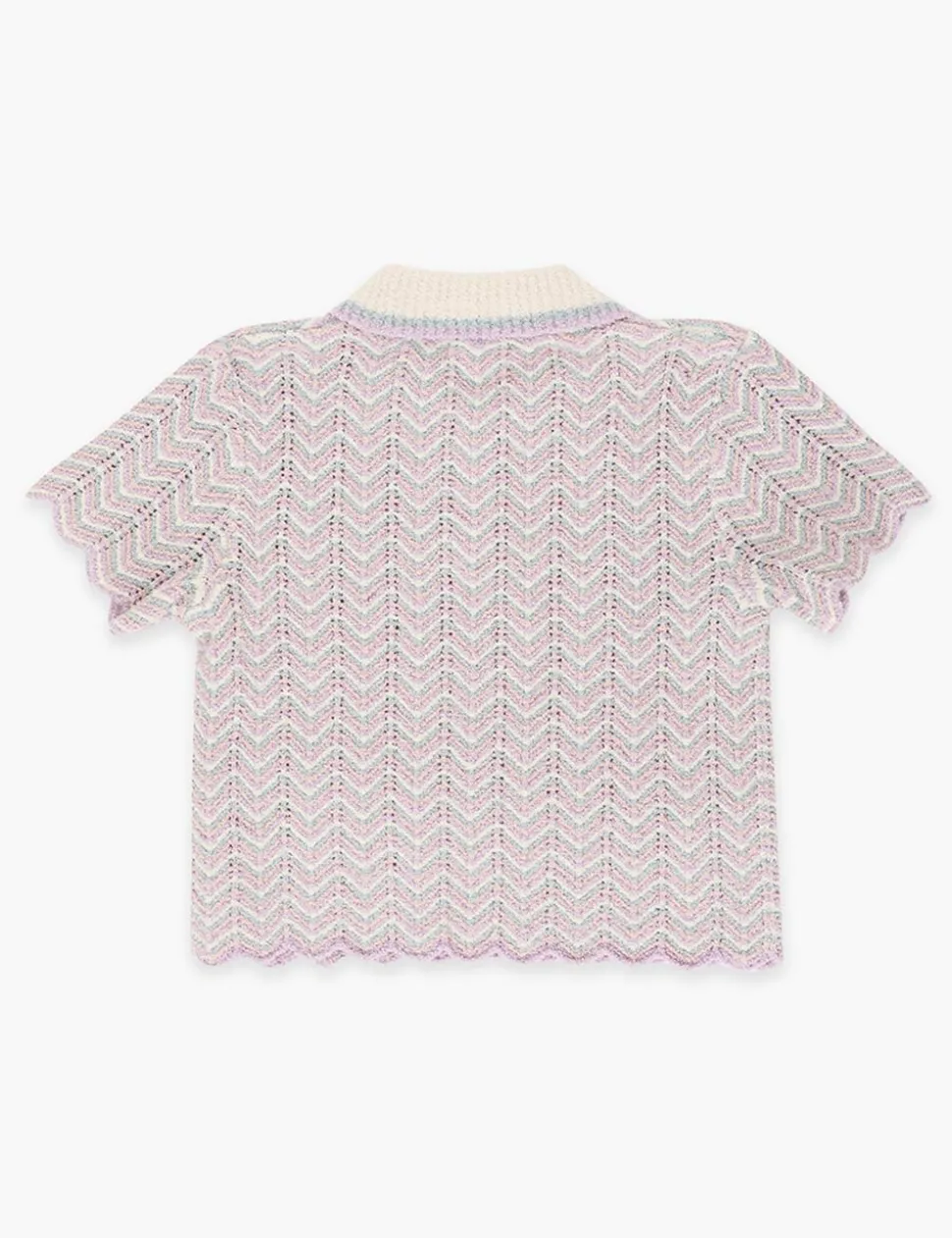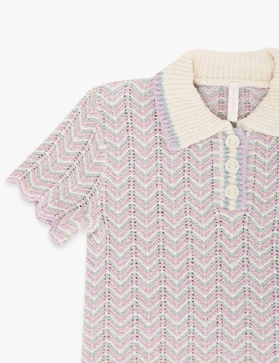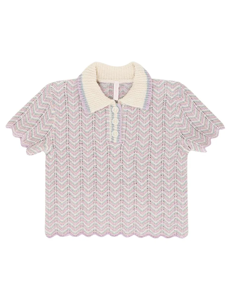 The Halliday Textured Knit Polo in Multi from our Summer Swim 2024 Collection. A kids knitted polo featuring a contrast collar and scalloped edges.