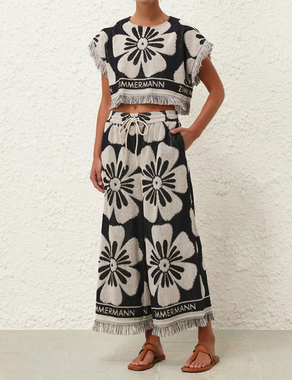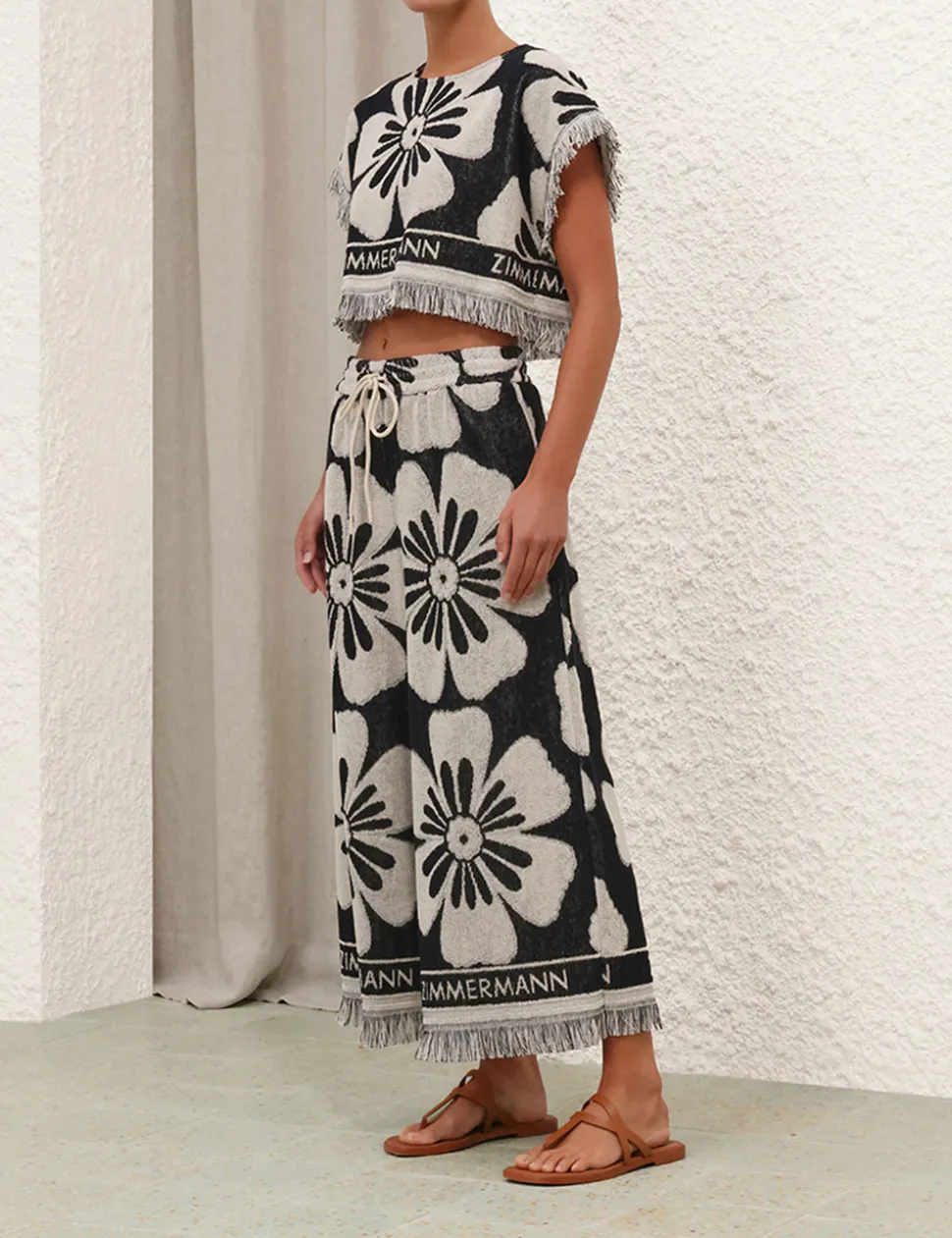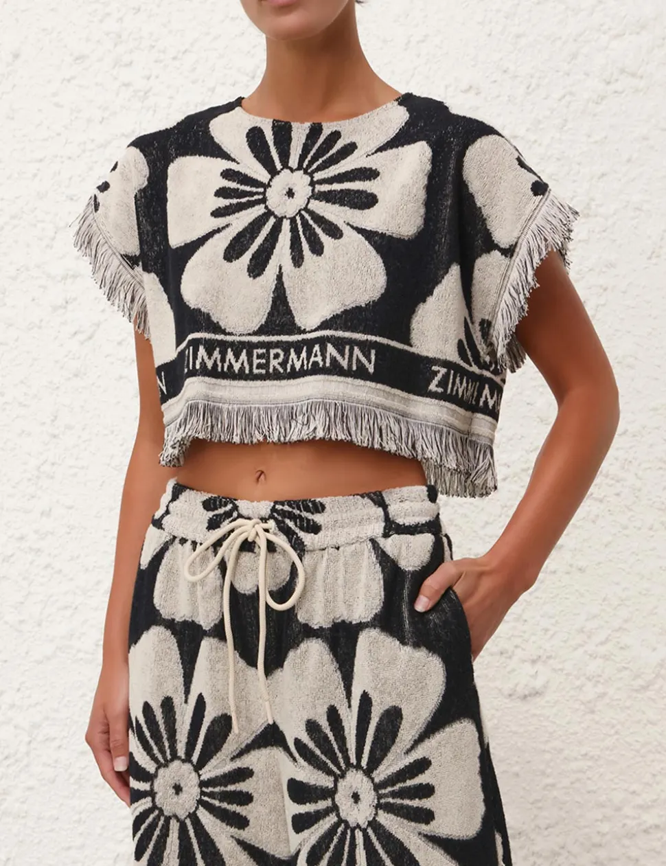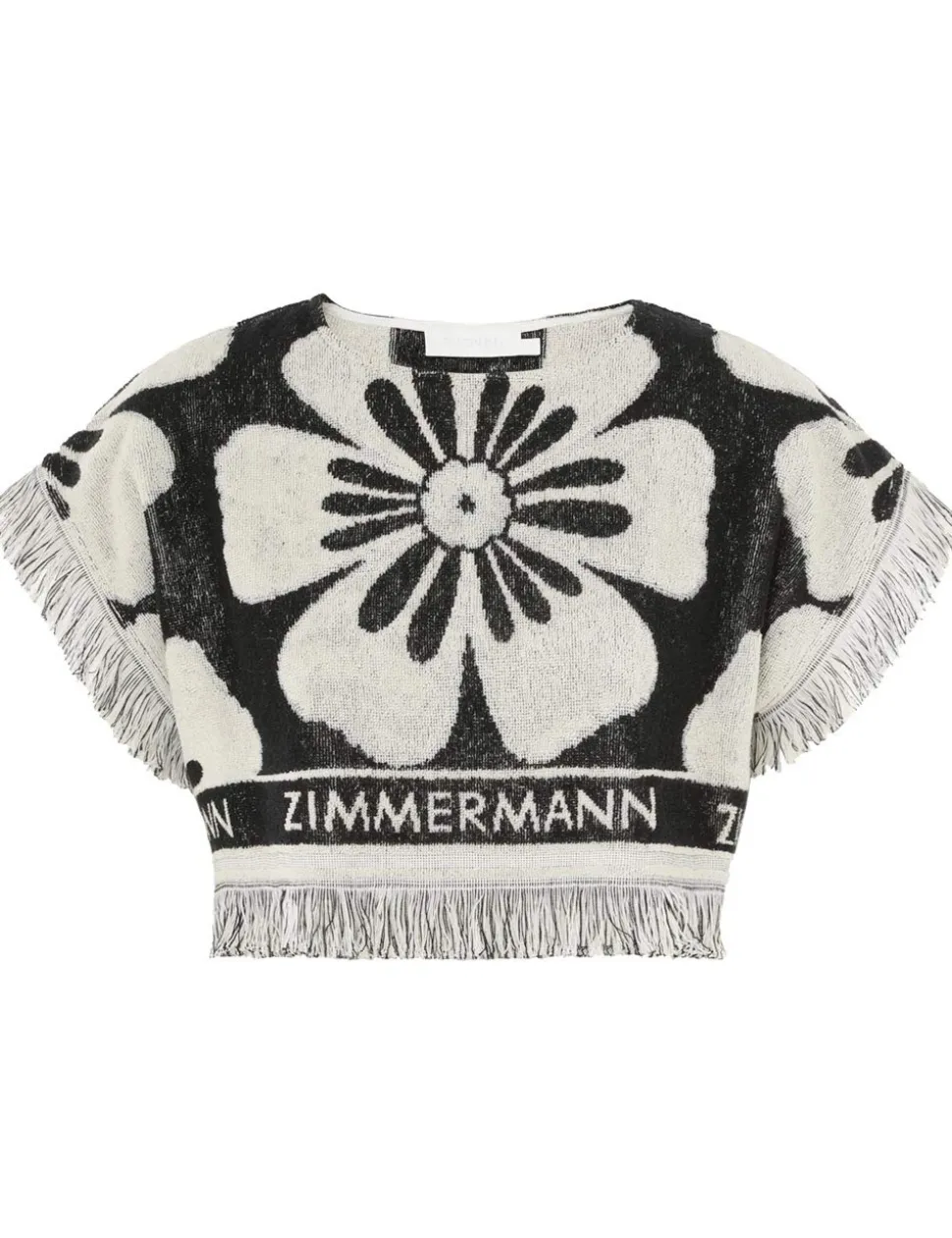 The Halliday Towelling Crop in Black/Cream from our Summer Swim 2024 Collection. A terry cotton crop featuring fringed edges and ZIMMERMANN branding.
