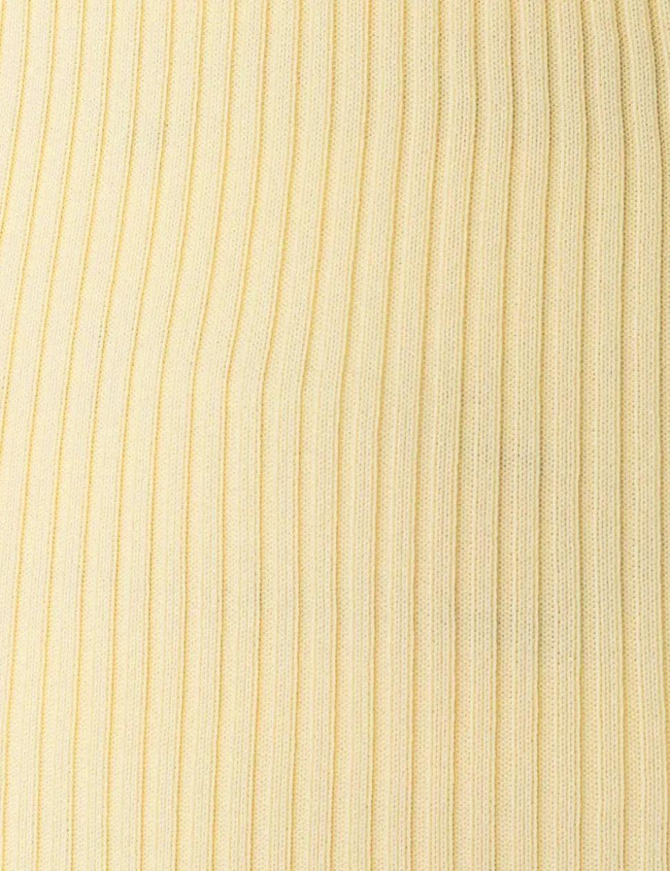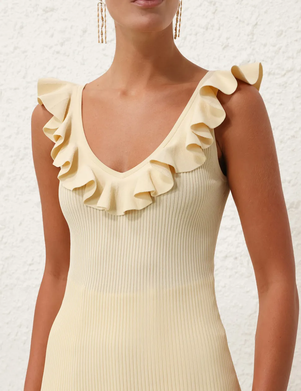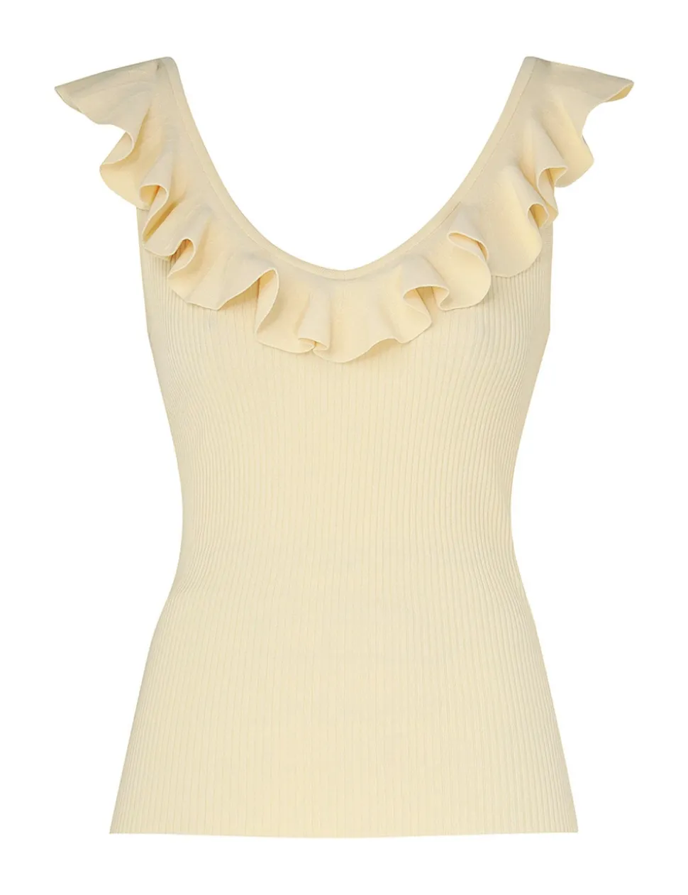 The Halliday V-Neck Frill Tank in Butter from our Summer Swim 2024 Collection. A ribbed knit, fitted tank with a frilled v-neckline.