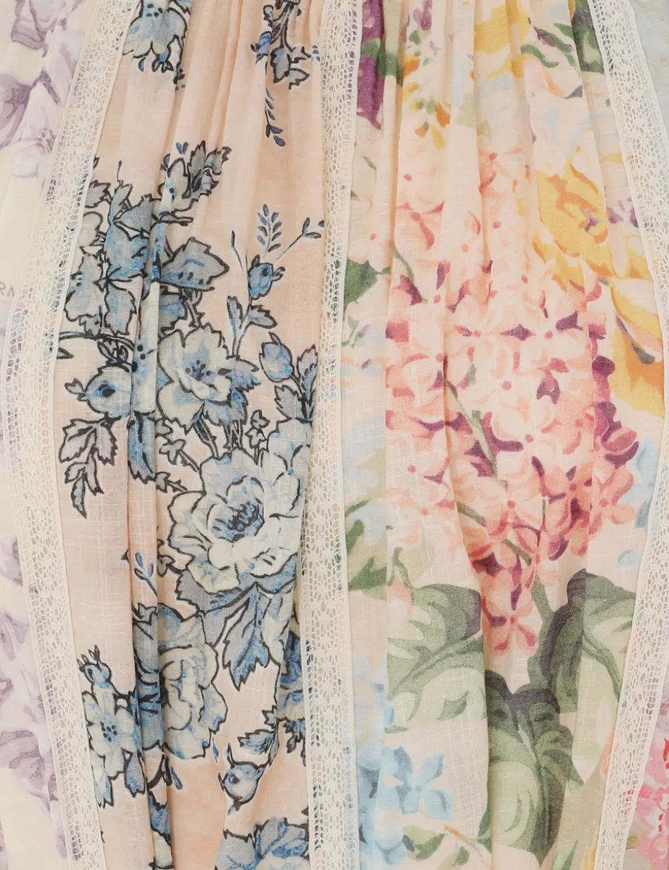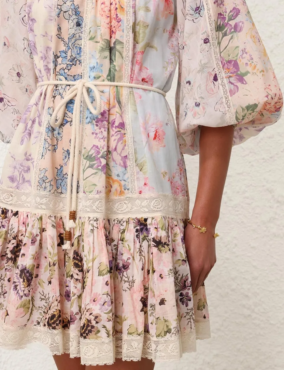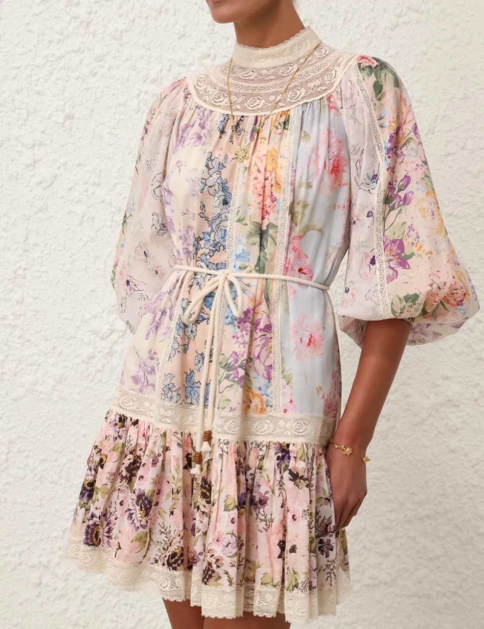 The Halliday Yoke Mini Dress in Spliced from our Summer Swim 2024 Collection. A cotton mini dress featuring a statement stand collar, blouson sleeves, finished with a placement yoke trim.