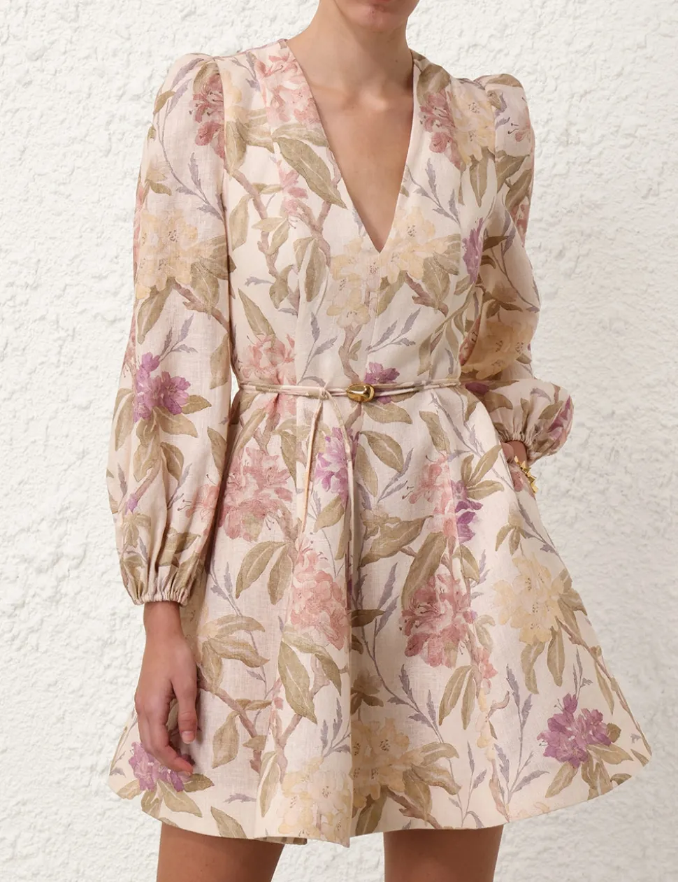 The Illustration Belted Flip Dress in Cream Inca Lily from our Fall 2024 Collection, In Illustration. A long sleeve linen mini dress featuring a deep v-neckline with fitted bodice and full skirt.