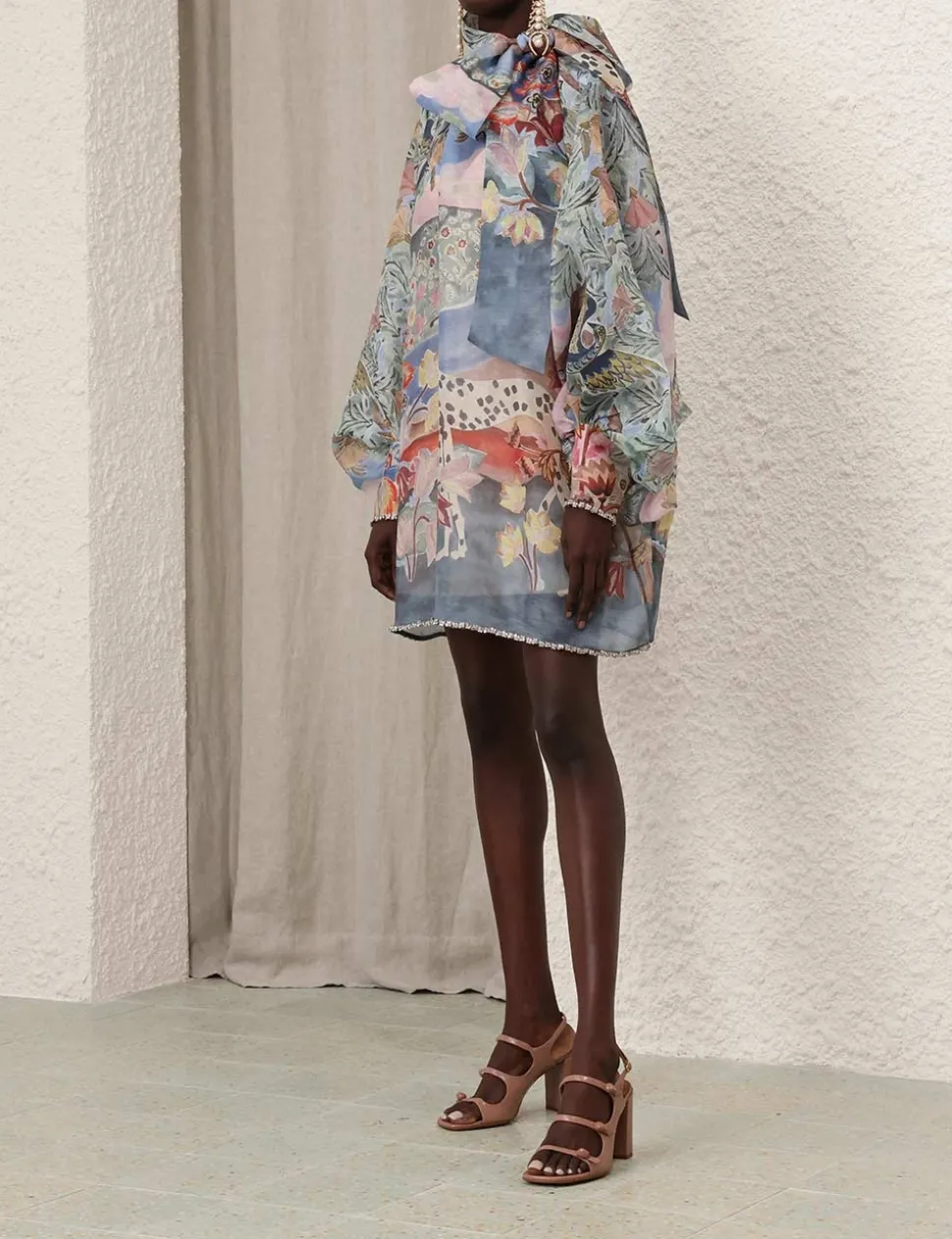 The Illustration Billow Shift in Eden Garden from our Fall 2024 Collection, In Illustration. A silk linen mini dress featuring a crystal trim detailing, gathered front and back neckline with a self tie neck tie.