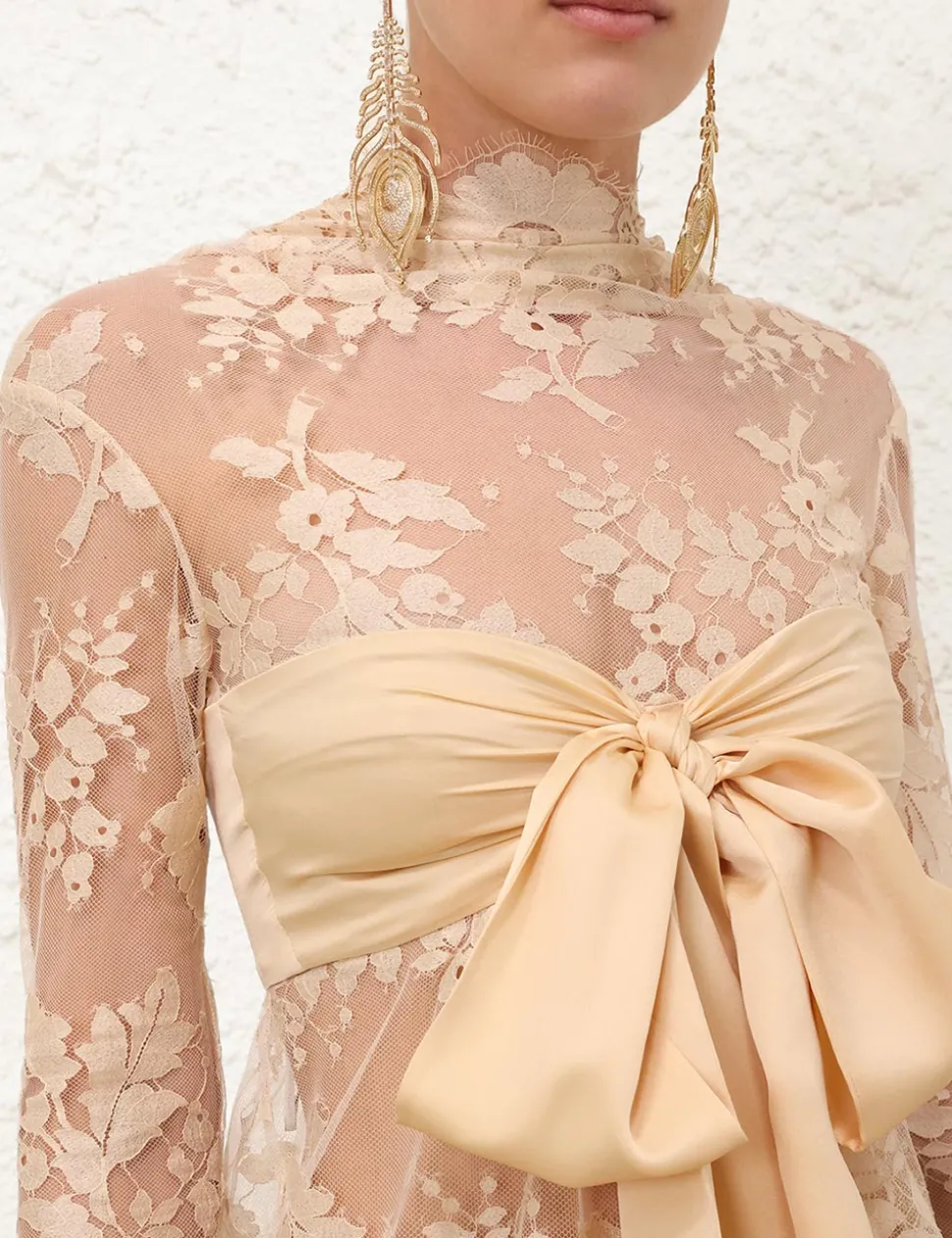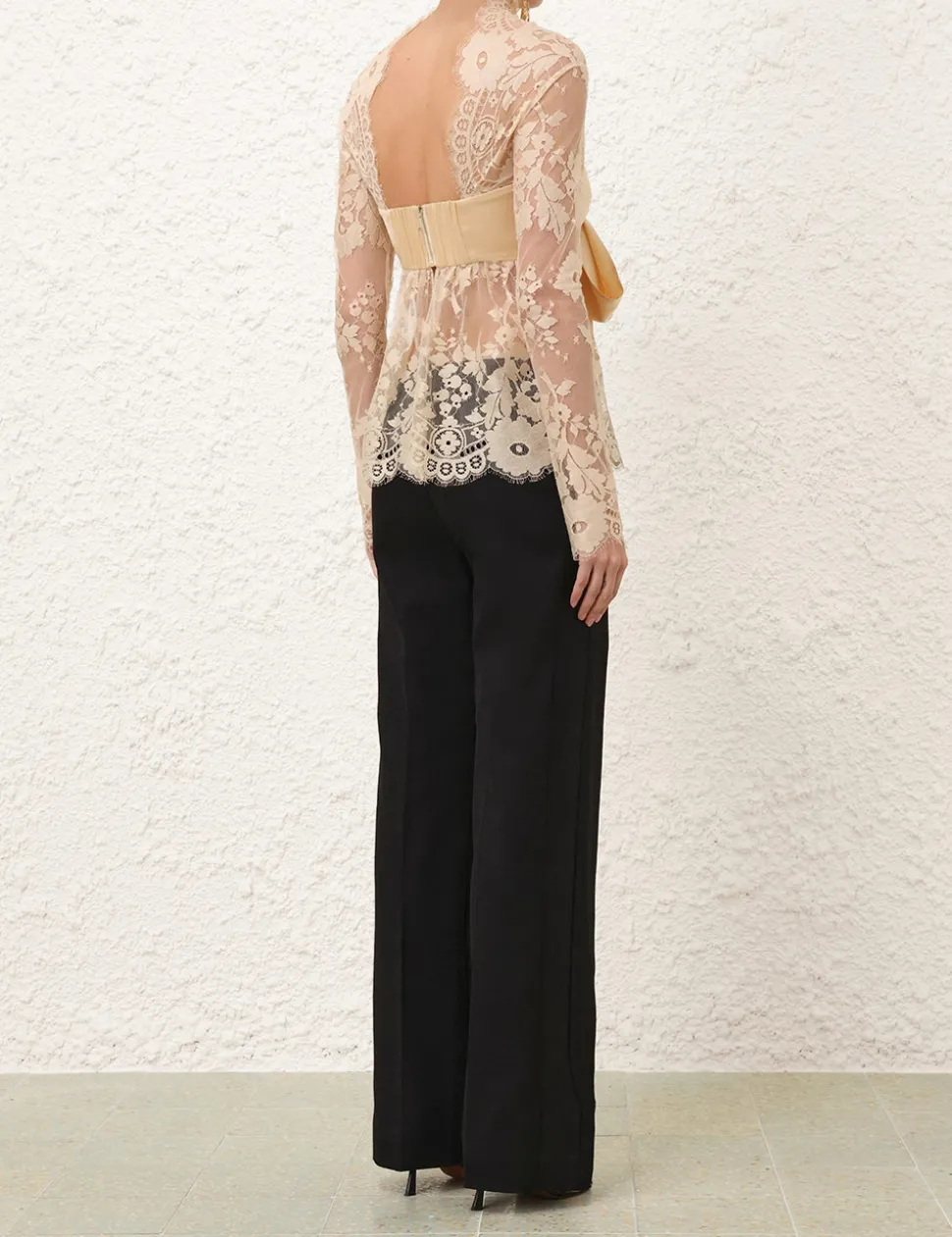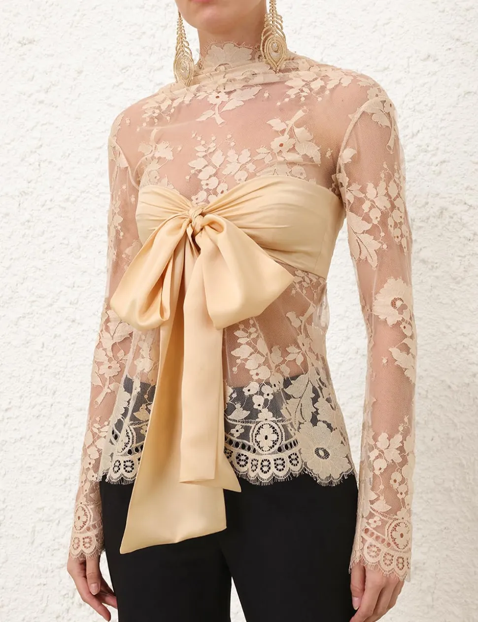 The Illustration Lace Bow Bodice in Tea from our Fall 2024 Collection, In Illustration. A lace long sleeve bodice featuring a centre back zip with an elasticated panel, lace scallop edge trim on the hem and sleeves; finished with a detachable centre bust bow.