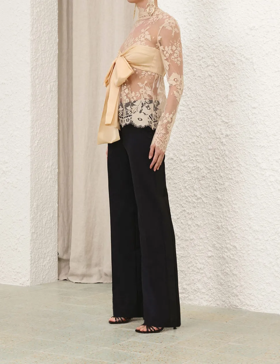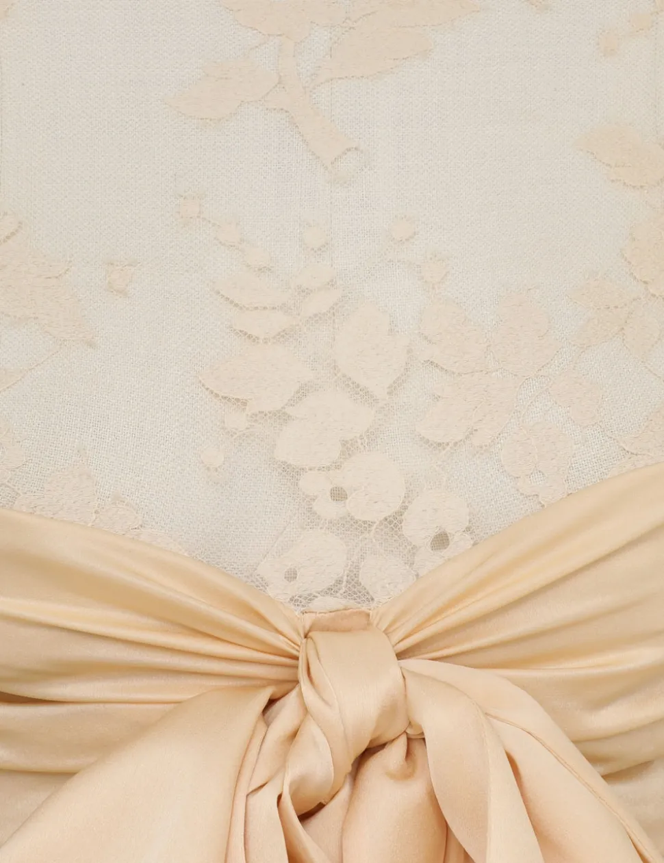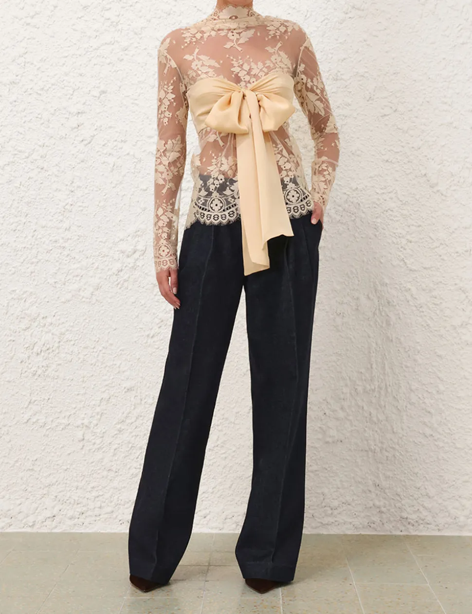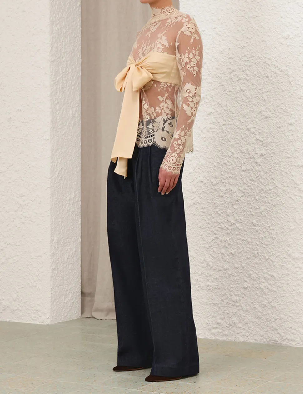 The Illustration Lace Bow Bodice in Tea from our Fall 2024 Collection, In Illustration. A lace long sleeve bodice featuring a centre back zip with an elasticated panel, lace scallop edge trim on the hem and sleeves; finished with a detachable centre bust bow.