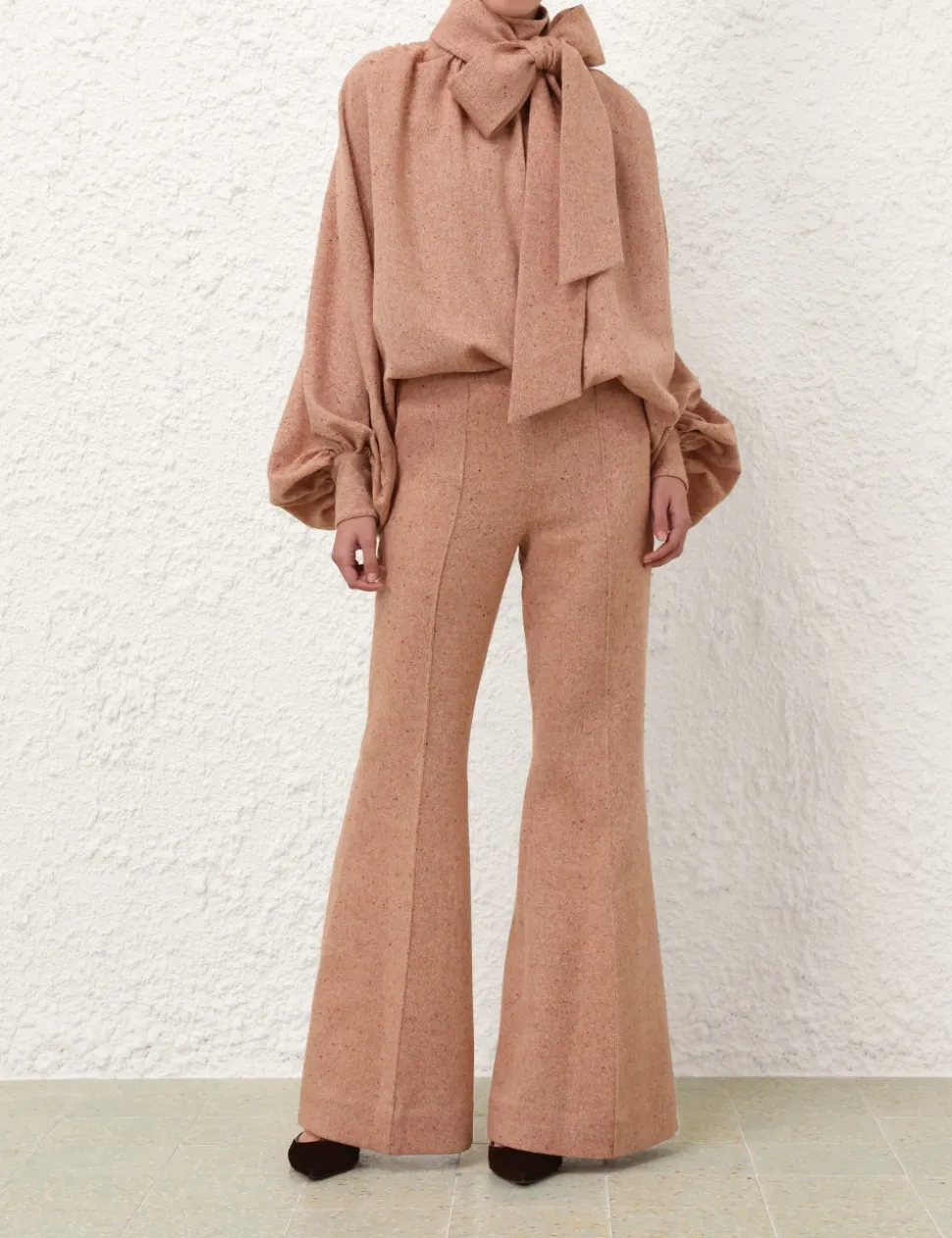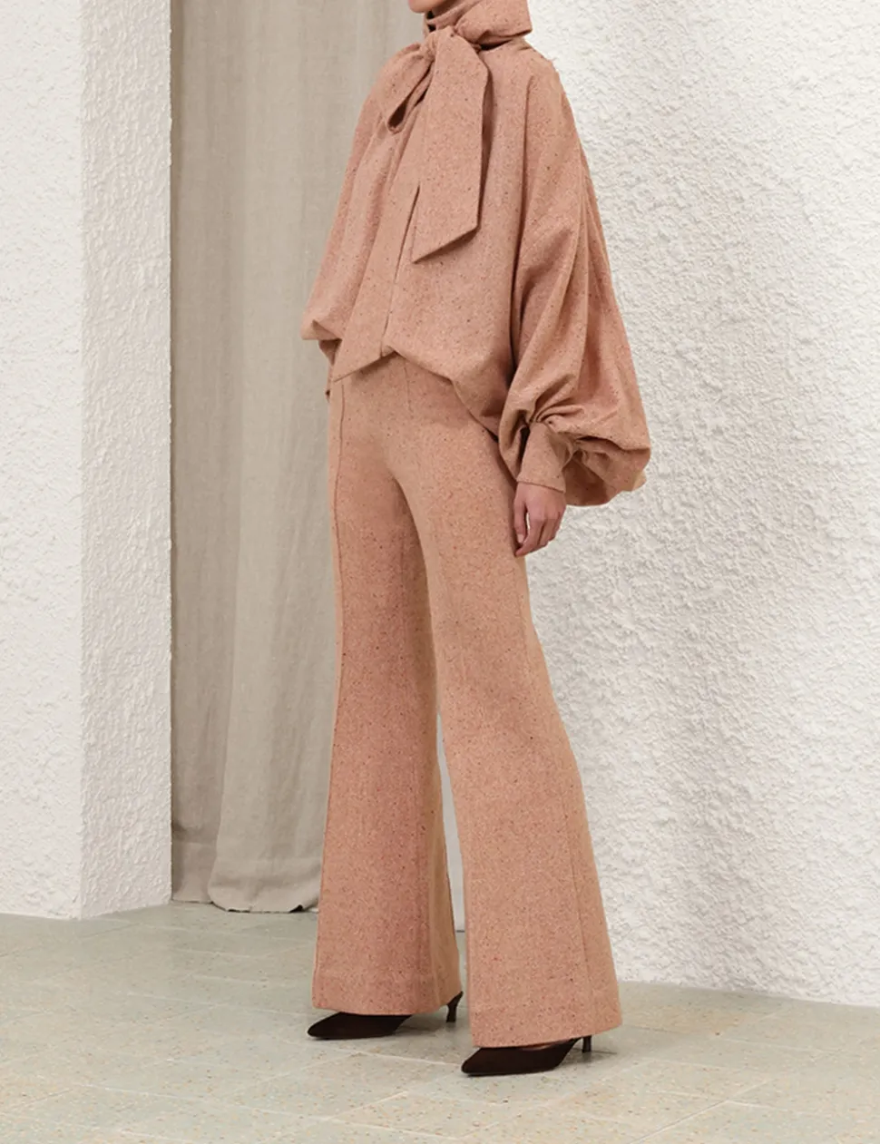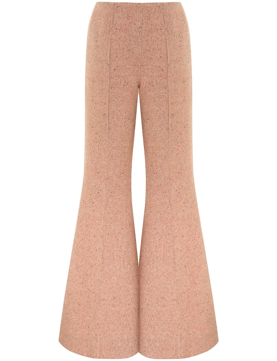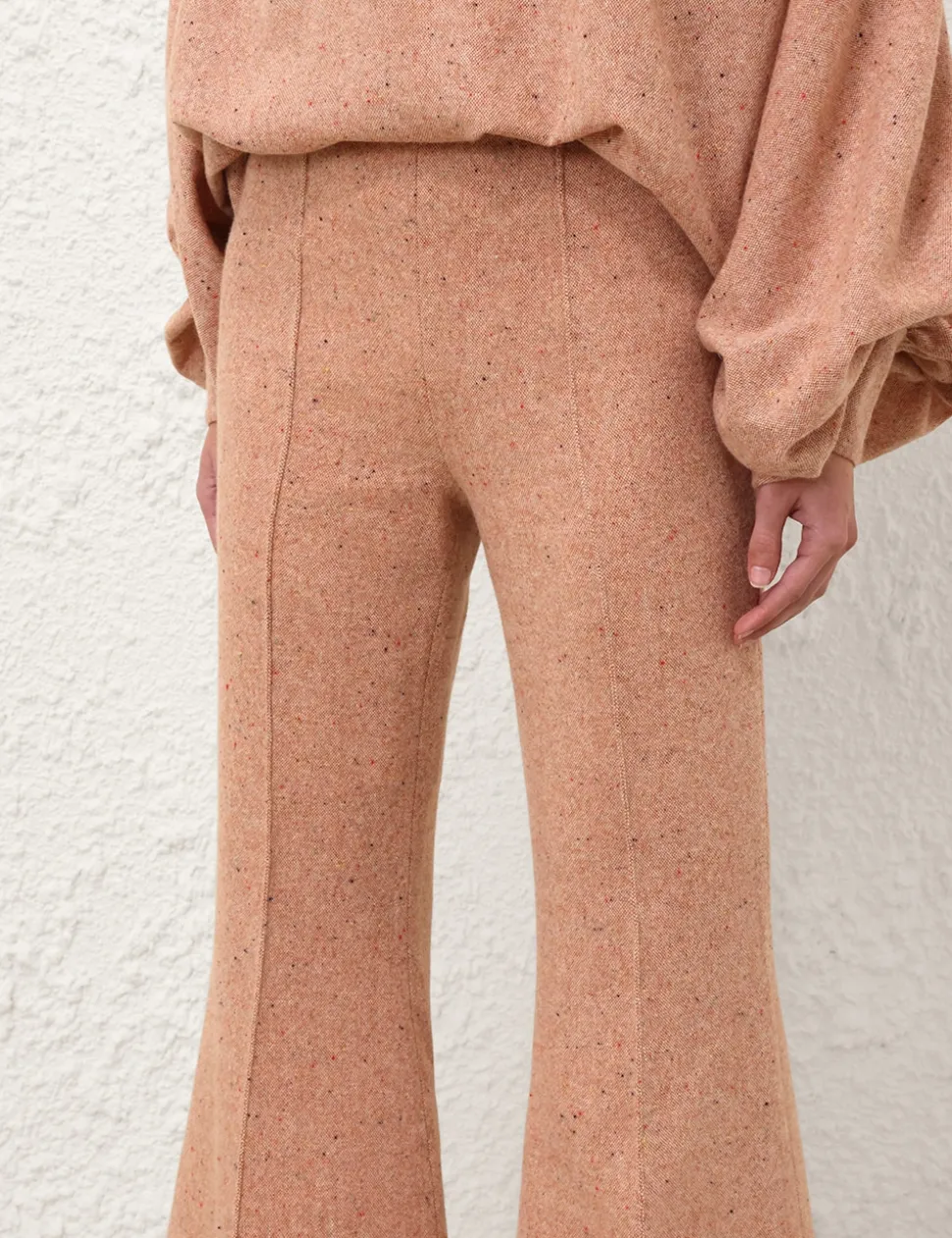 The Illustration Melange Flare in Red from our Fall 2024 Collection, In Illustration. A wool blend tailored flared leg pant featuring centre front and back pintucks and an invisible zip closure.