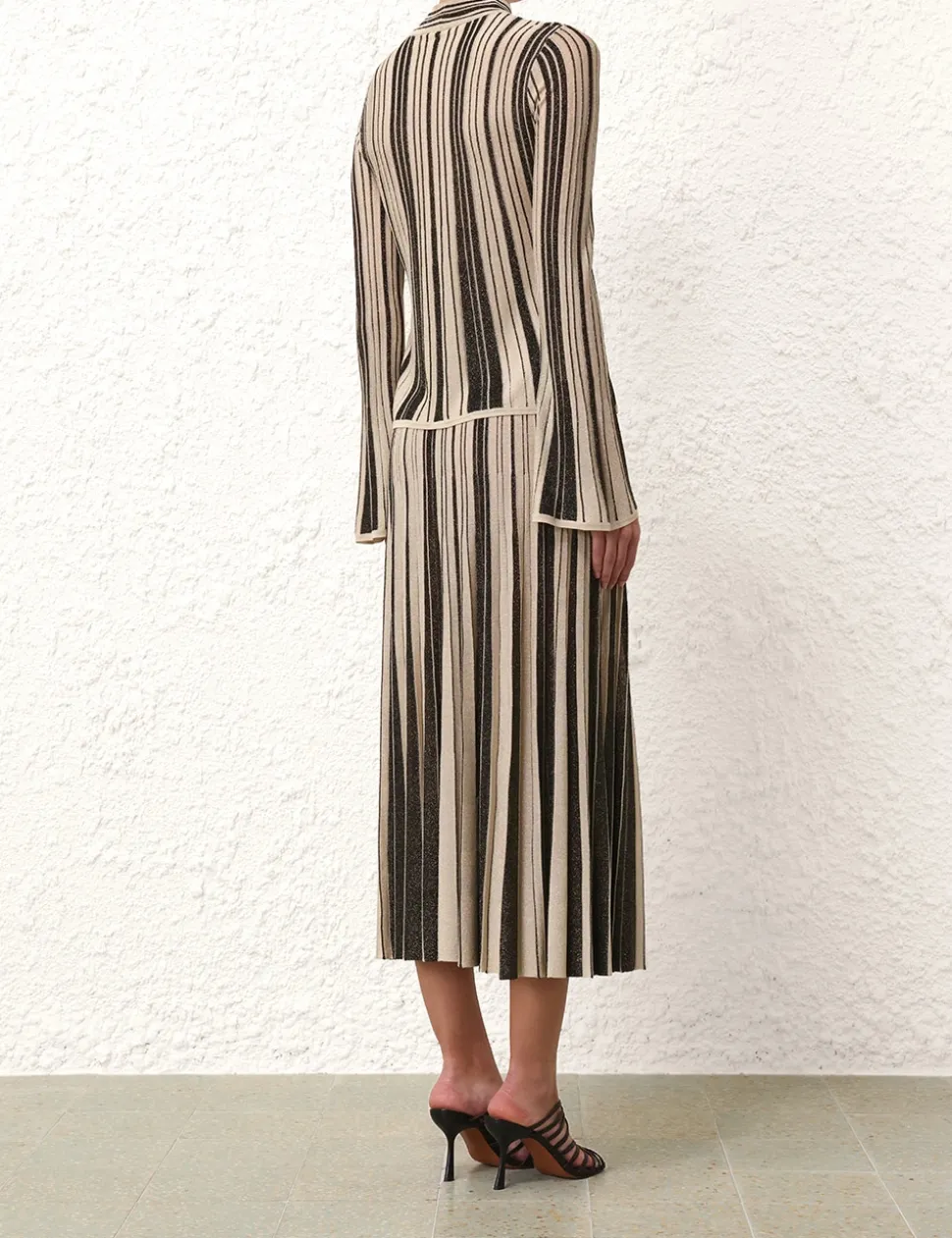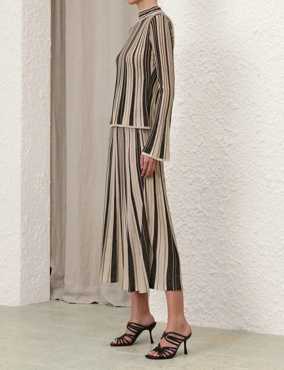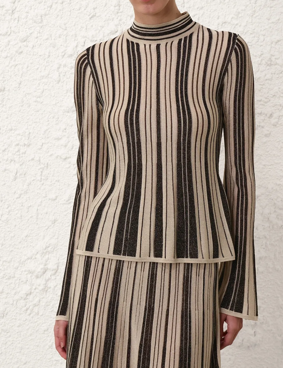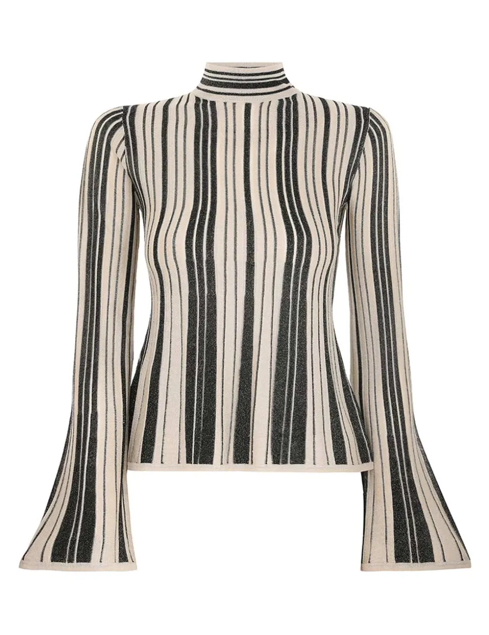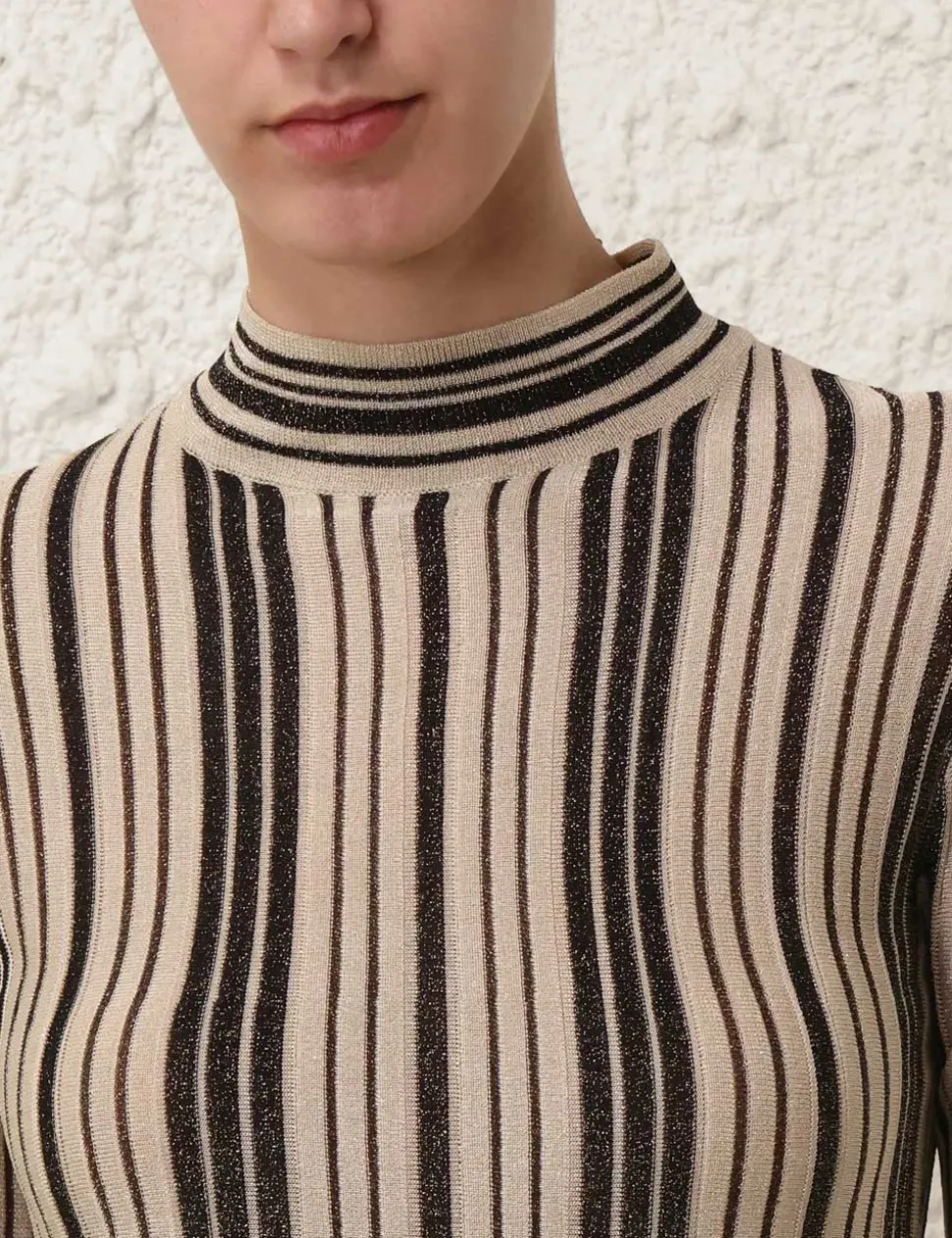 The Illustration Metallic Knit Top in Black/Gold from our Fall 2024 Collection, In Illustration. A metallic long sleeve knit top featuring a high neck and contrast stripes.