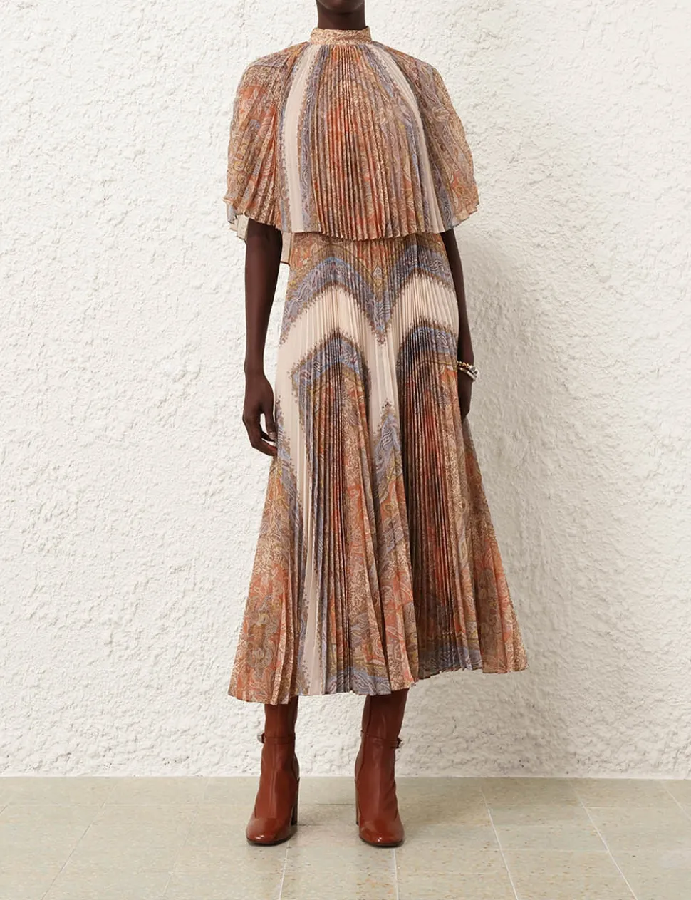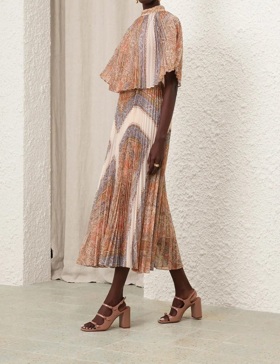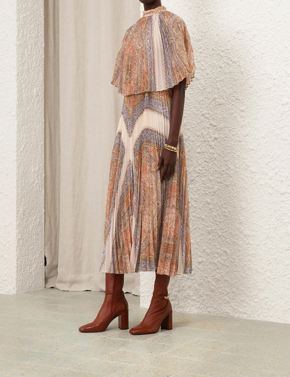 The Illustration Sunray Midi Dress in Paisley Haze from our Fall 2024 Collection, In Illustration. A sunray midi dress featuring a stand collar and a two-tiered pleated cape and skirt.
