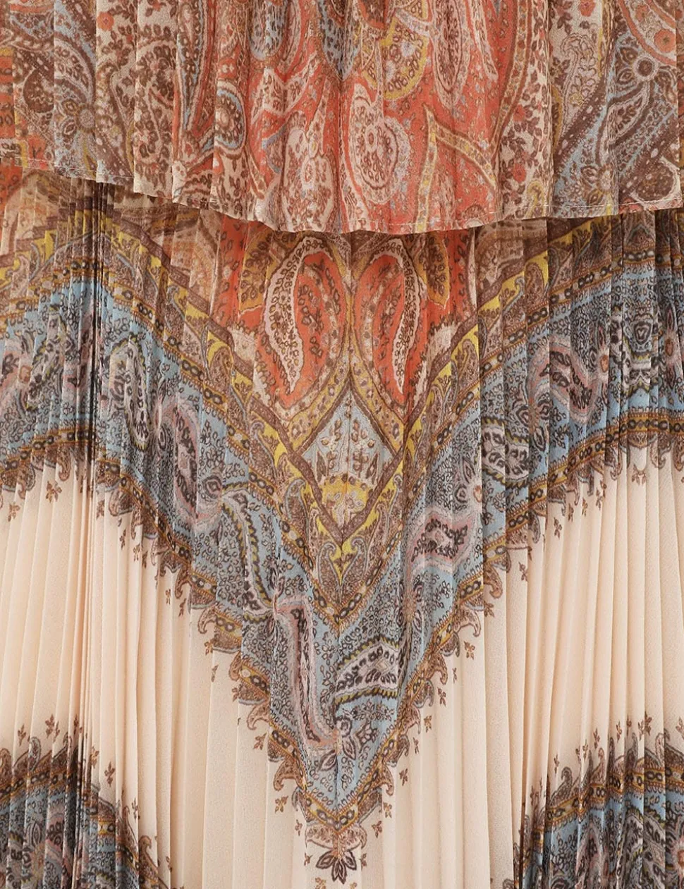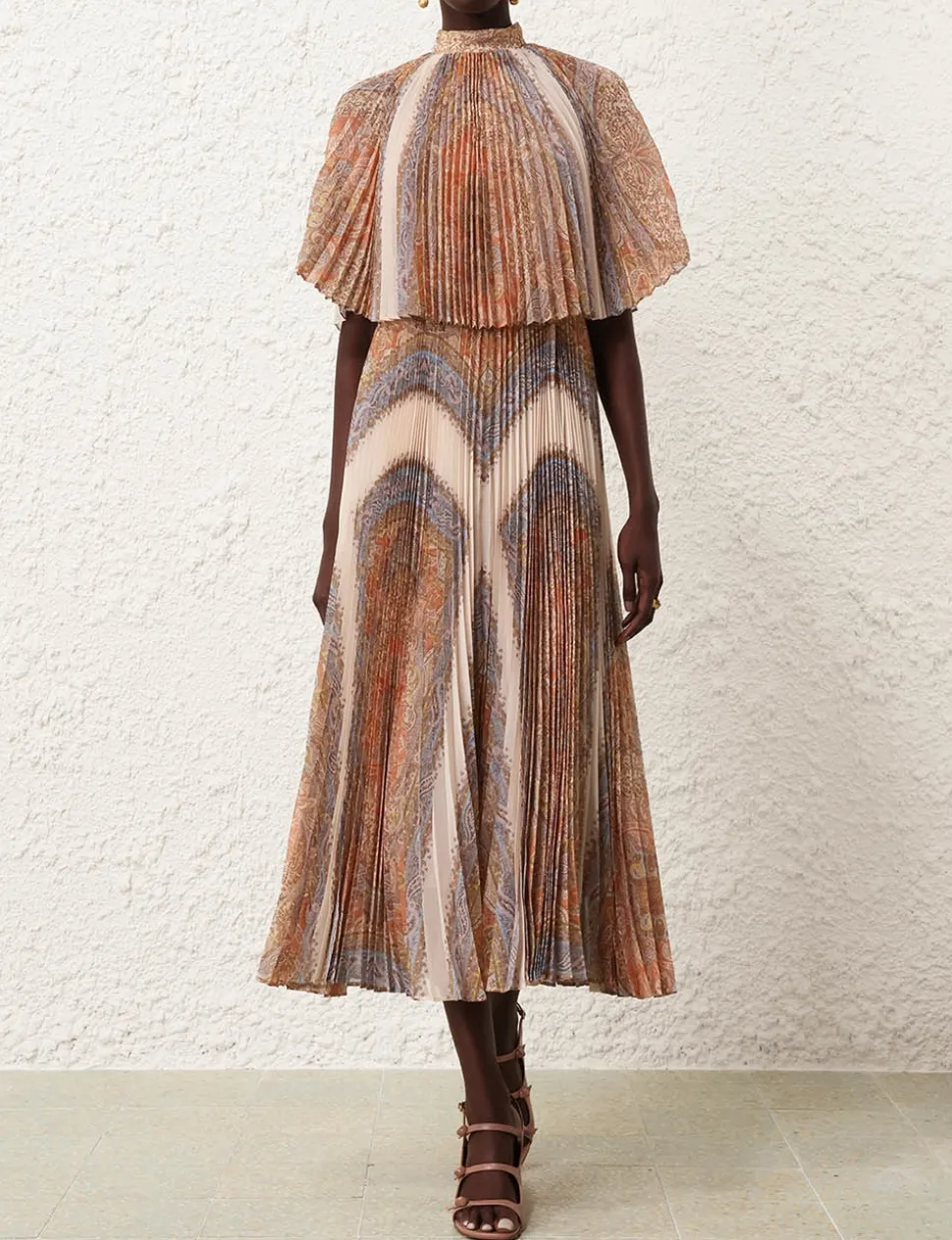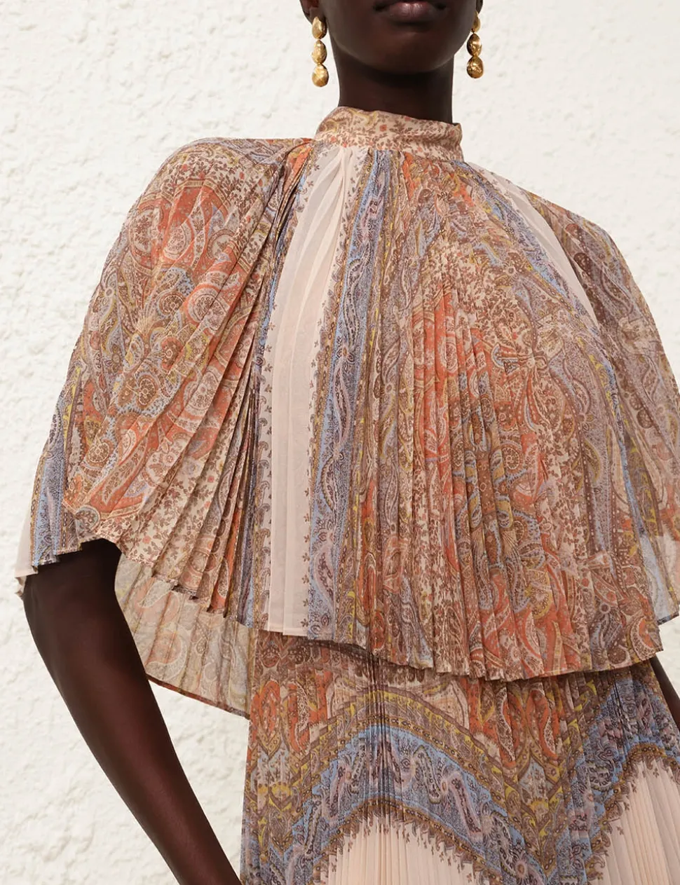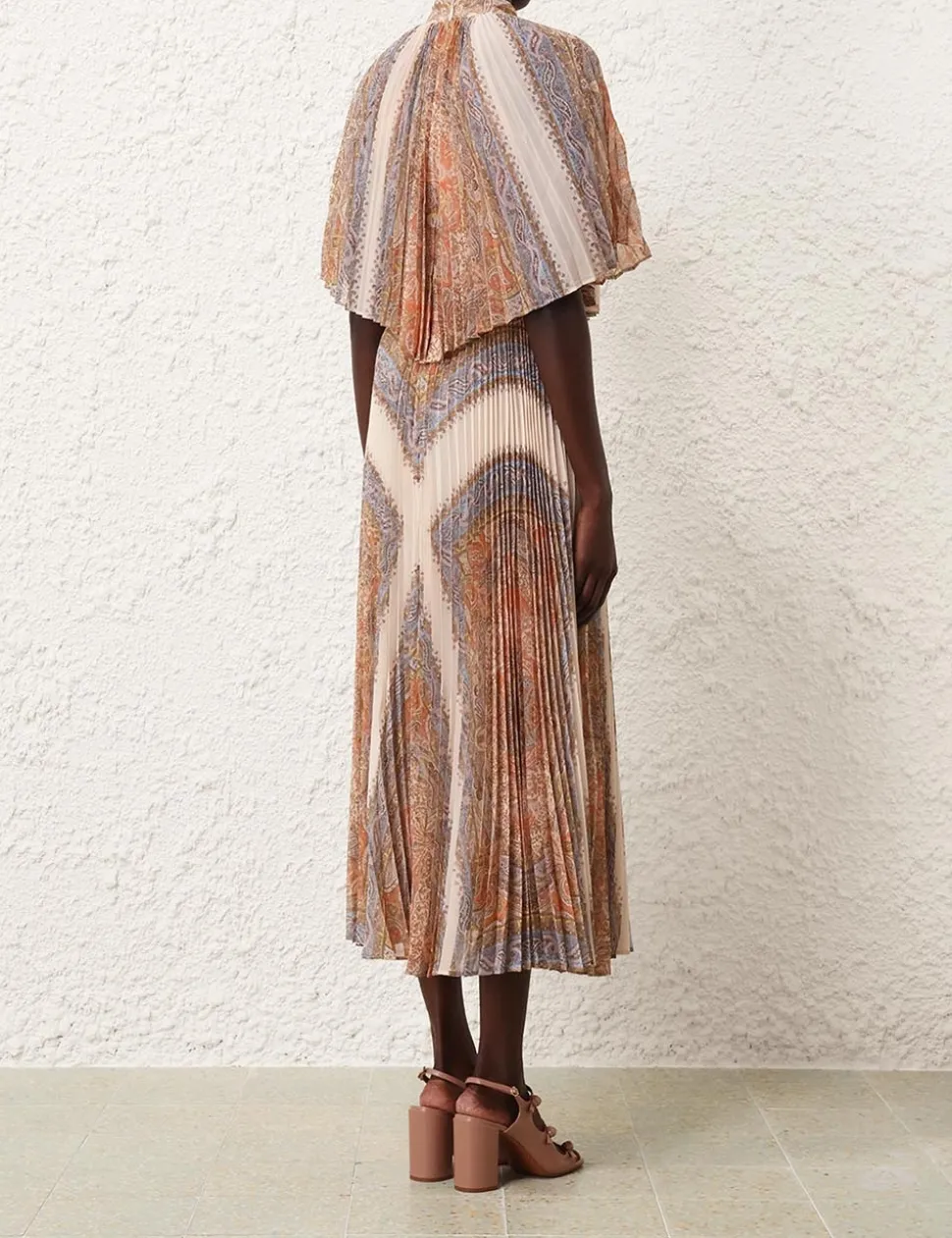 The Illustration Sunray Midi Dress in Paisley Haze from our Fall 2024 Collection, In Illustration. A sunray midi dress featuring a stand collar and a two-tiered pleated cape and skirt.