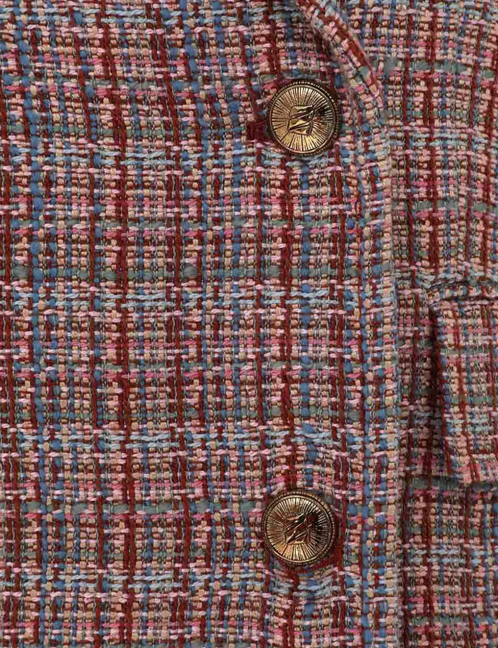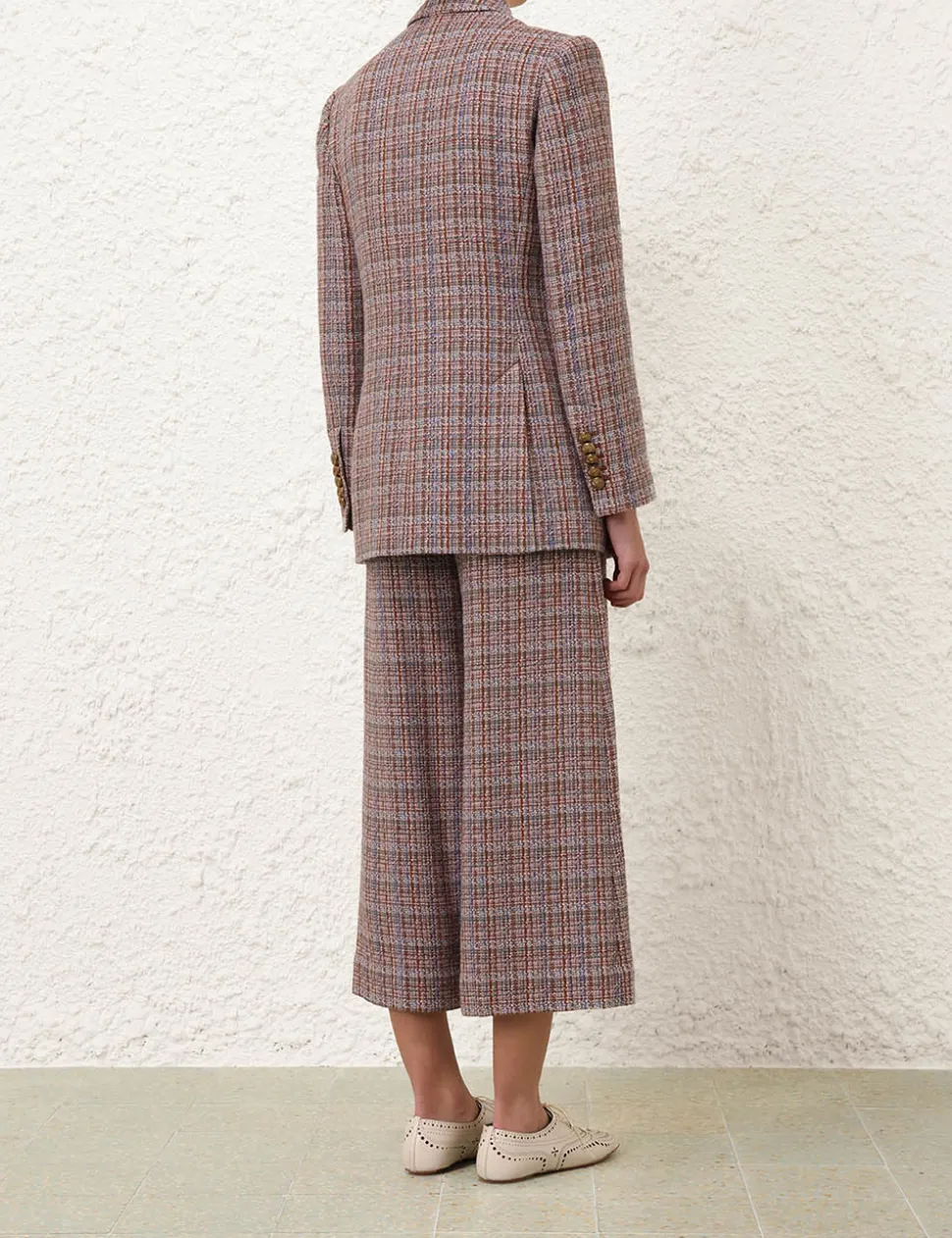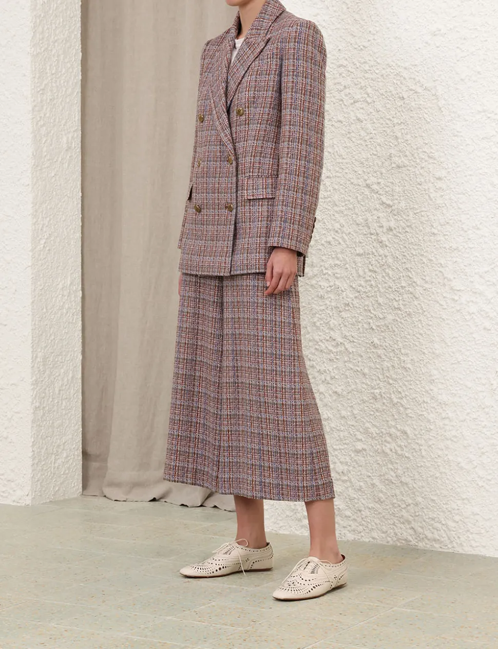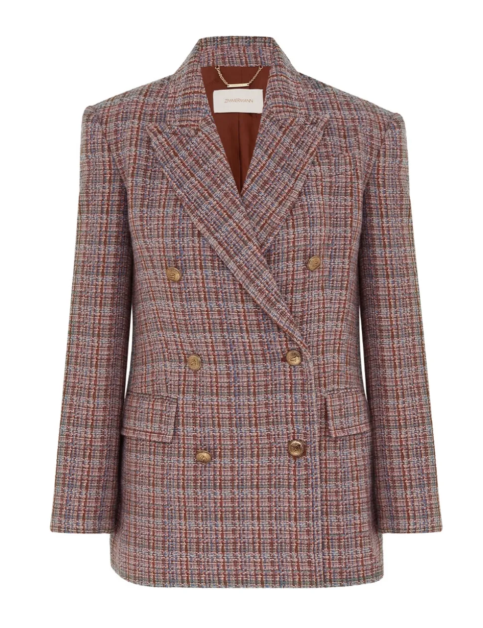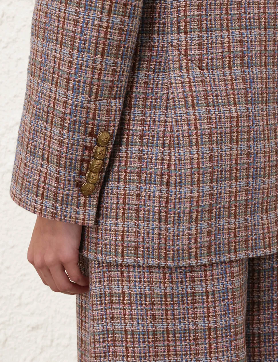 The Illustration Tweed Jacket in Multi from our Fall 2024 Collection, In Illustration. A wool and cotton blend tailored jacket featuring a double breasted closure, shoulder pads and functional pockets.