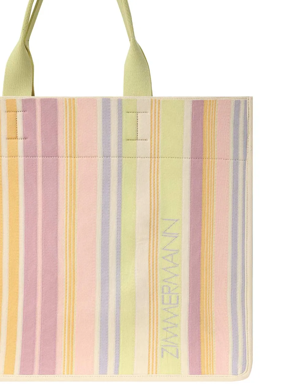 The Large Jacquard Tote in Multi Stripe from our Summer Swim 2024 Collection. A large tote bag featuring an interior pocket and snap button closure.