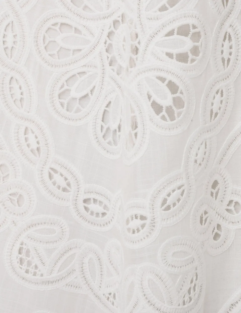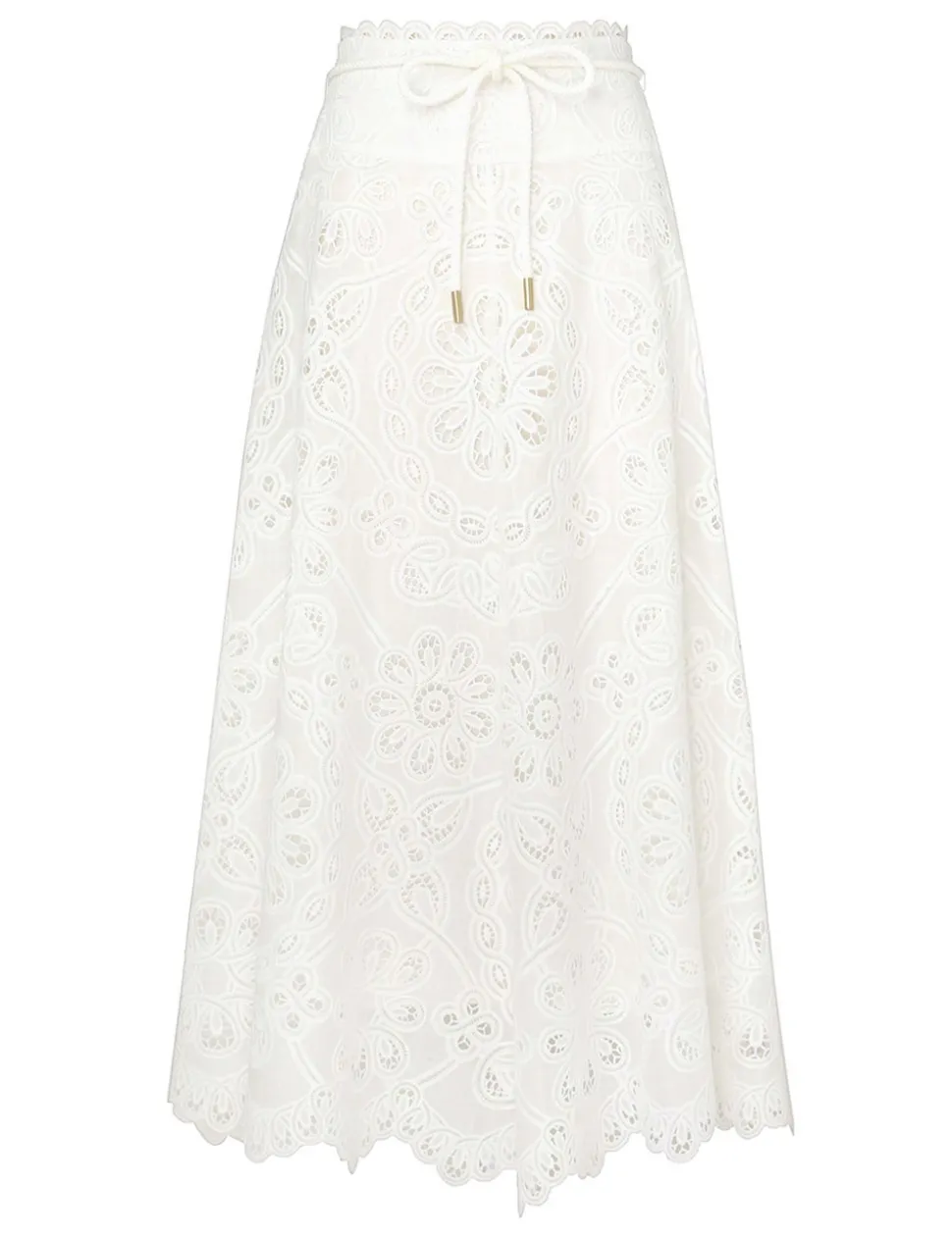 The Ottie Flared Skirt in Ivory from our Summer Swim 2024 Collection. Cotton midi skirt featuring a scalloped hem and a removable belt.