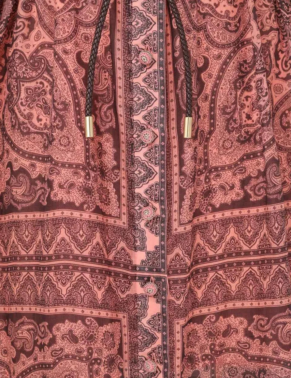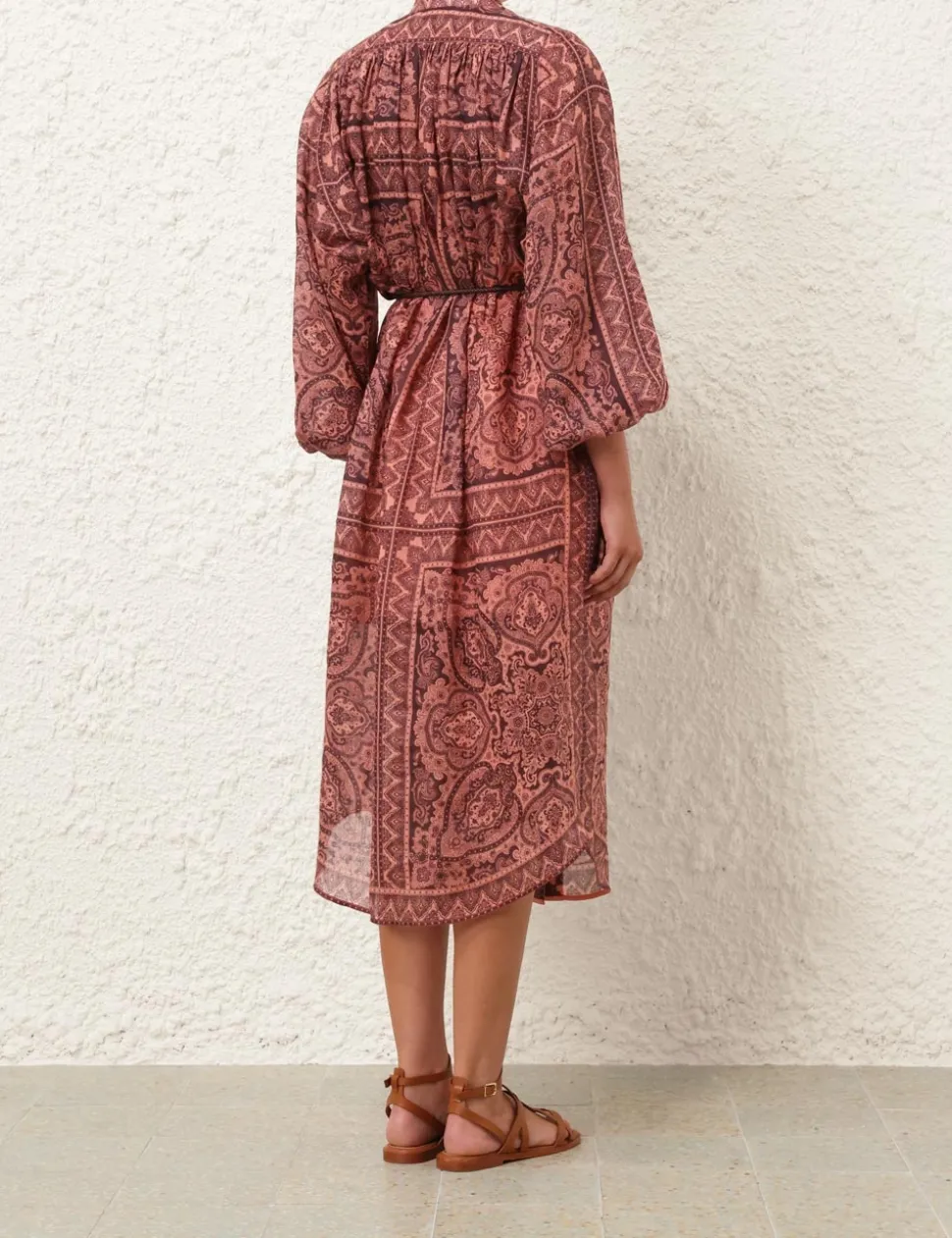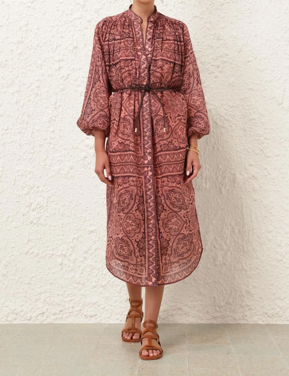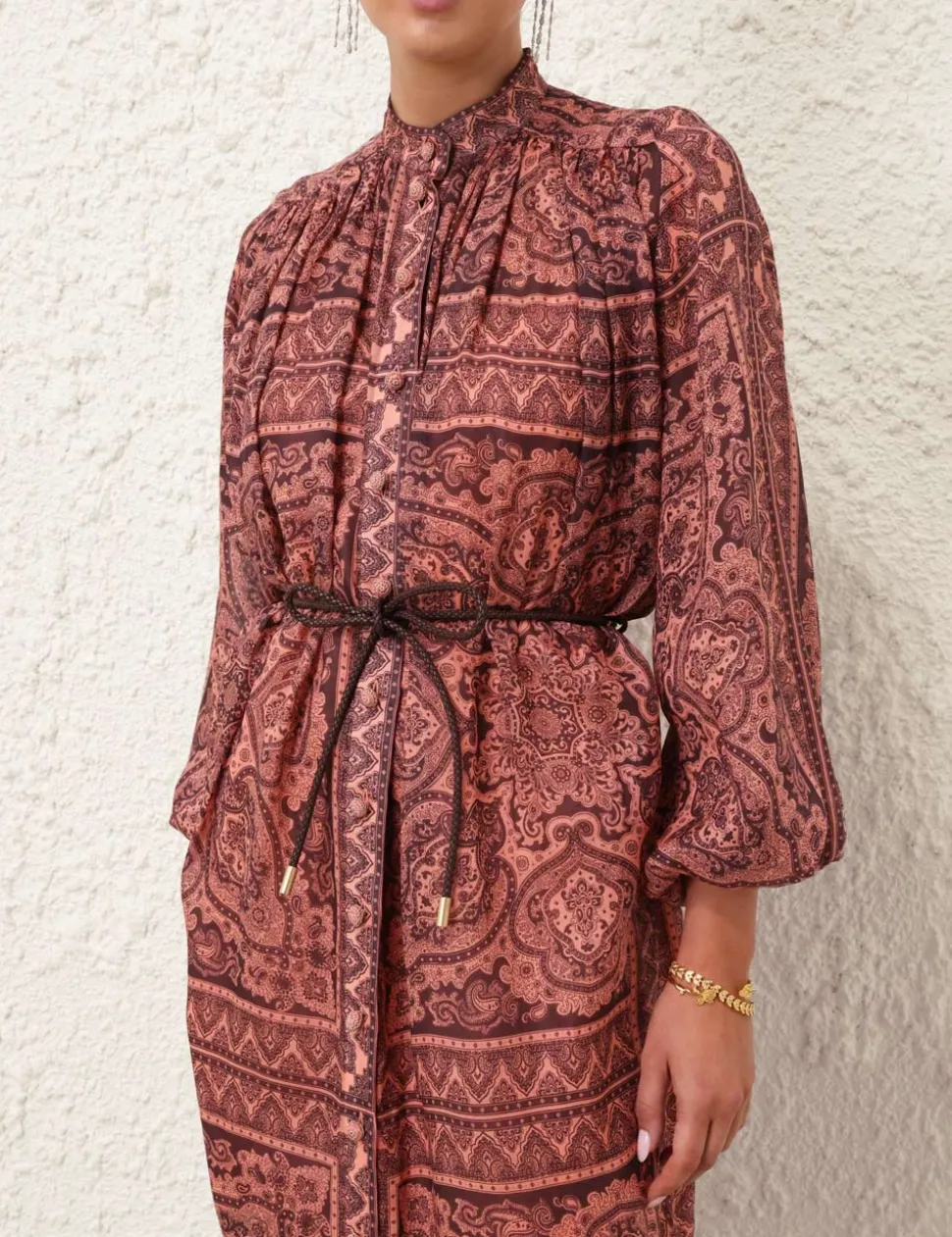 The Ottie Long Sleeve Shirt Dress in Coral Paisley from our Summer Swim 2024 Collection. A ramie long sleeve shirt dress featuring a removable belt and a cowl batwing sleeve.