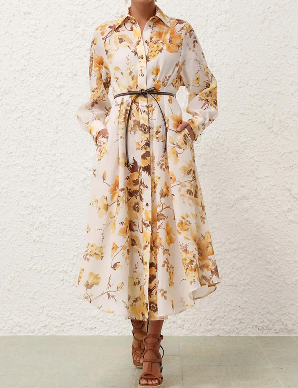 The Ottie Tuck Shirt Dress in Orange Floral from our Summer Swim 2024 Collection. A long sleeve ramie midi dress featuring a contrast stitch leather belt, finished with buttons down the centre front.