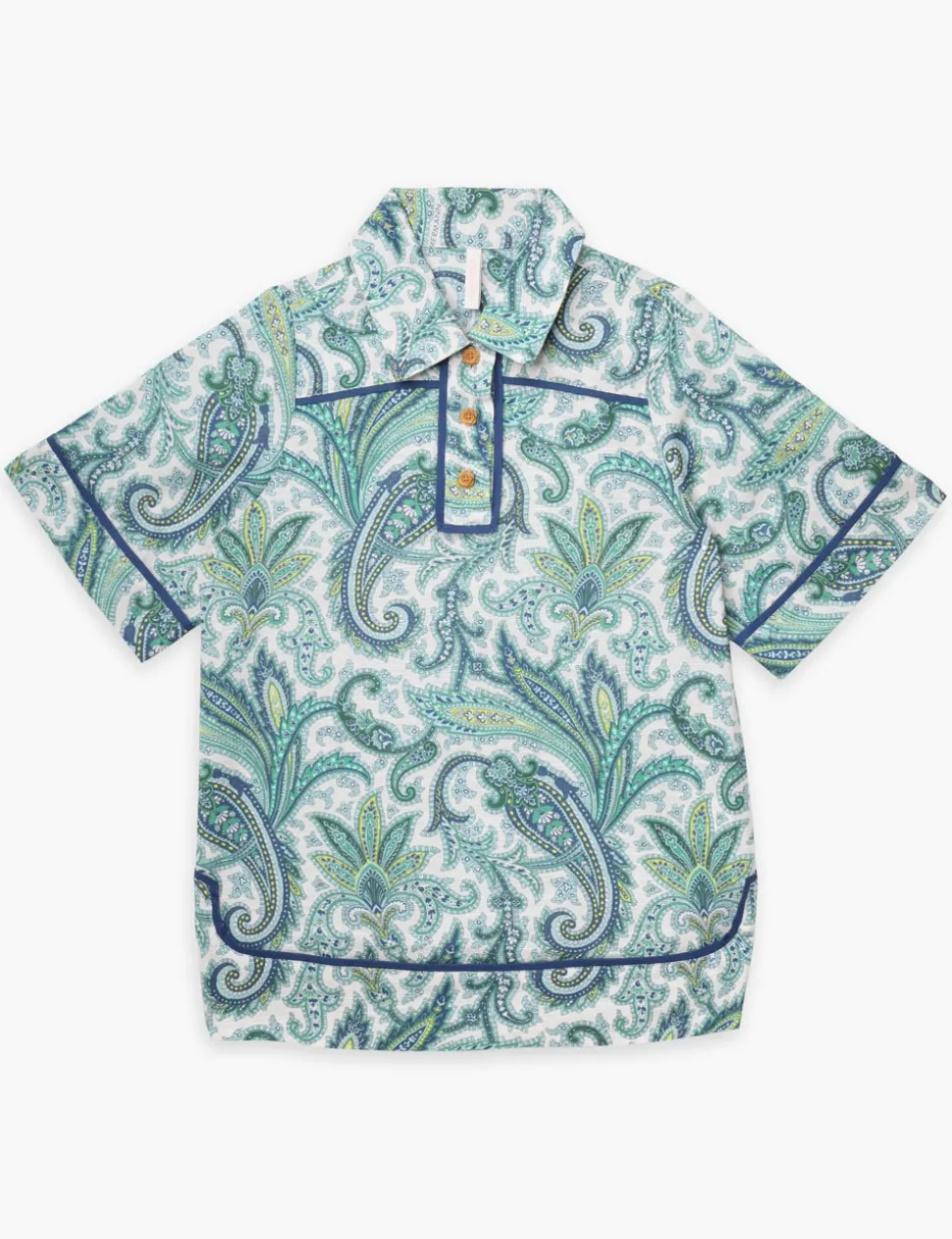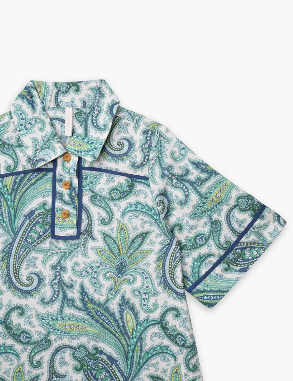 The Ottie Tunic Dress in Green Paisley from our Summer Swim 2024 Collection. A printed kids dress featuring a buttoned down collar and a contrast bind.