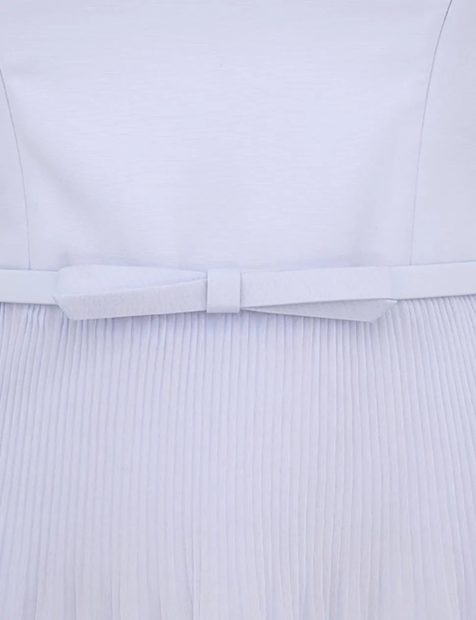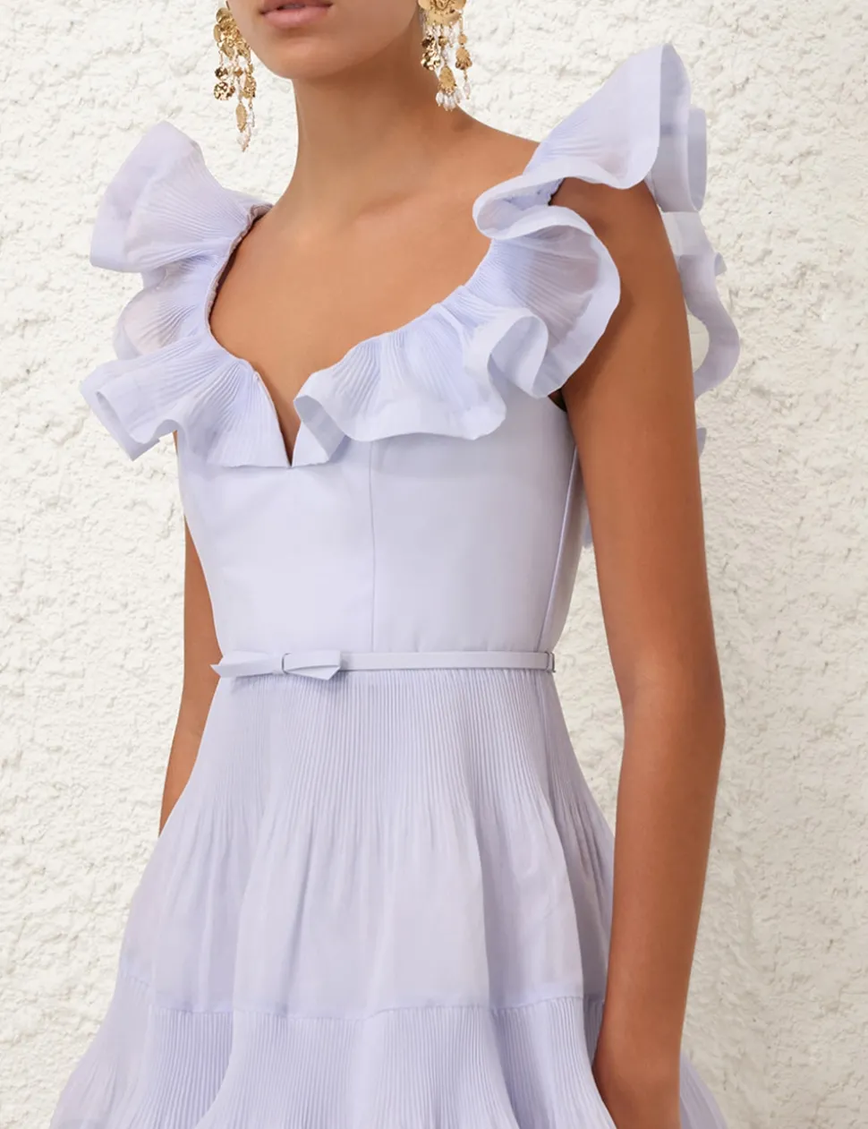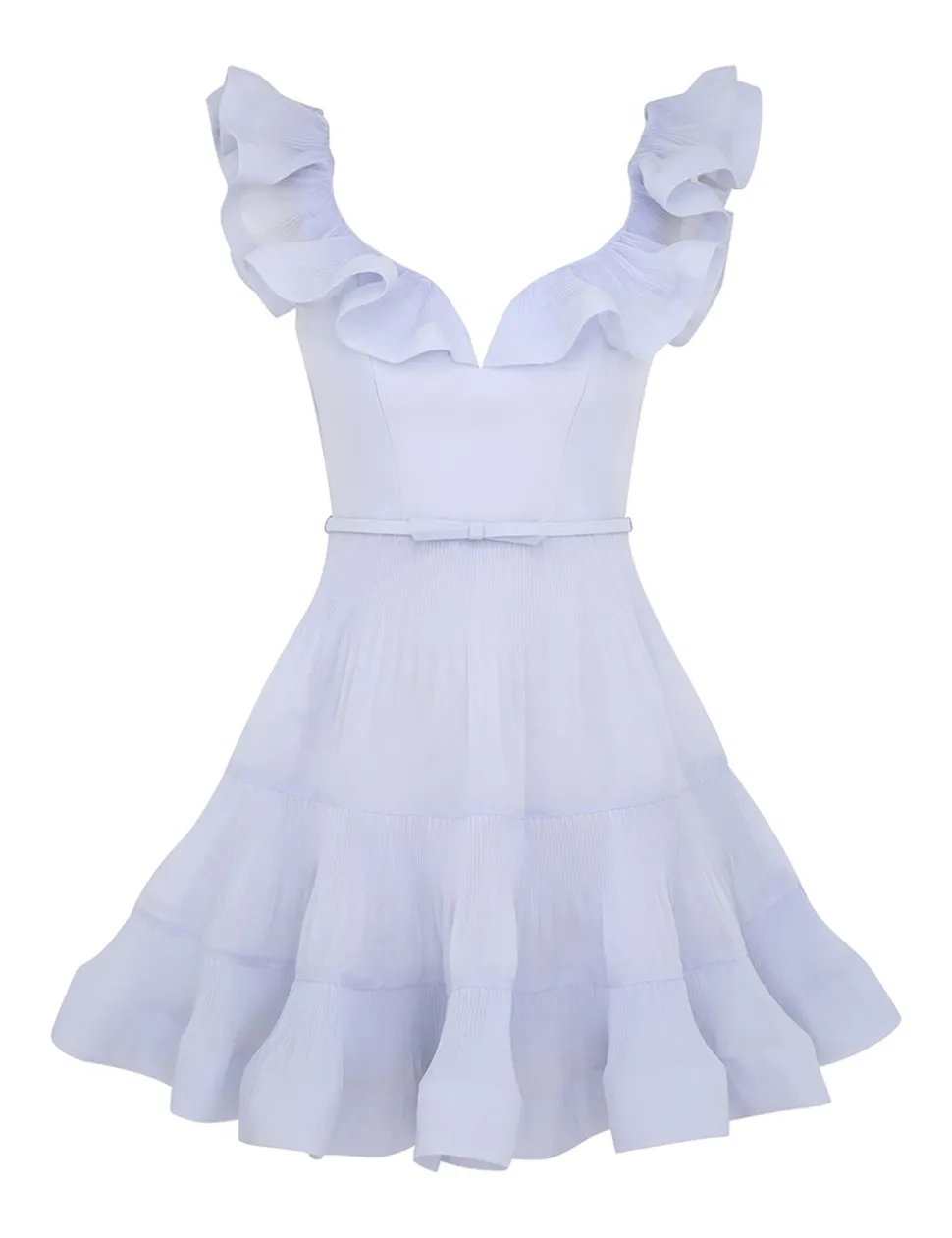 The Pleated Frill Mini Dress in Light Blue from our Resort 2025 Collection, Crush. A short sleeve mini dress featuring a sweetheart neckline with a plunging V-wire, frills on the shoulders and a removable bow belt; finished with pleated skirt tiers.