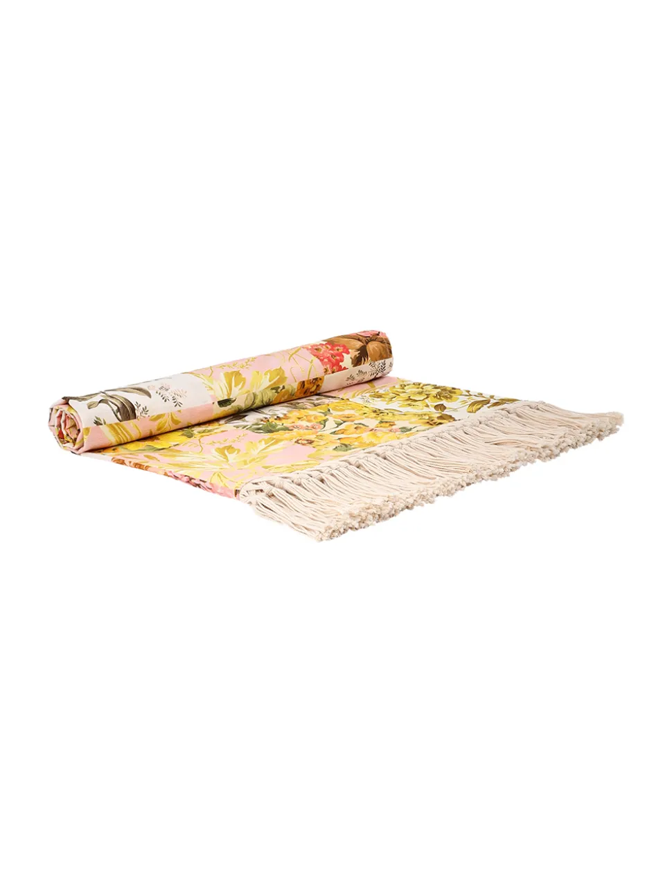 The Printed Cotton Towel in Patch Floral from our Summer Swim 2024 Collection. A large textured beach towel featuring a placement print and cotton tassel trims.