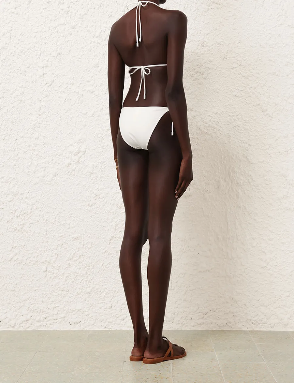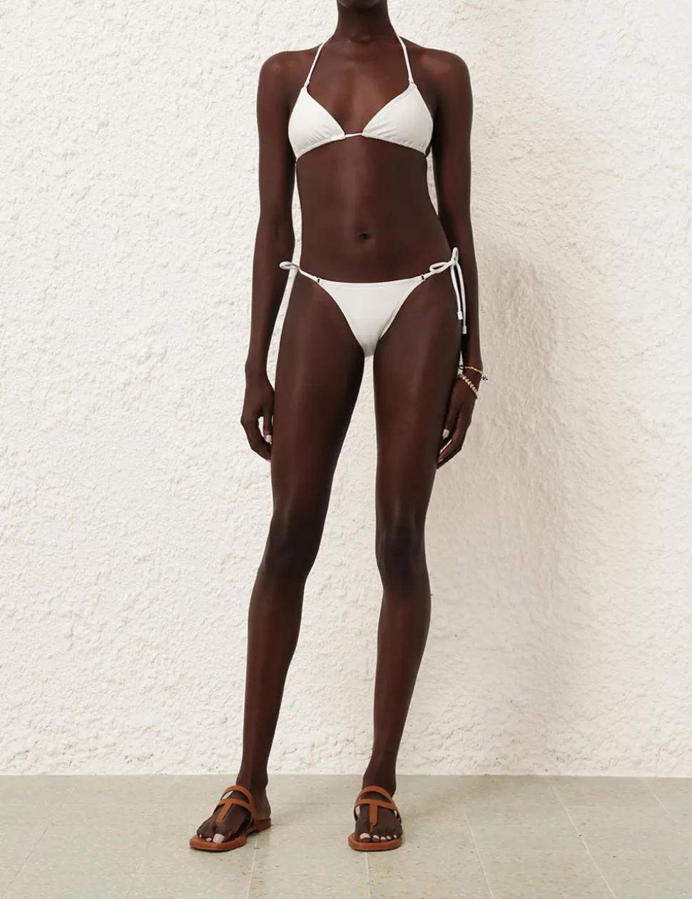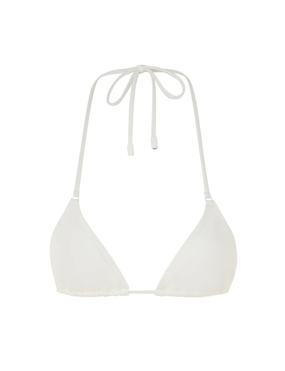 The Separates Mini Tri in Ivory from our Summer Swim 2024 Collection. A triangle bikini top constructed from form-fitting Italian lycra featuring fully adjustable neck and under bust ties finished with toggle ends.