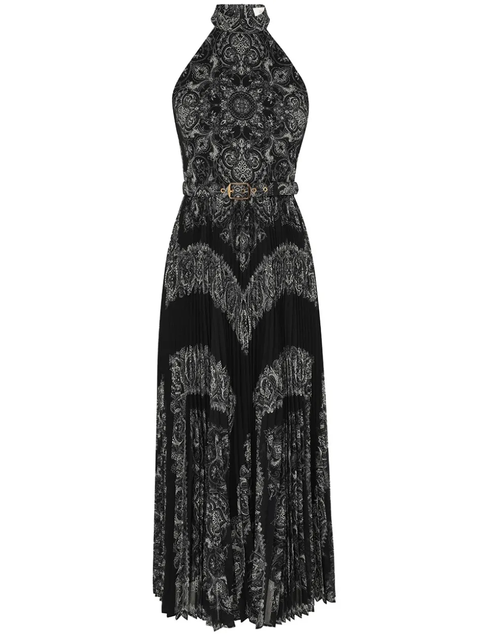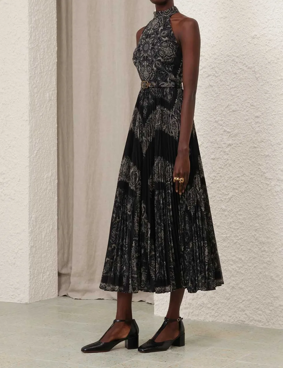 The Sunray Halter Picnic Dress in Black Paisley from our Fall 2024 Collection, In Illustration. A high neck midi dress featuring a pleated skirt and belted waist.