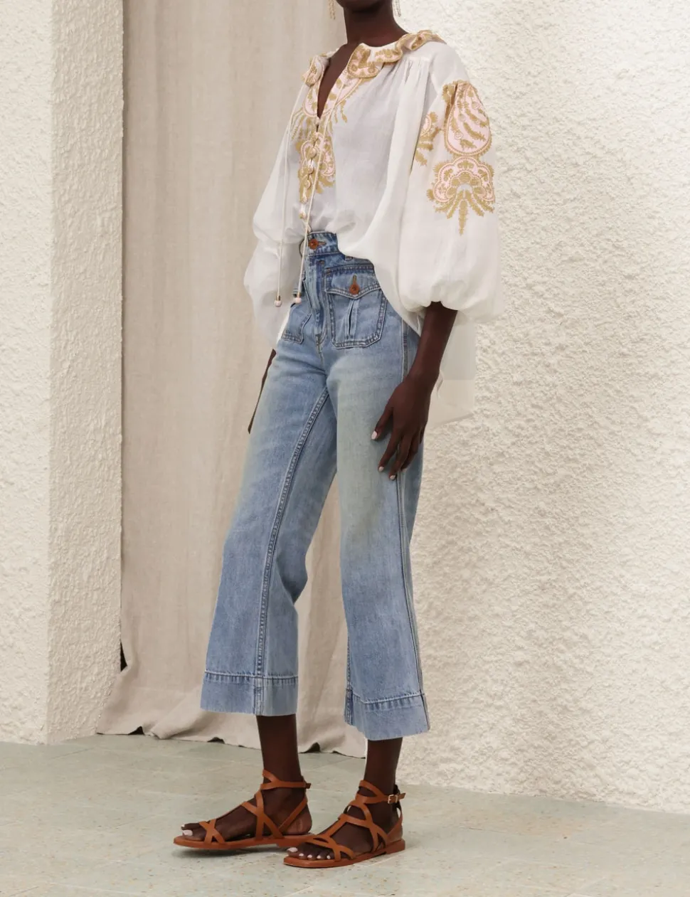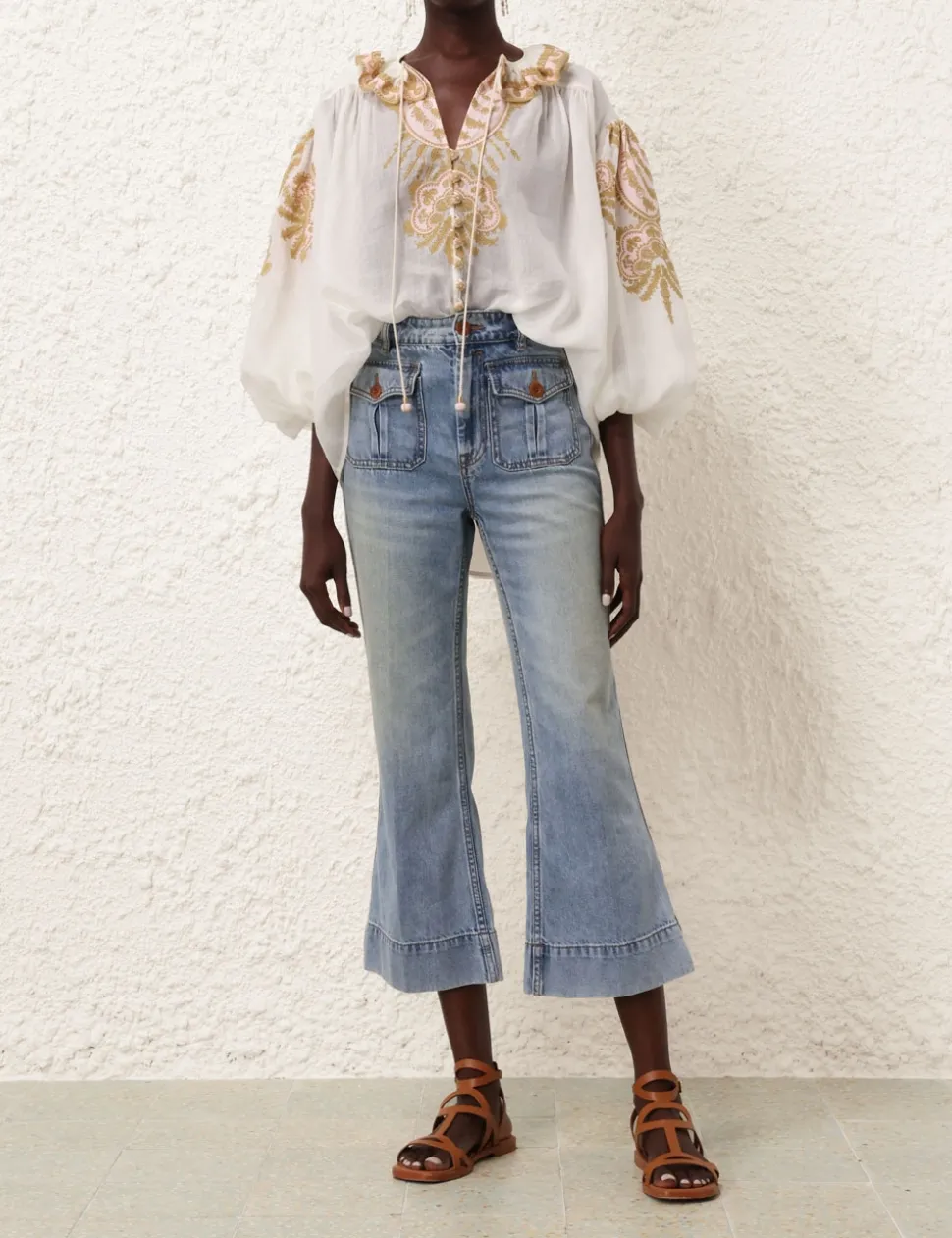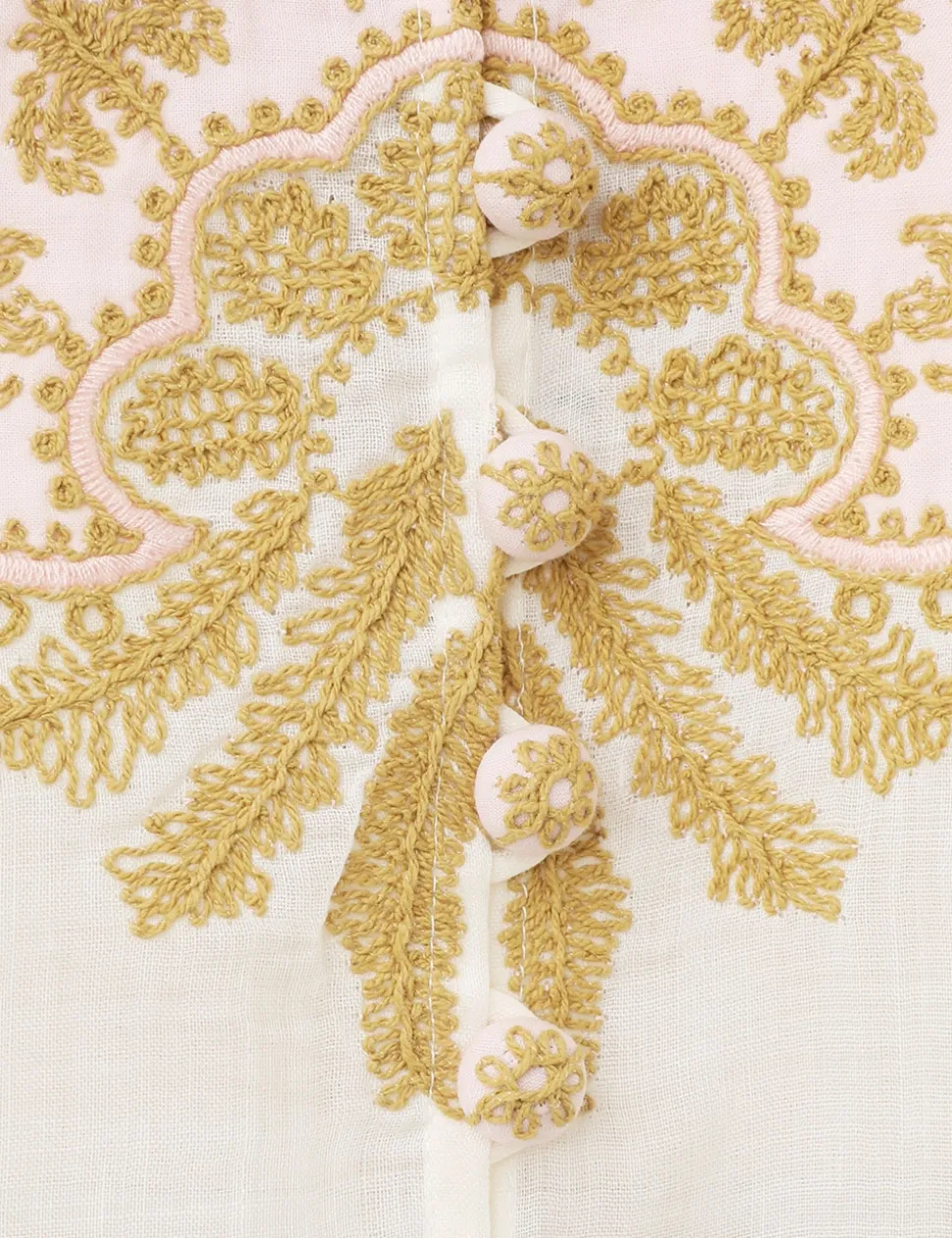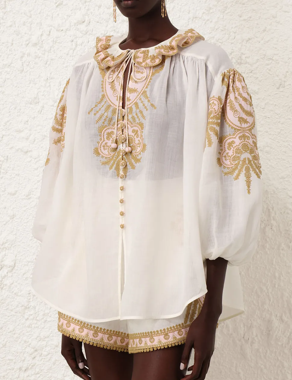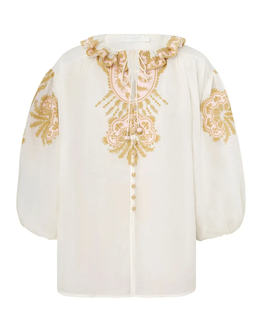 The Waverly Embroidered Top in Cream/Gold from our Summer Swim 2024 Collection. A ramie embroidered top featuring blouson sleeves and frills around neckline with ties, finished with buttons down the centre front.