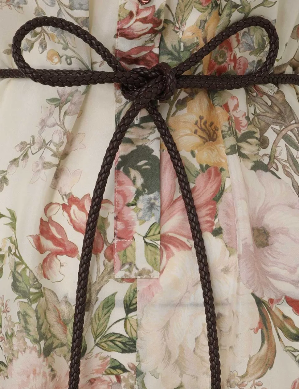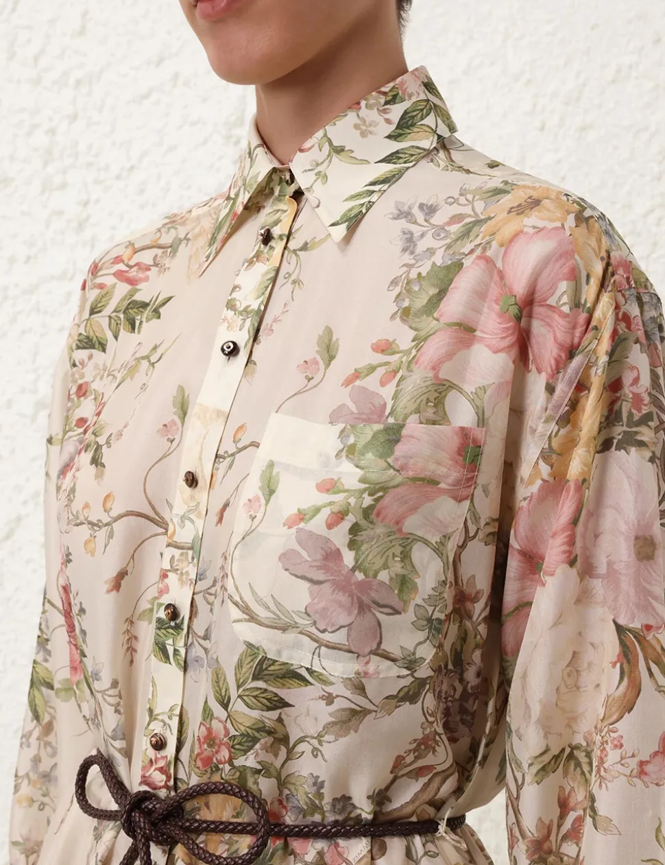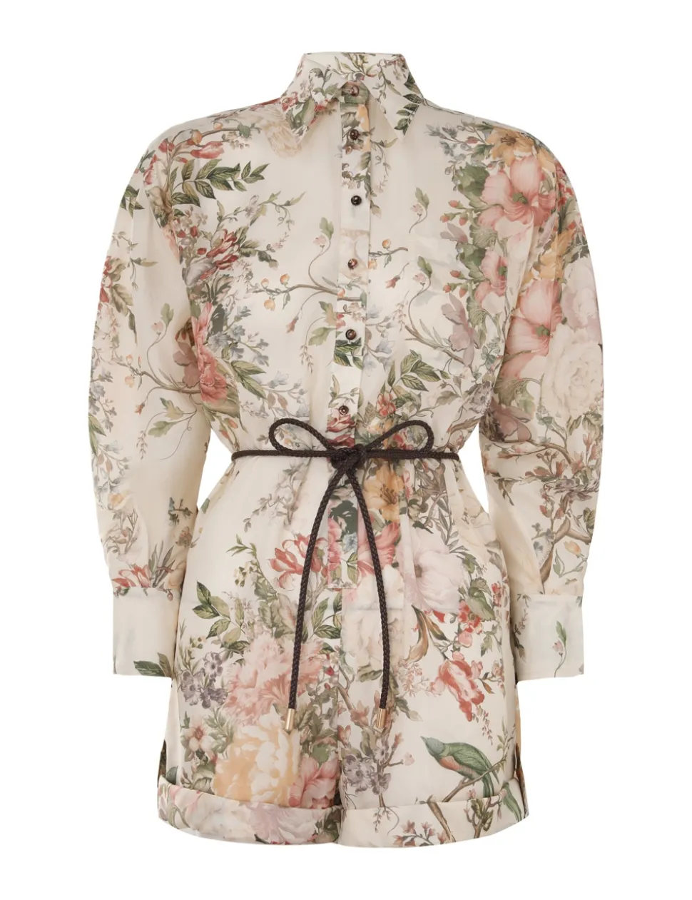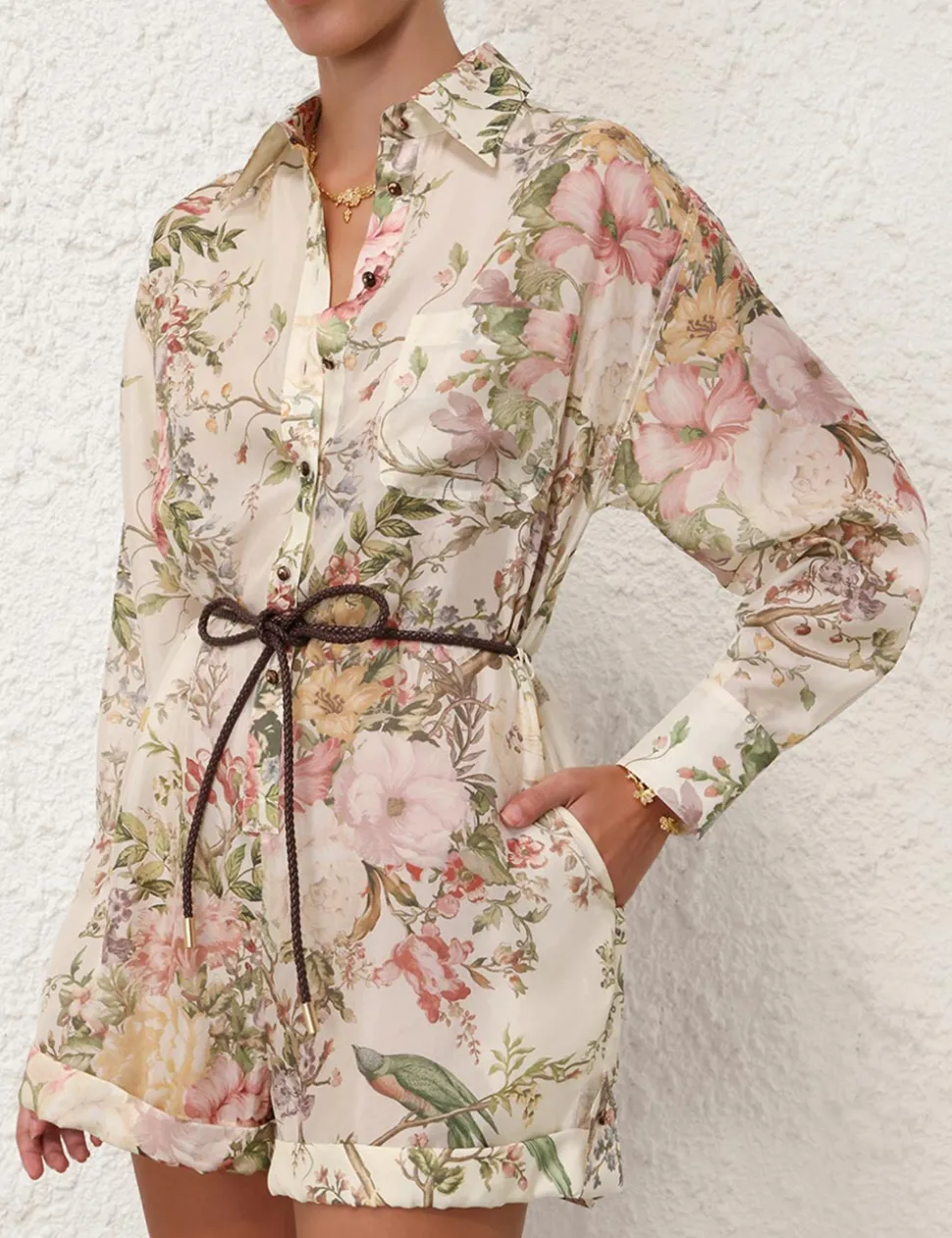 The Waverly Shirt Playsuit in Cream Floral from our Summer Swim 2024 Collection. A long sleeve silk playsuit featuring a self tie leather belt, front chest pocket, finished with buttons down the centre front.