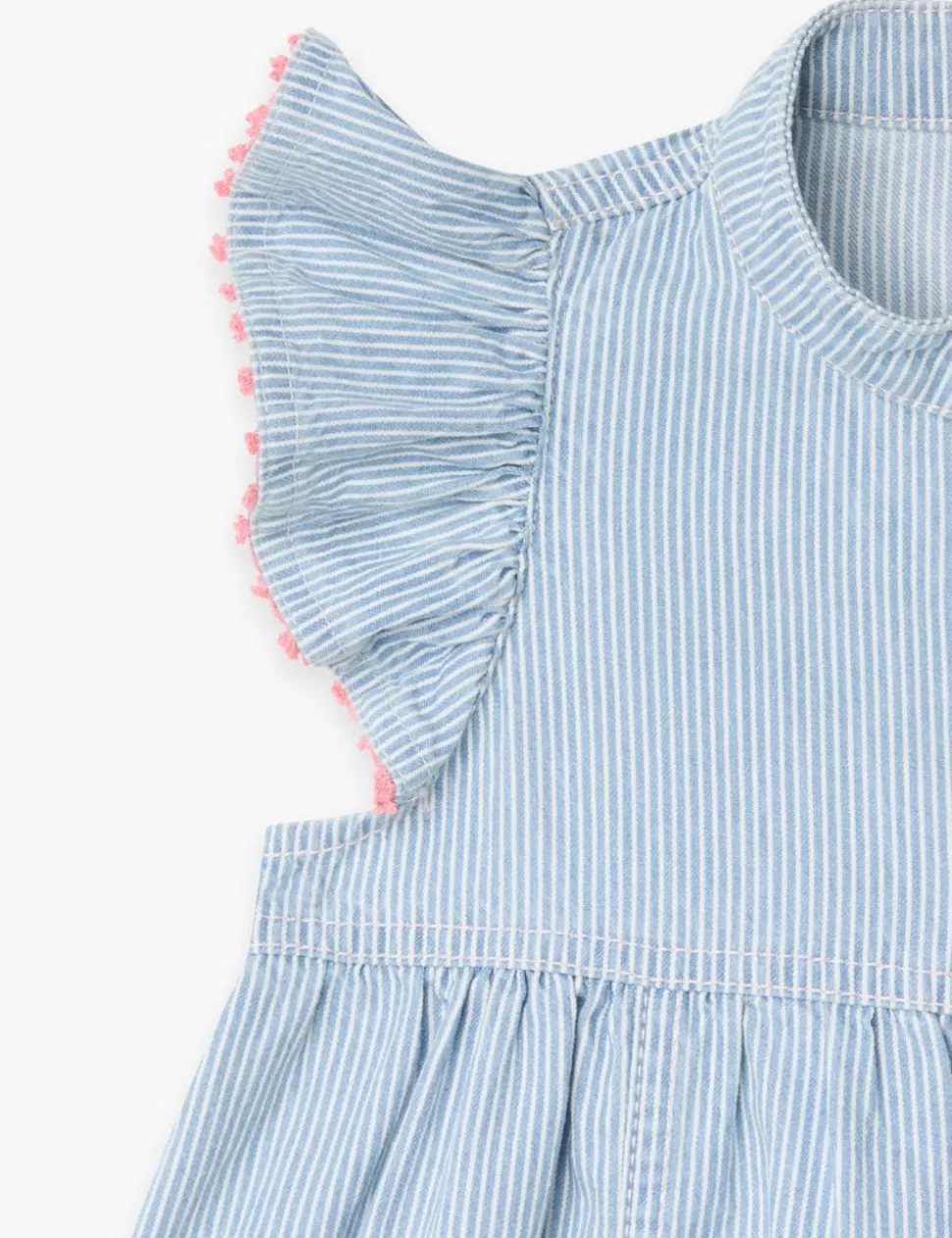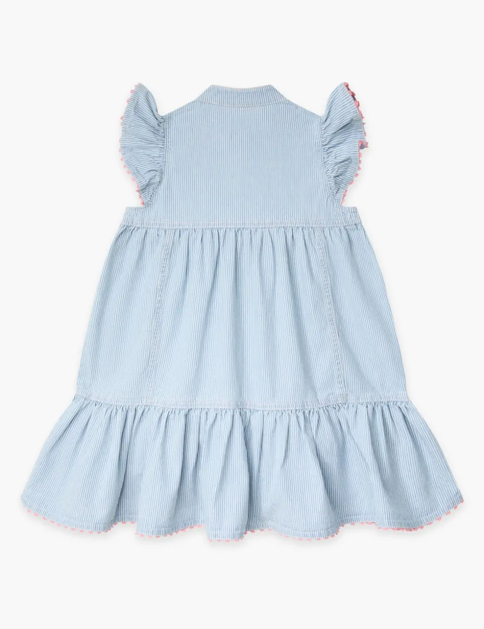 The Wylie Denim Flutter Dress in Ticking Stripe from our Resort Swim 2025 Kids Collection. A cotton dress featuring flutter sleeves and a stand collar with buttons down the centre front.