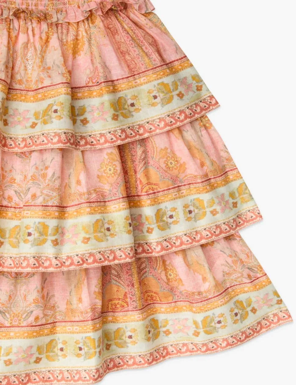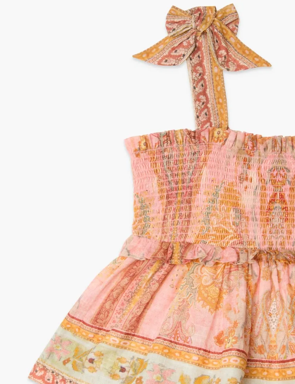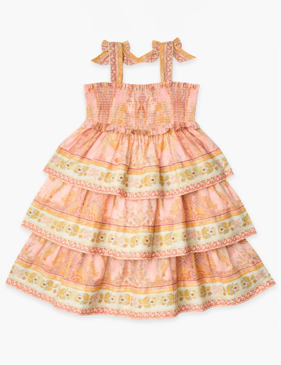 The Wylie Tiered Shirred Dress in Pink Multi from our Resort Swim 2025 Kids Collection. A cotton dress with a shirred bodice, fixed shoulder bows and tiered ruffle skirt.
