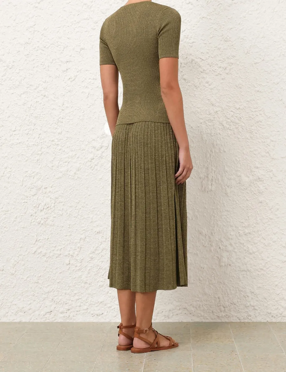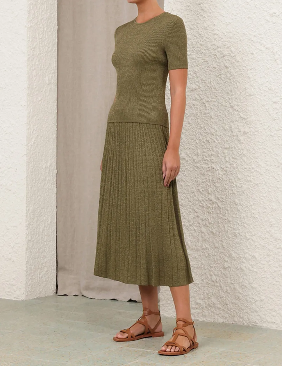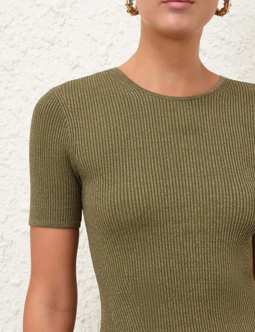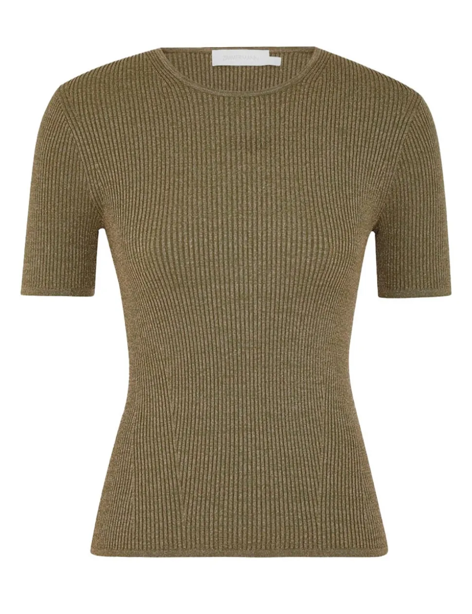 The Wylie Rib T-Shirt in Dusty Olive/Gold from our Resort Swim 2025 Collection. A slim fit knit tee featuring short sleeves and ribbing throughout.