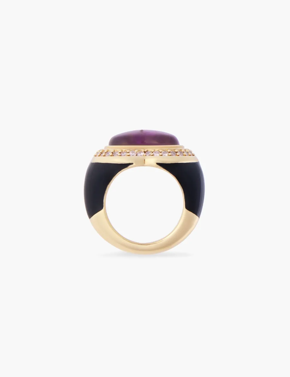 The Zimmermann Adore Ring in Gold from our Resort 2025 Collection, Crush. A gold plated ring featuring a statement heart shape detailing with custom cut purple amethyst stone in the centre.