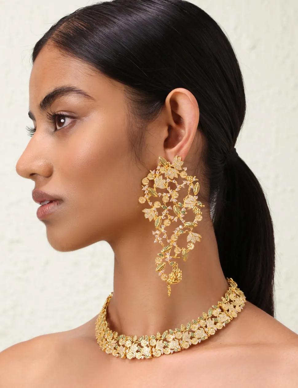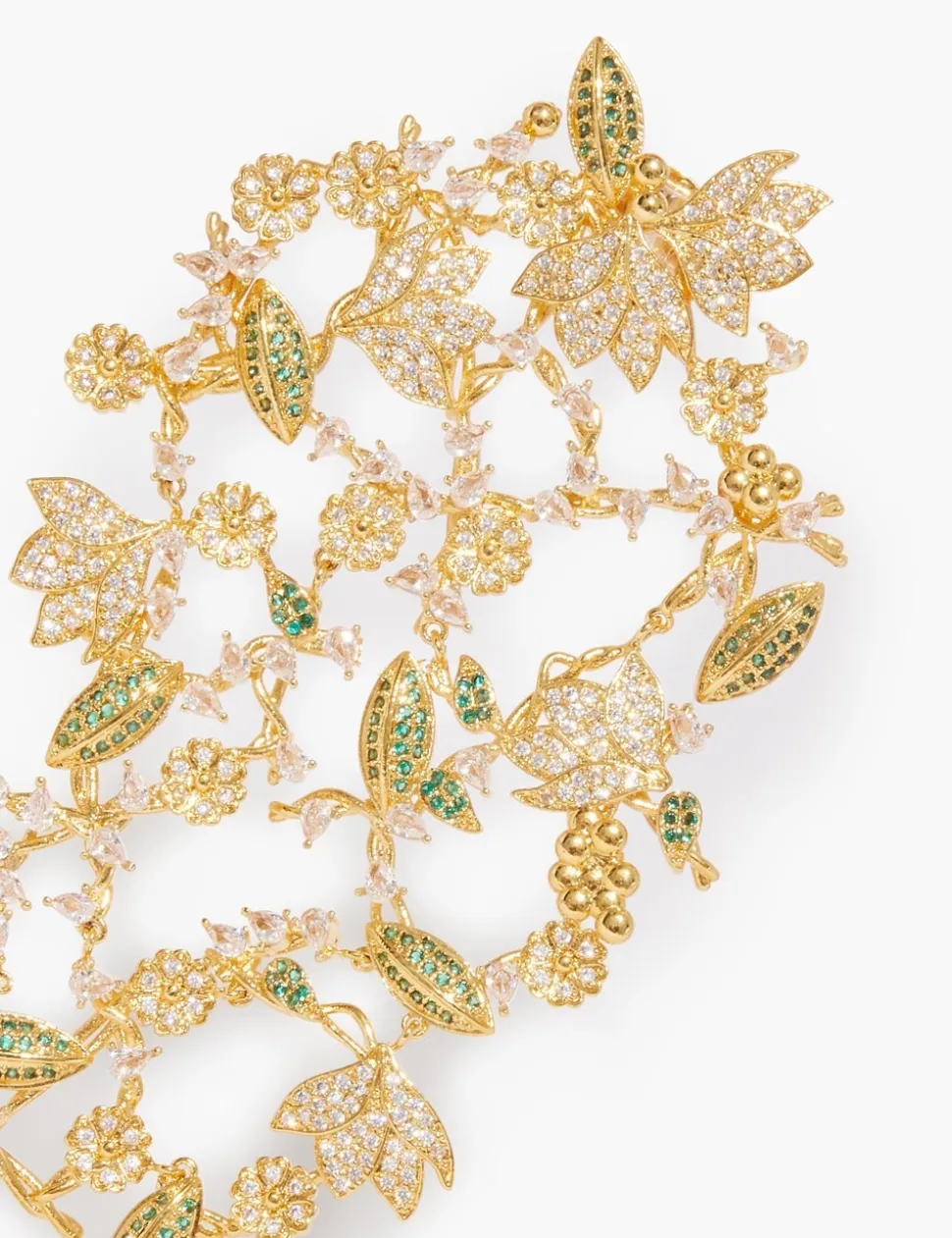 The Zimmermann Bloom Drop Earring in Gold/Green from our Spring 2024 Collection, Natura. A gold plated earring featuring green and white cubic zirconia stones throughout.