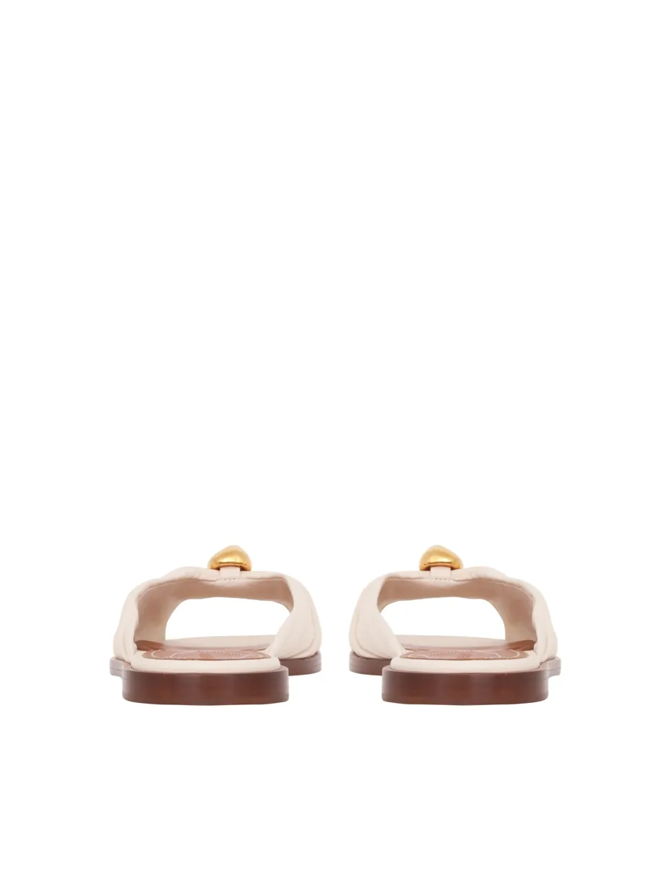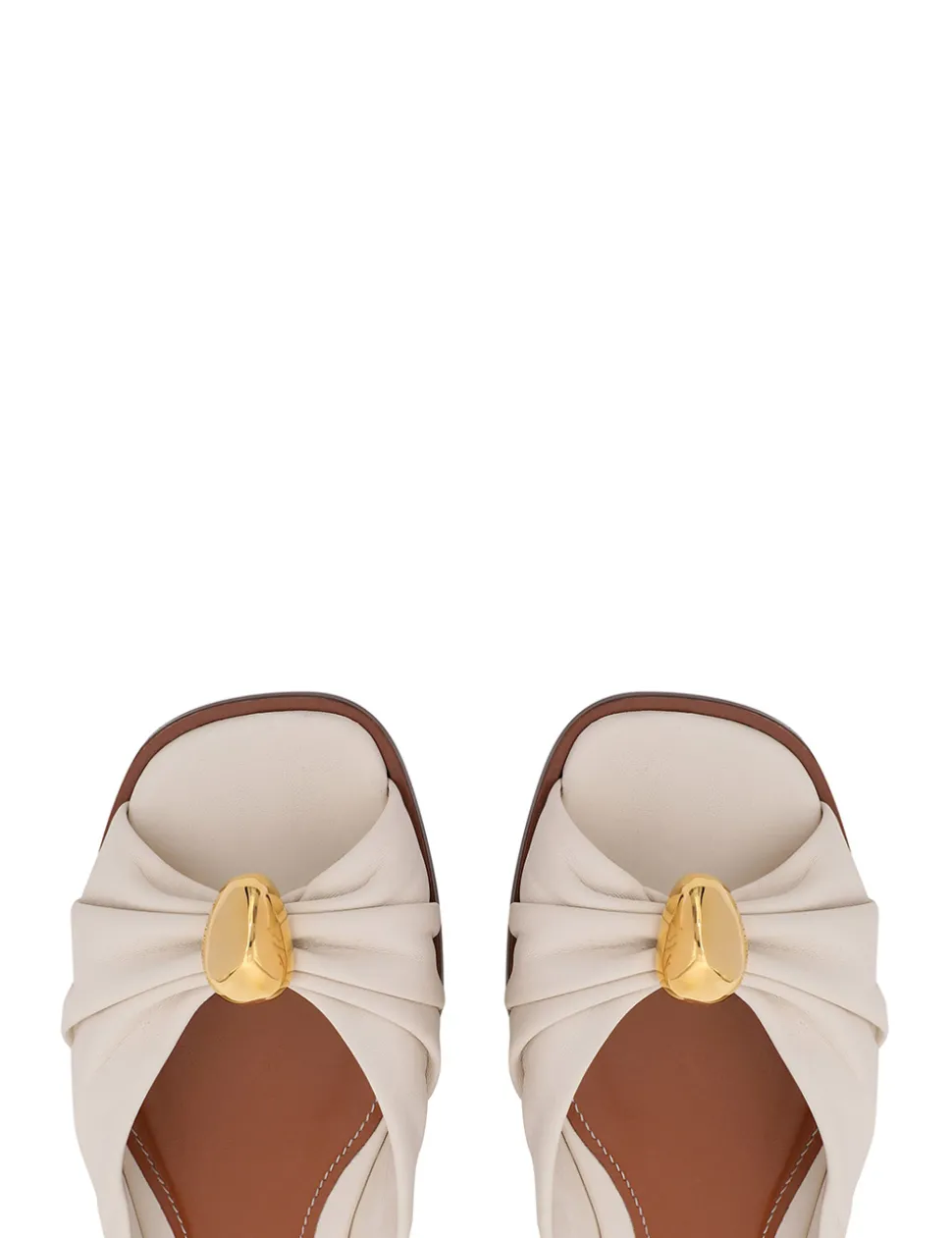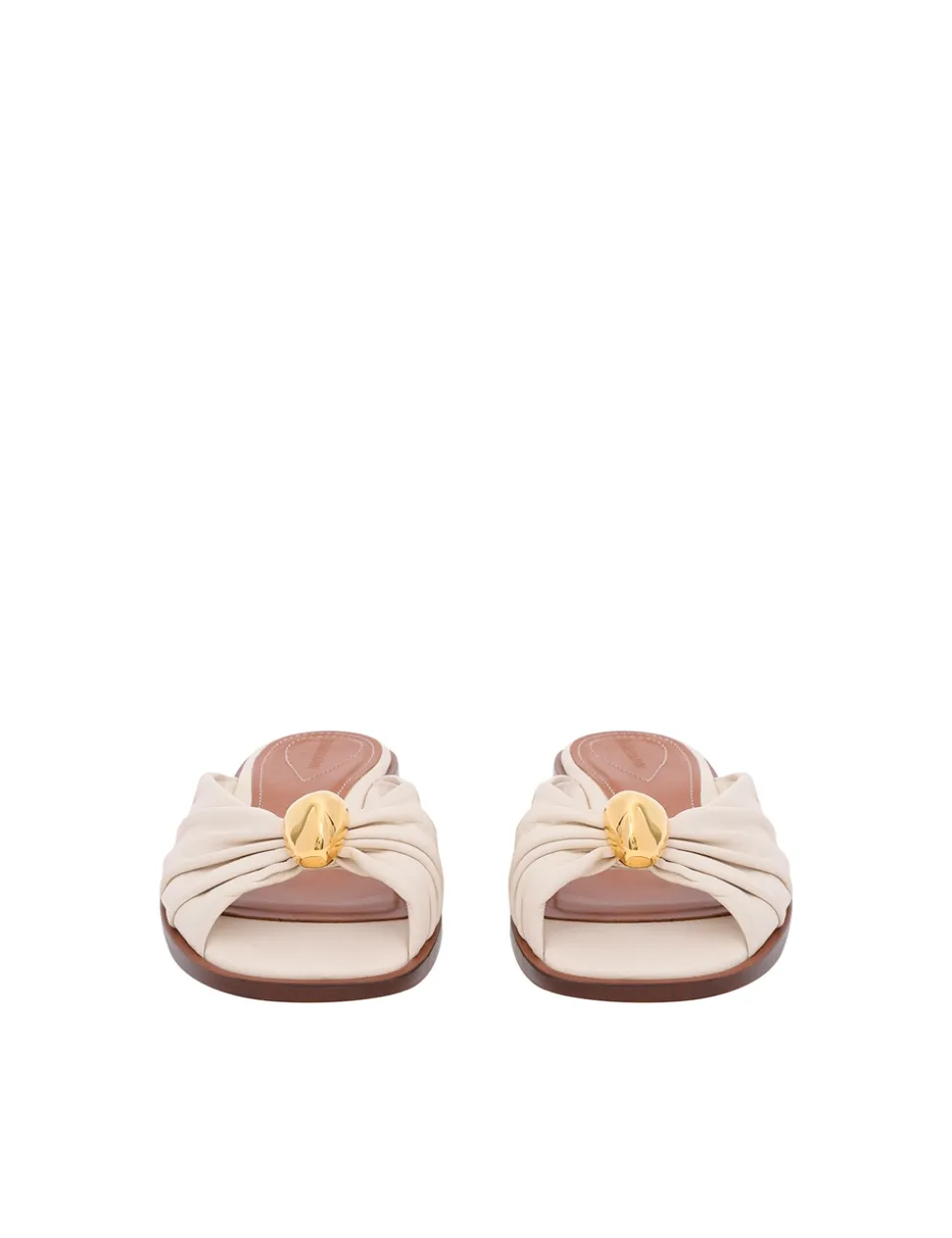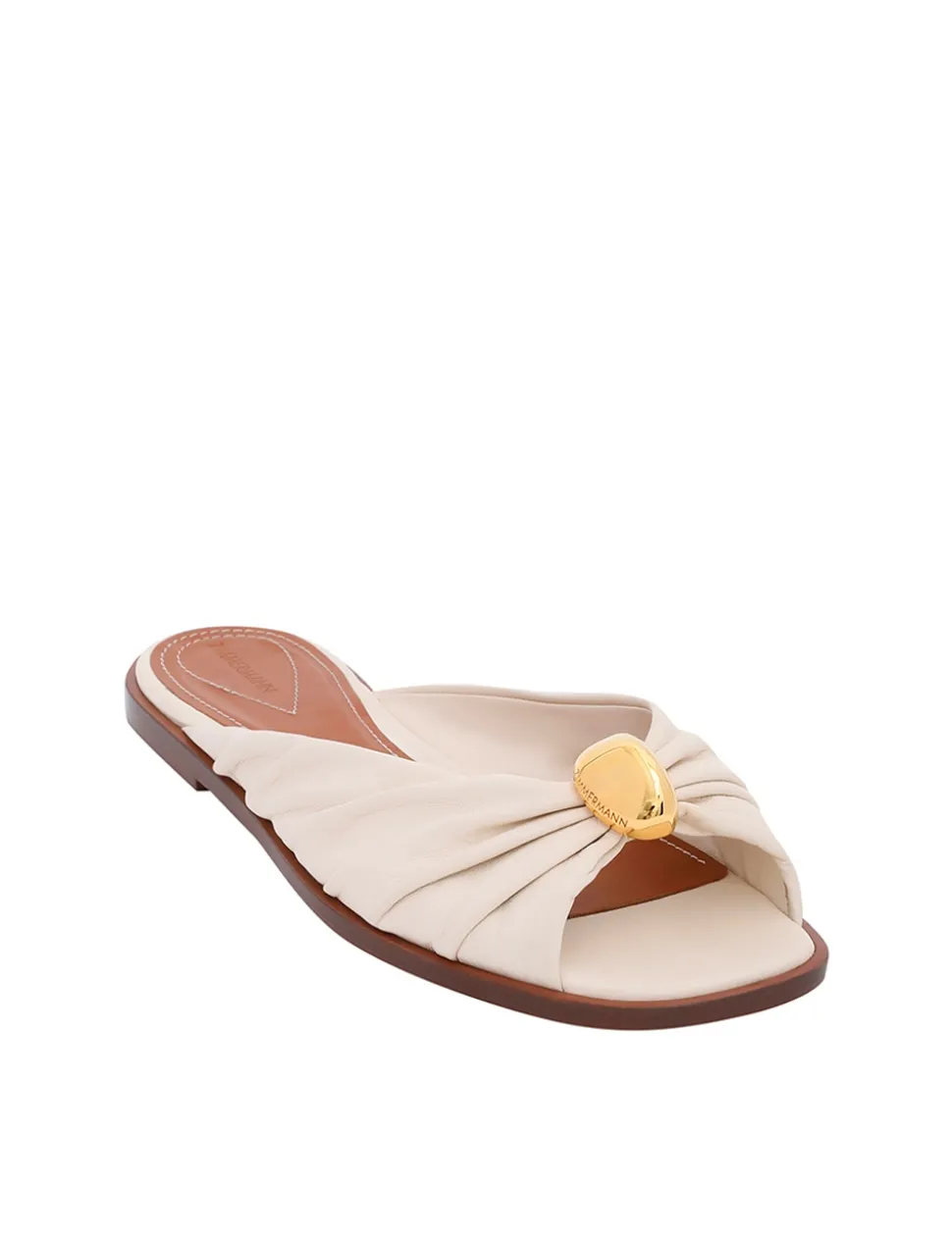 The Zimmermann Gleam Slide in Vanilla from our Resort Swim 2025 Collection. A leather slide sandal featuring heavy gathering at the front shoe with a statement pebble hardware design.